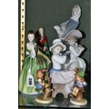 A GROUP OF LLADRO AND ROYAL DOULTON FIGURINES, comprising Royal Doulton 'Fleur' HN2368 (marked as second quality), Paragon 'Lady Camille', Lladro 4584 'Girl Holding Lamb', a Lladro Nao 1345 ' Girl With a Bird' and 'Girl Holding A Puppy', a Lladro goose, together with two small West German Goebel figures 'Apple Tree Girl' and 'Apple Tree Boy' (8) (Condition report: Apple Tree Girl has crazing to the base, no obvious damage, dusty)