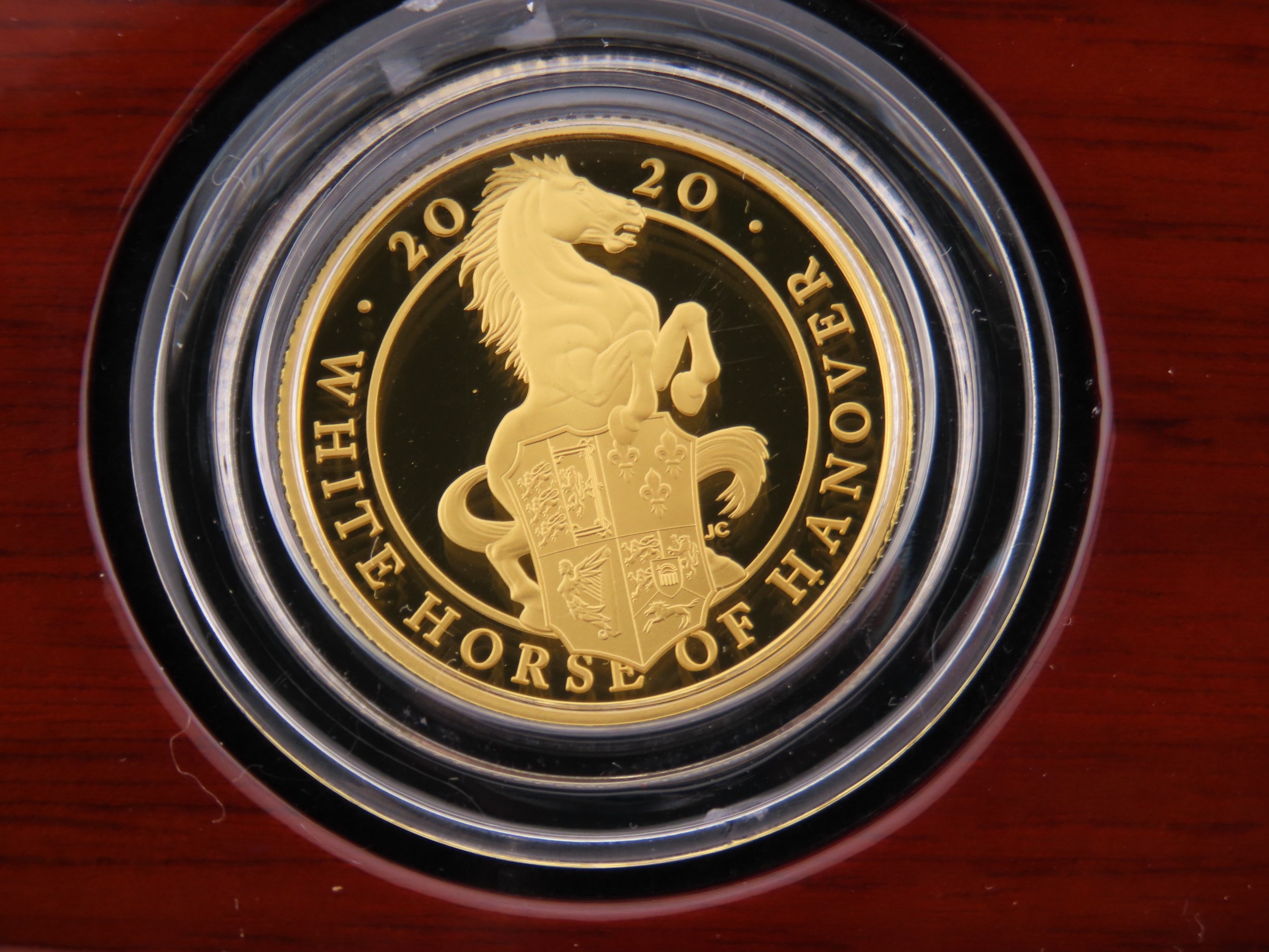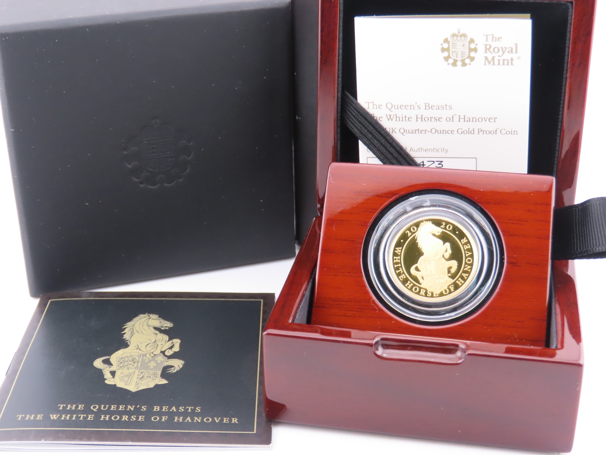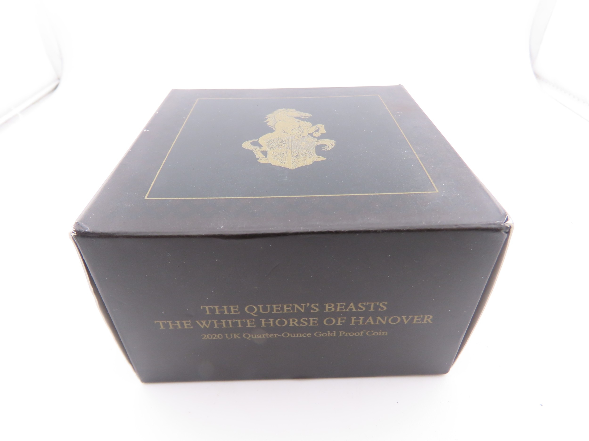 A 2020 United Kingdom quarter ounce gold proof coin from The Queen?s Beasts series, the White Horse of Hanover. Struck in 999.9 fine gold with a weight of approximately 7.80 grams and a diameter of 22 millimetres. The obverse and reverse designs are by Jody Clark, with the reverse depicting the White Horse of Hanover in bold relief. Proof finish. Issued in a limited edition of 1,000 and presented in the original Royal Mint wooden presentation case with certificate of authenticity.