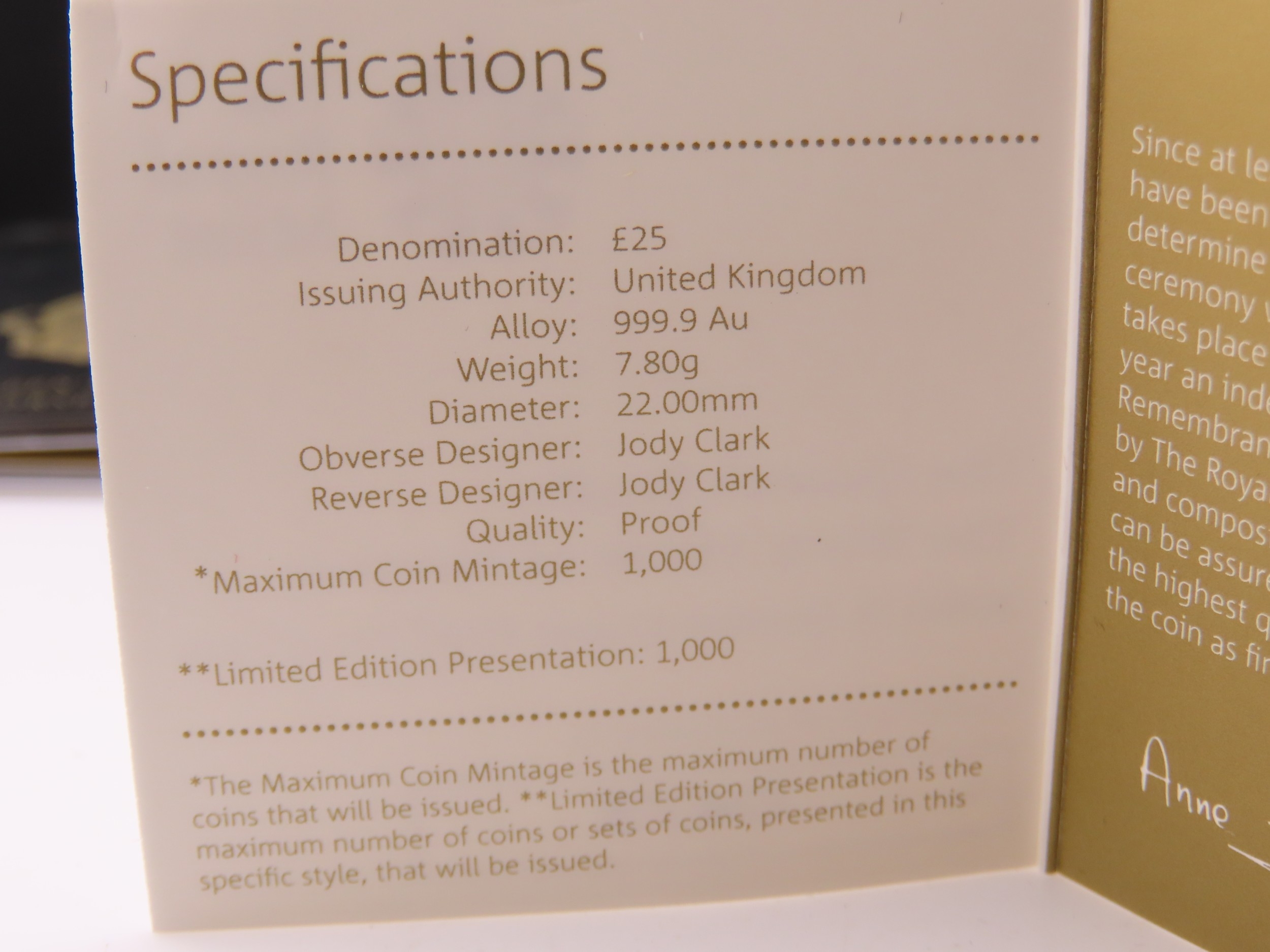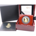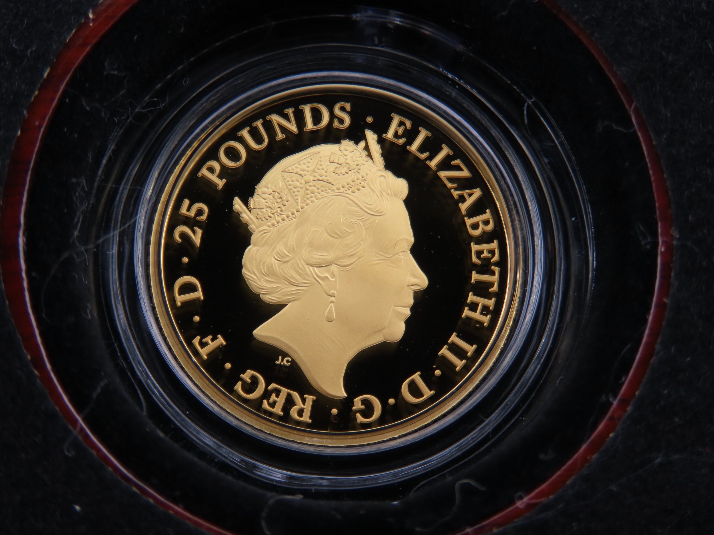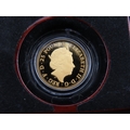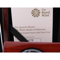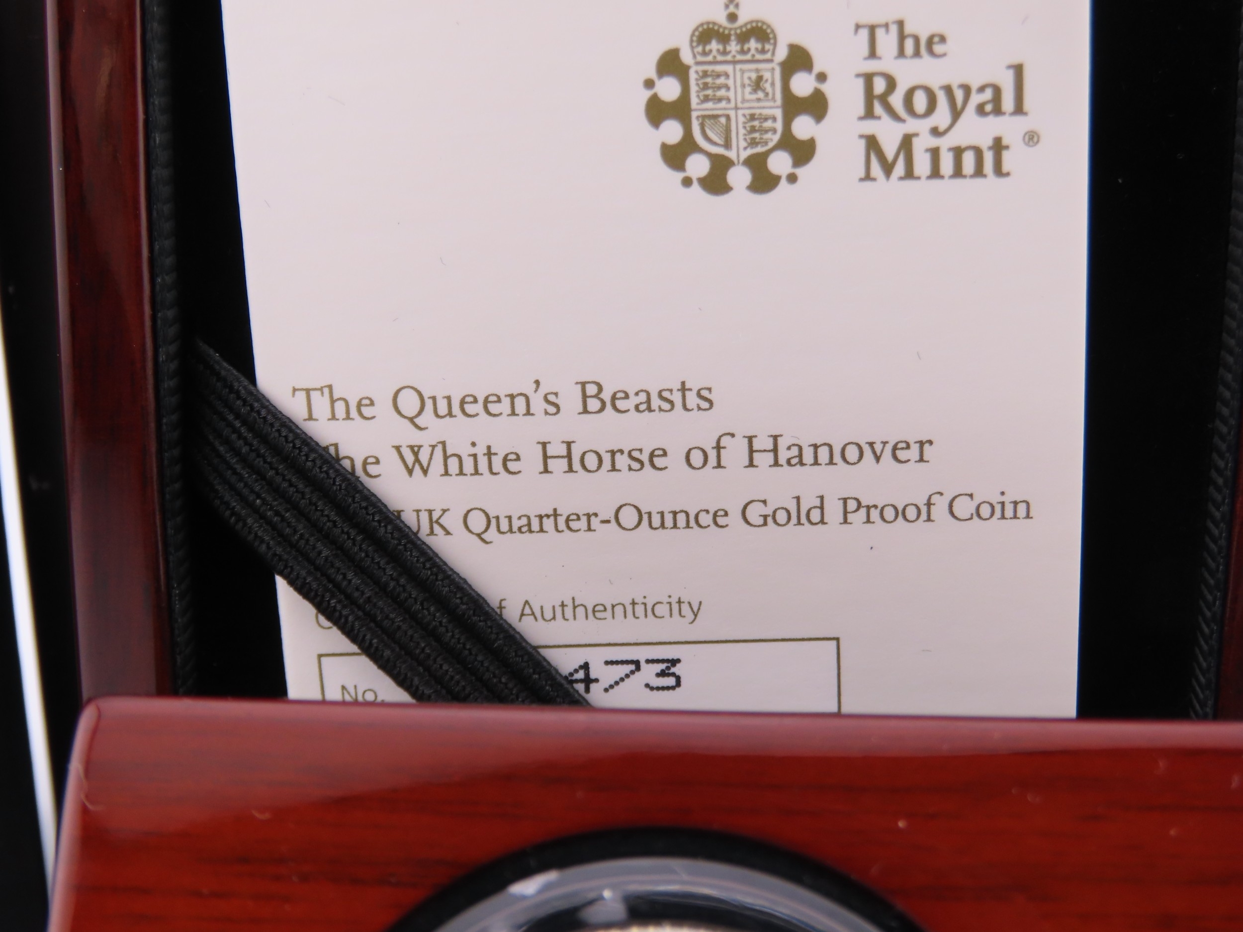 A 2020 United Kingdom quarter ounce gold proof coin from The Queen?s Beasts series, the White Horse of Hanover. Struck in 999.9 fine gold with a weight of approximately 7.80 grams and a diameter of 22 millimetres. The obverse and reverse designs are by Jody Clark, with the reverse depicting the White Horse of Hanover in bold relief. Proof finish. Issued in a limited edition of 1,000 and presented in the original Royal Mint wooden presentation case with certificate of authenticity.