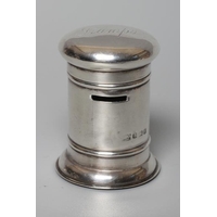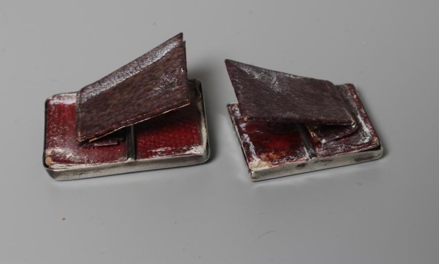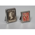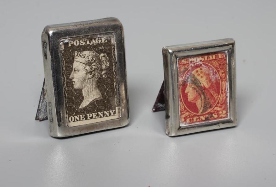 OF PHILATELIC INTEREST - A LATE VICTORIAN SILVER STAMP FRAME by Gourdal Vales & Co., Birmingham 1899, containing a Penny Red, 1" high, together with a slightly larger frame by Sampson Mordan, Birmingham 1900, containing a Penny Black, 1 1/4" high, both with leather easel backs (2) (Illustrated)