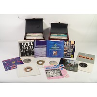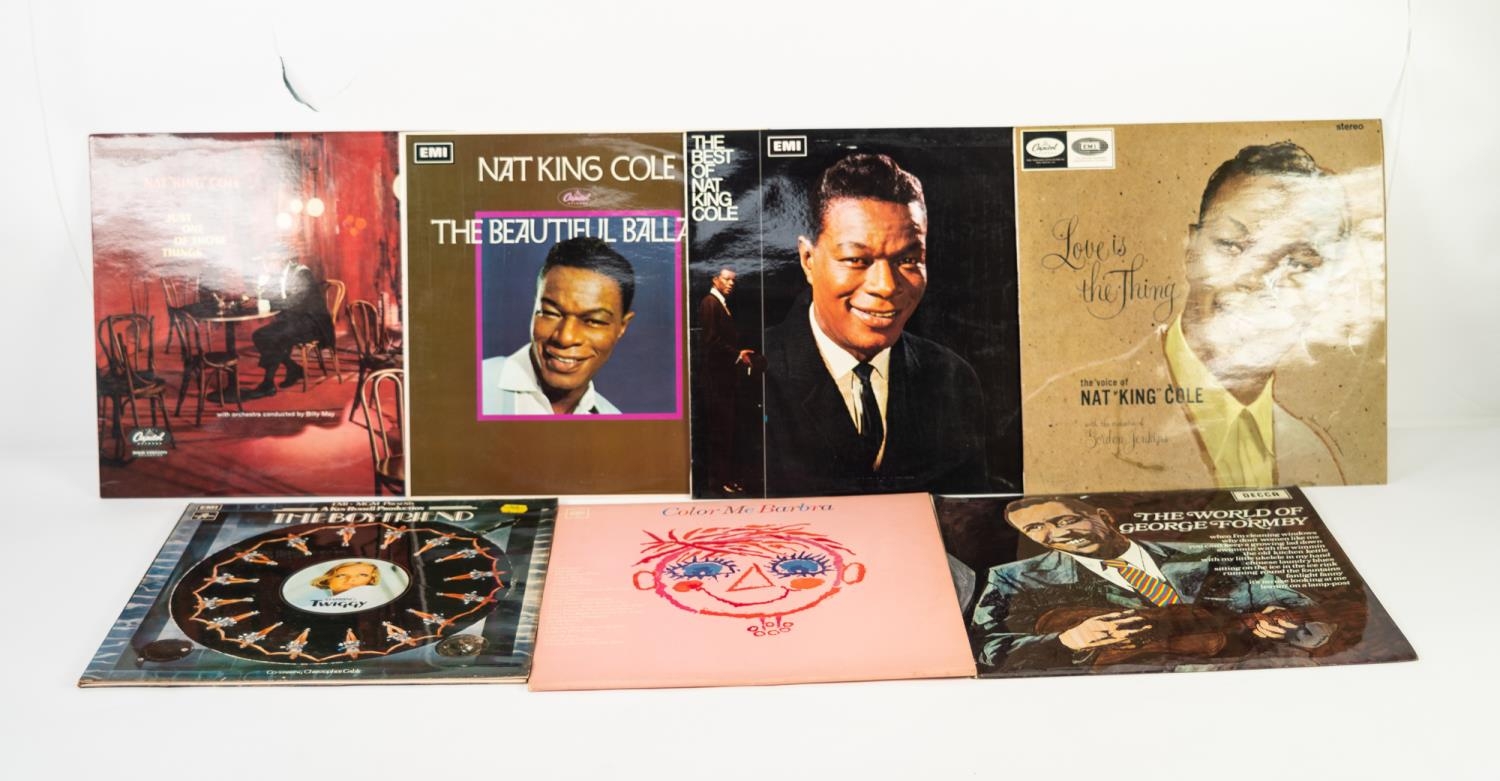 FOUR EMI VINYL 33 1/3 RPM LP RECORDS, Nat King Cole and three others including The Boyfried with Twiggy and a GOOD SELECTION OF, MAINLY PICTORIAL, SHEET MUSIC from Bing Crosby to Abba (contents of a large shallow box)