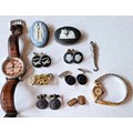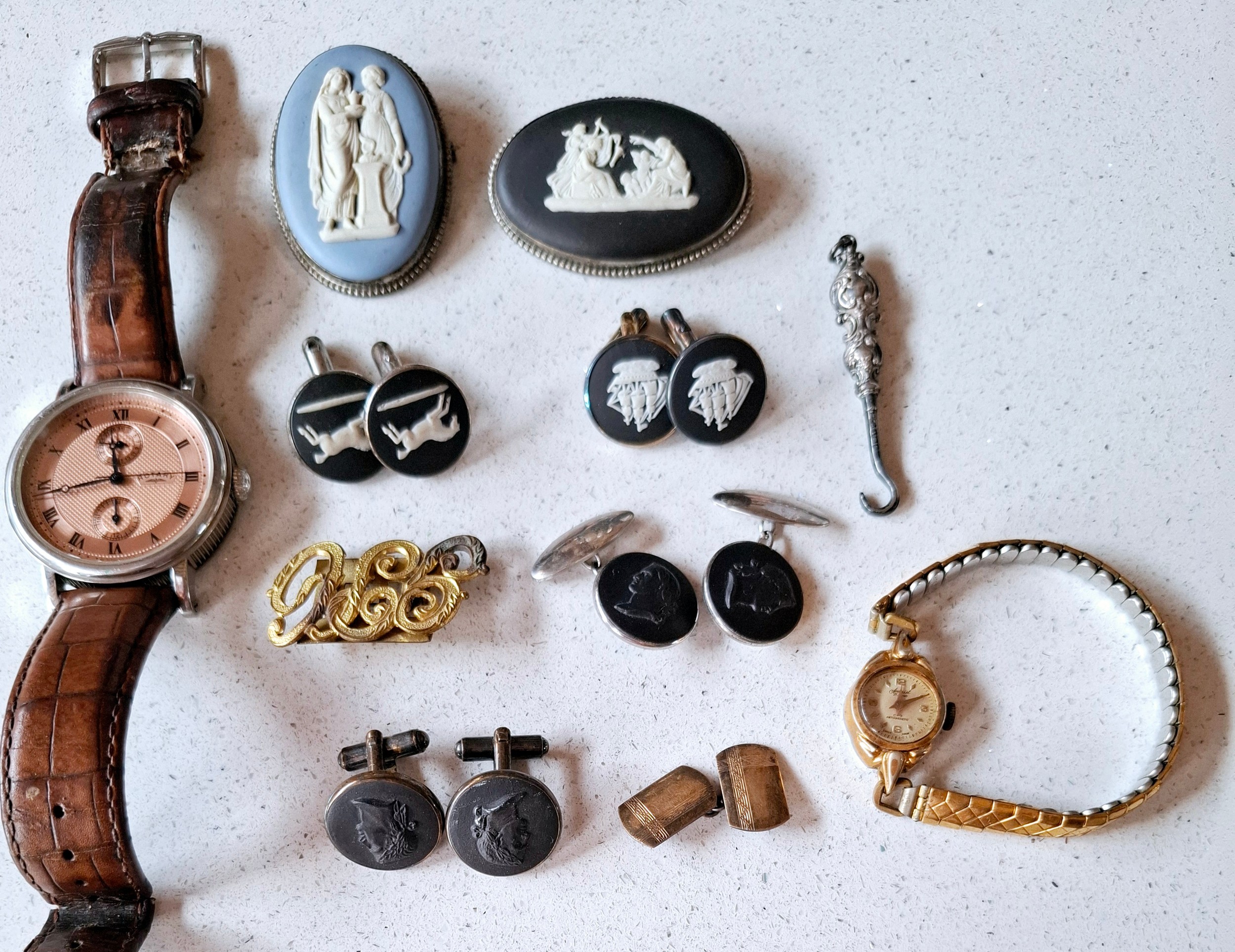 A small group of Wedgwood Jasper ware jewellery to include cufflinks and brooches together with collectables to include a modern gents Rotary watch (strap A/F), a single 9ct gold cufflink and a small silver chatelaine button hook