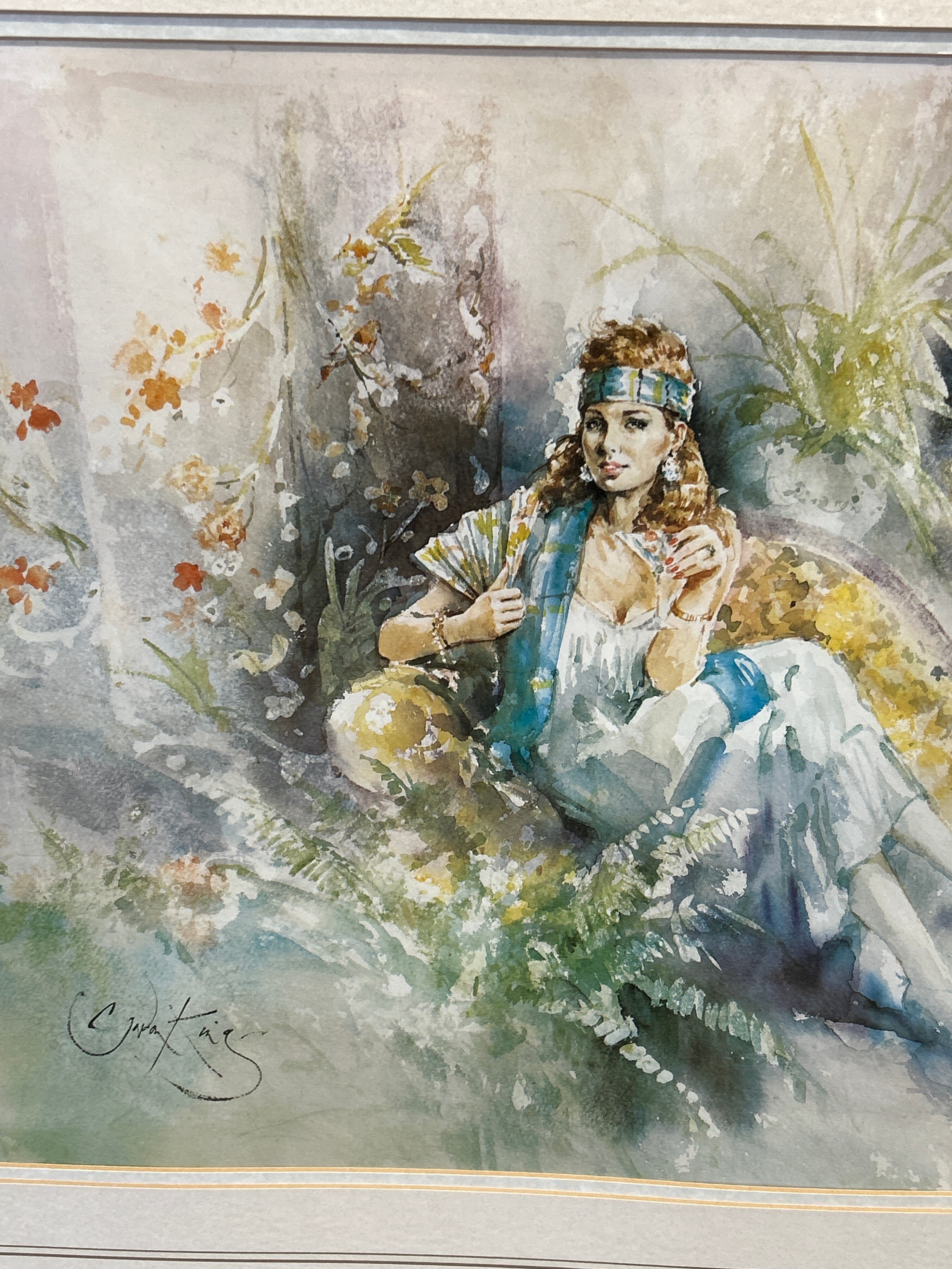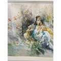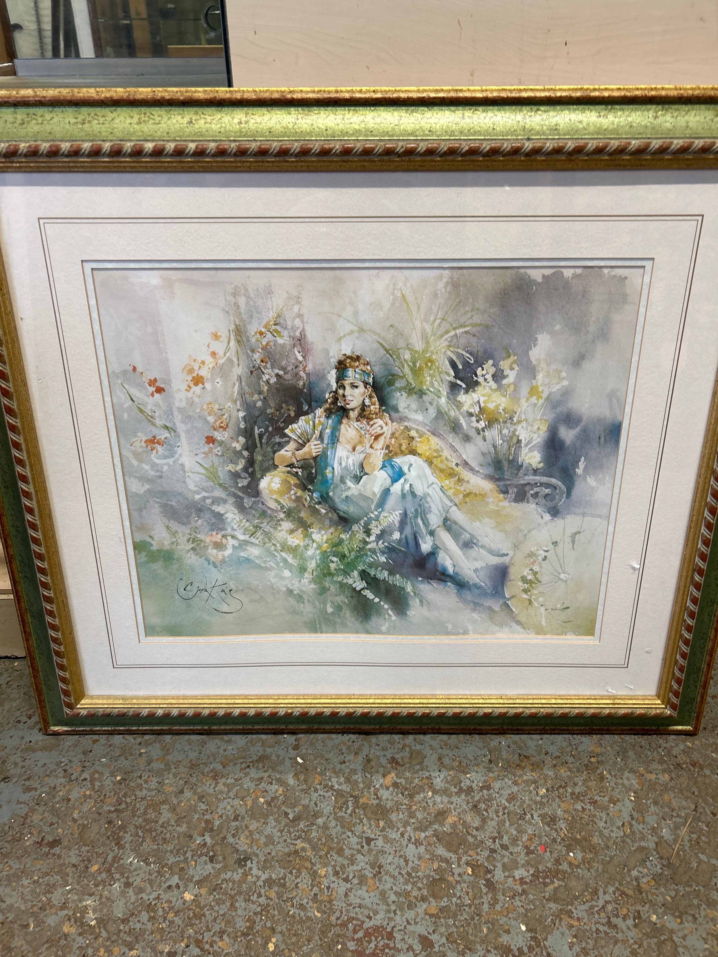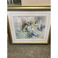 Large framed print by Gordon King of a lady on a chaise longue. Frame size 77cm x65cm