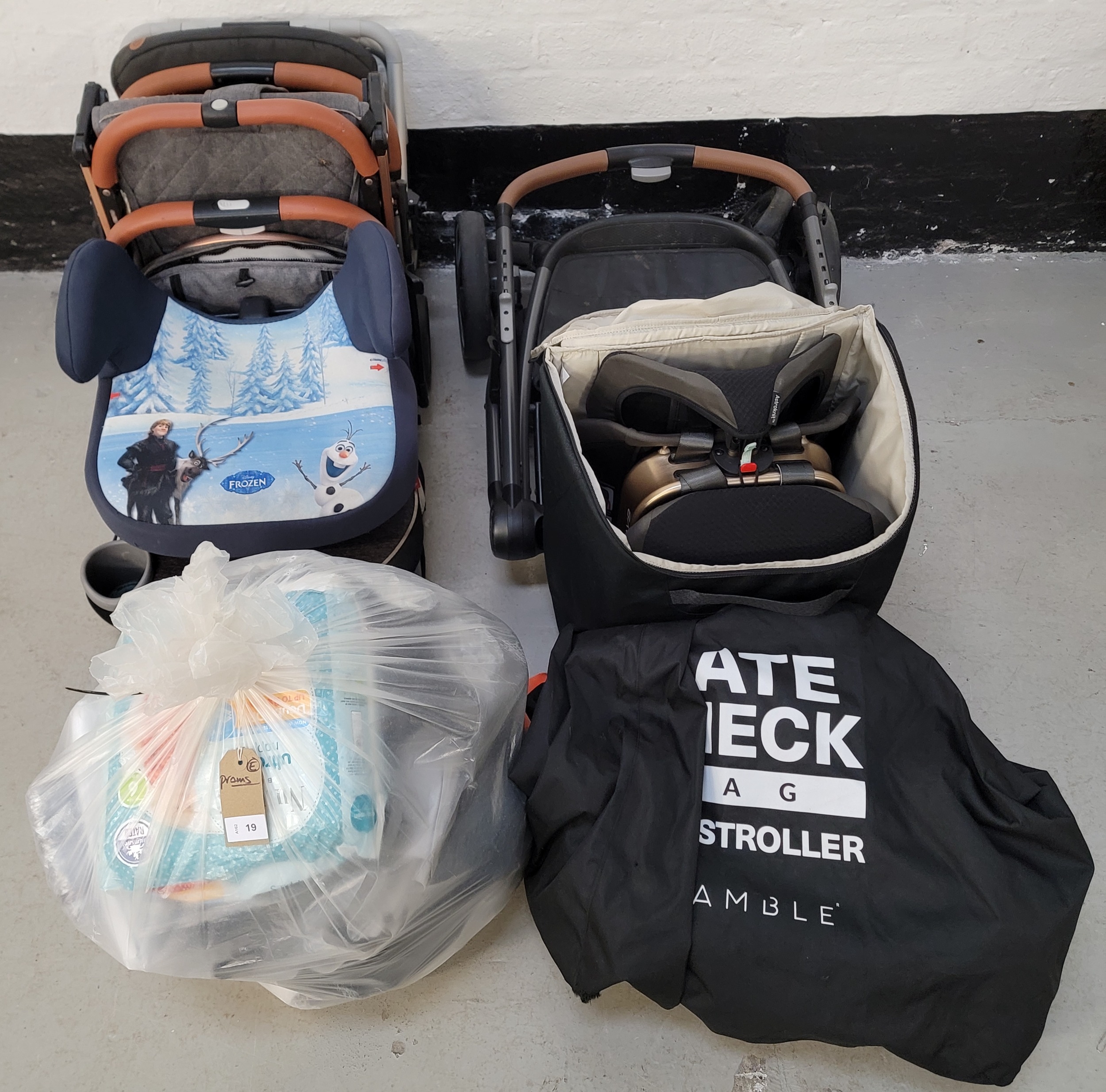 SELECTION OF THREE BUGGIES, ONE CAR SEAT, TWO BOOSTER CHAIRS AND ONE BAG OF ACCESSORIES