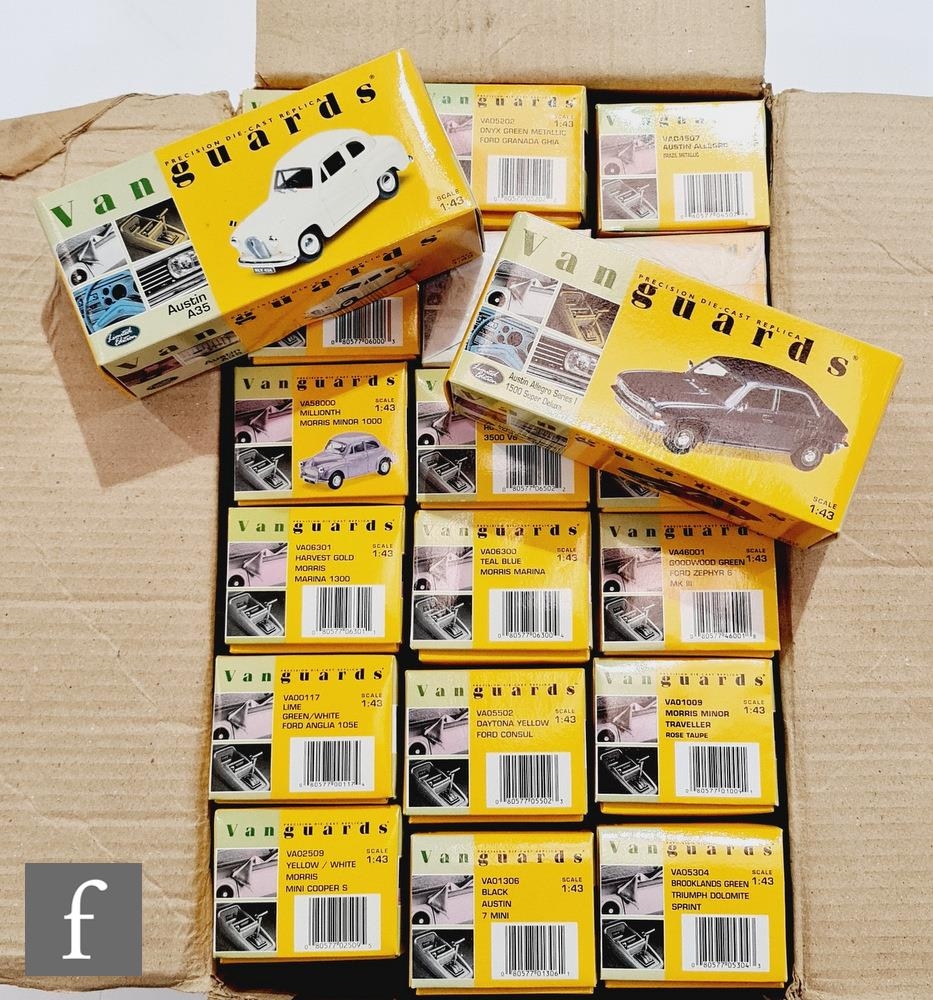 Twenty Lledo Vanguards 1:43 scale diecast model cars, to include Austin A35, Morris Oxford VI, Austin Mini 7, Ford Anglia 105E, etc., all boxed. (20)