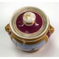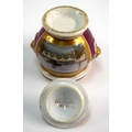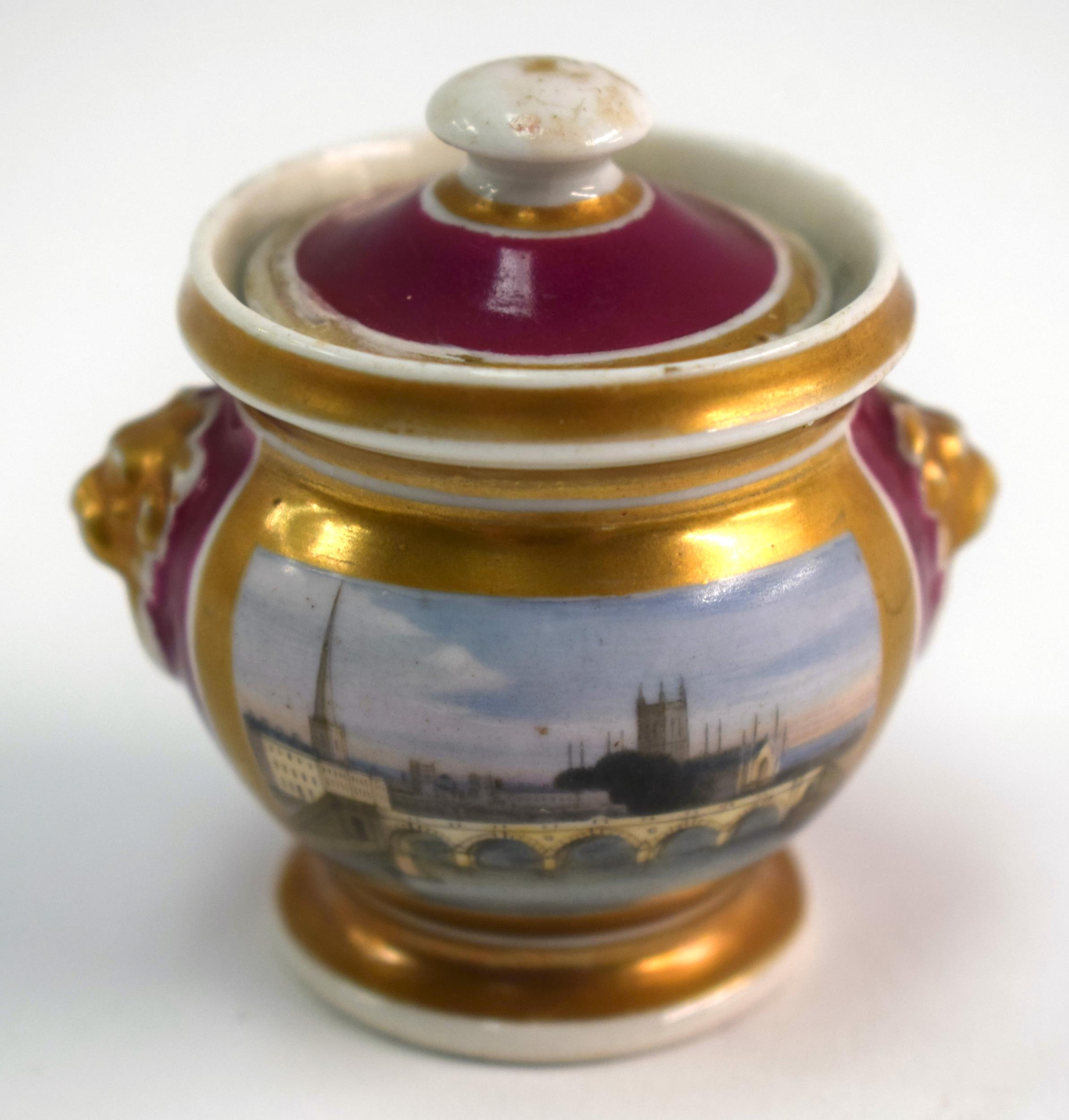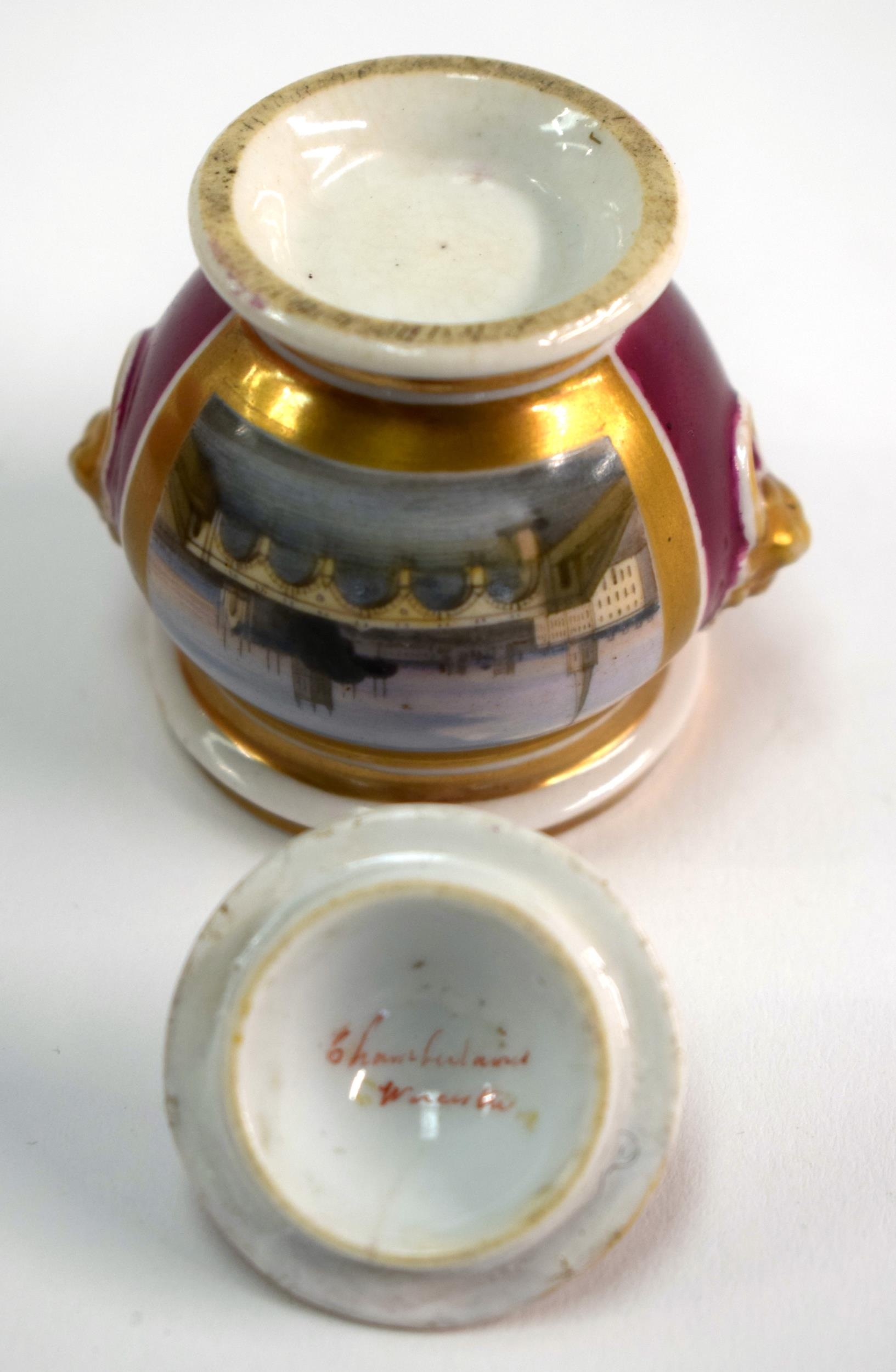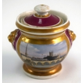 Mid 19th century Chamberlain Worcester rare miniature sucrier and cover with lions head to each side painted with a view of the Malvern Hills on a crimson ground, Chamberlain Worcester under cover in red. 5.5cm high