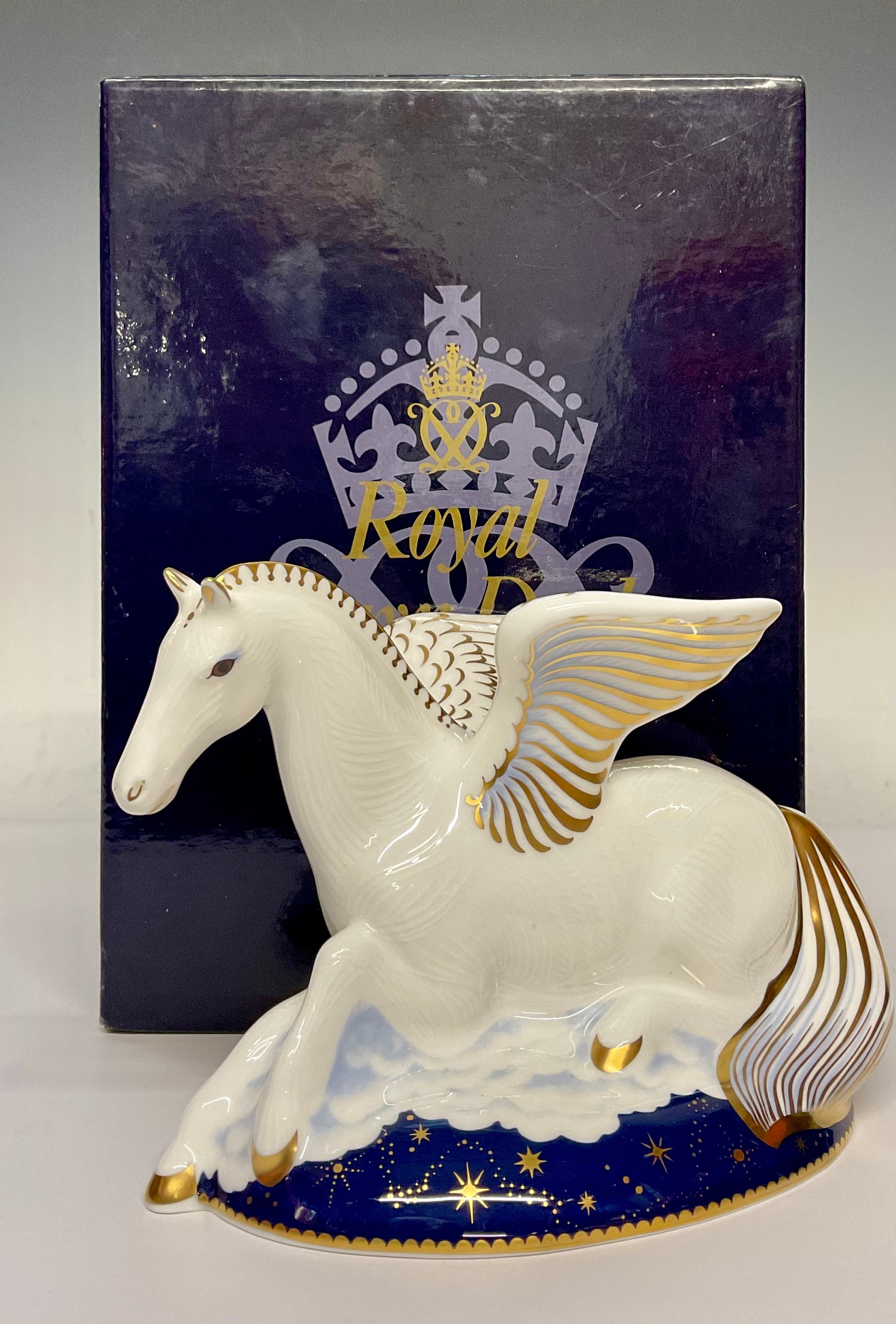 A Royal Crown Derby paperweight, Pegasus, the first of a pair of Mythical Beasts, exclusive to Goviers of Sidmouth, designed by June Branscombe, limited edition 267/1,750, gold stopper, 17cm long, printed mark in red, boxed
