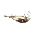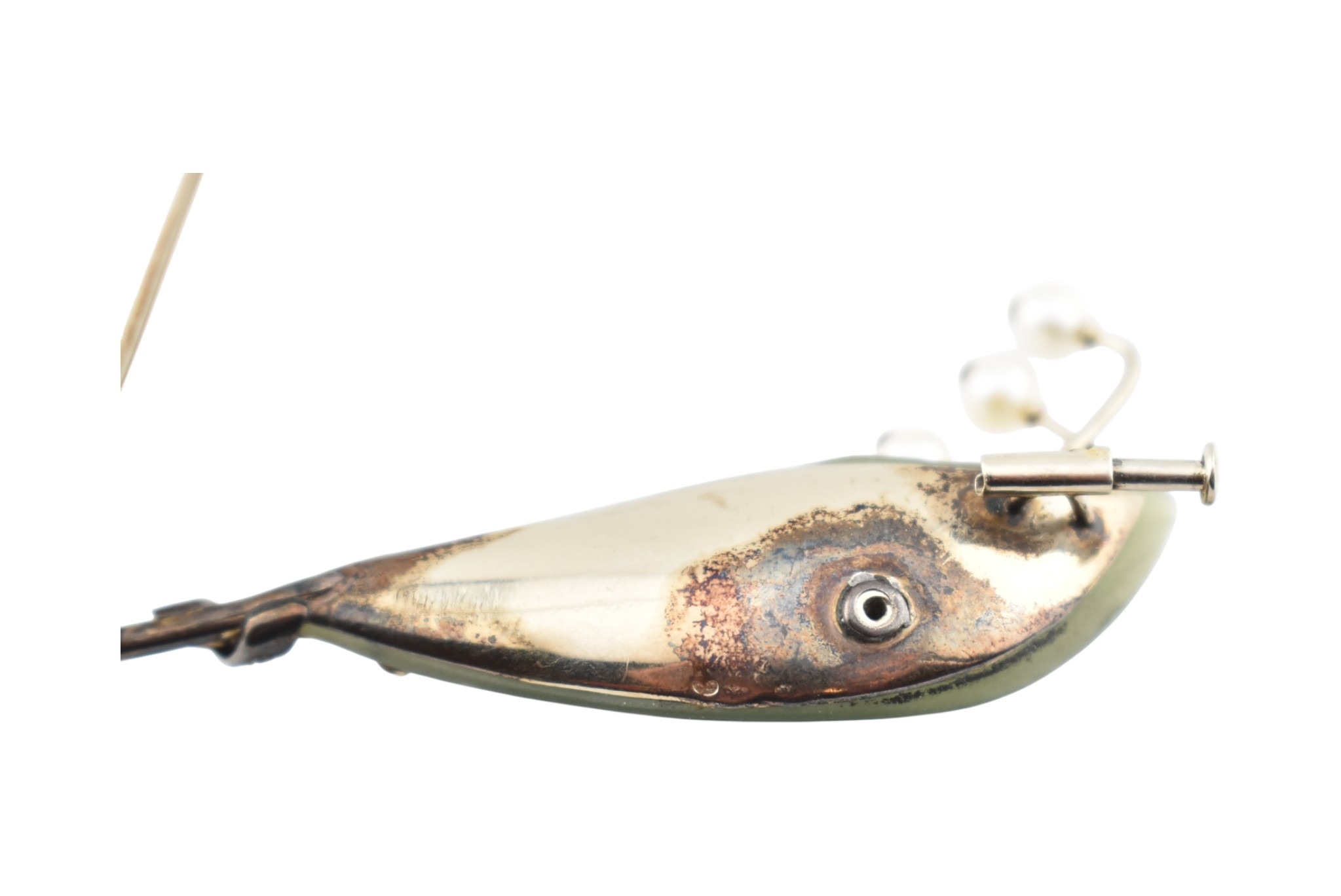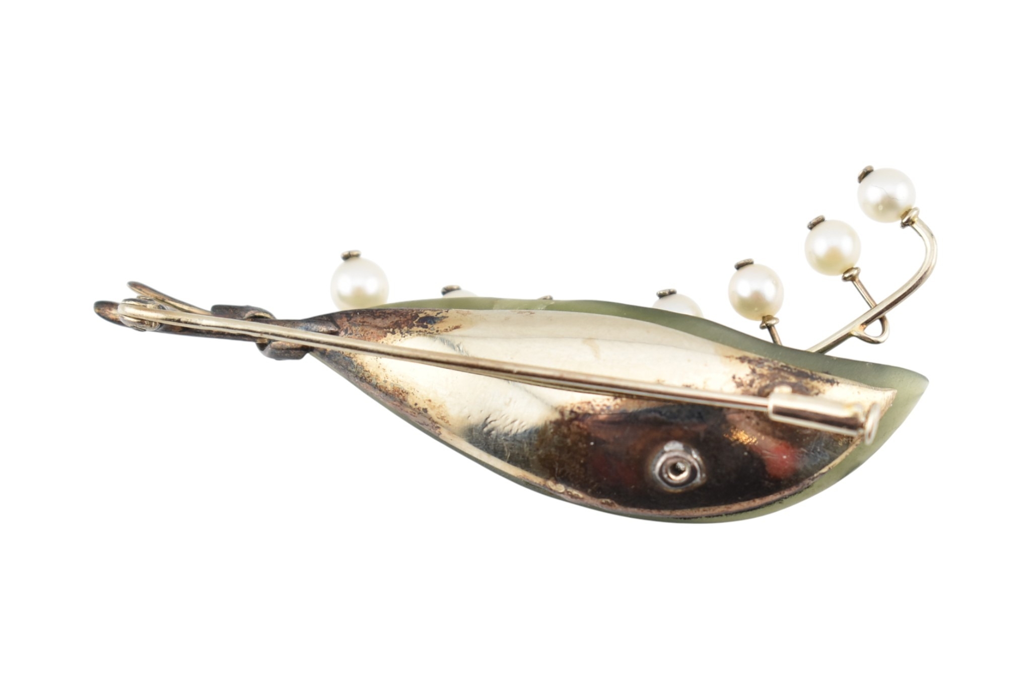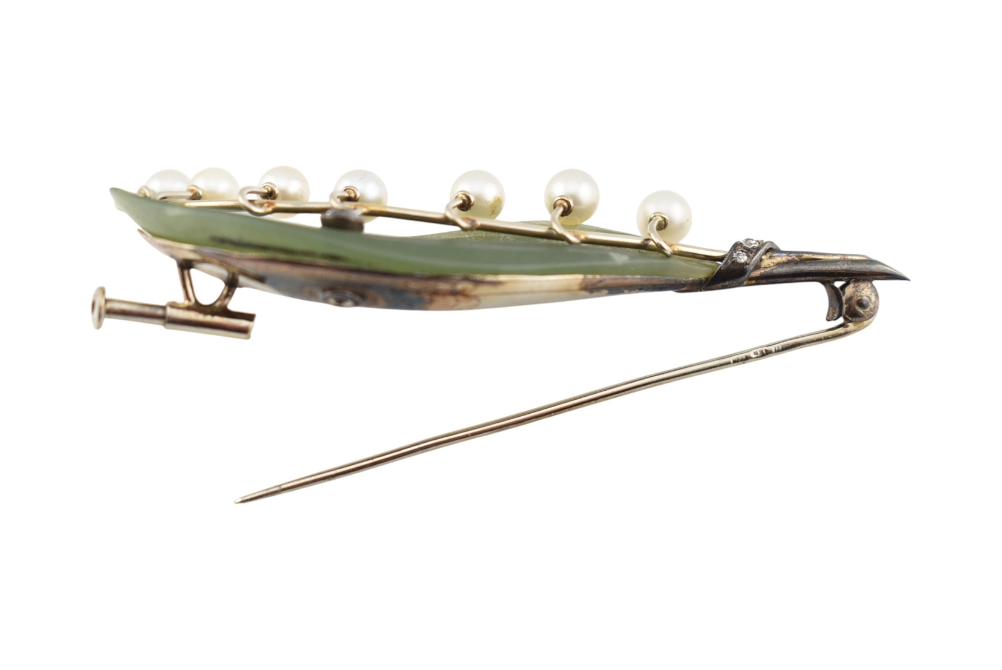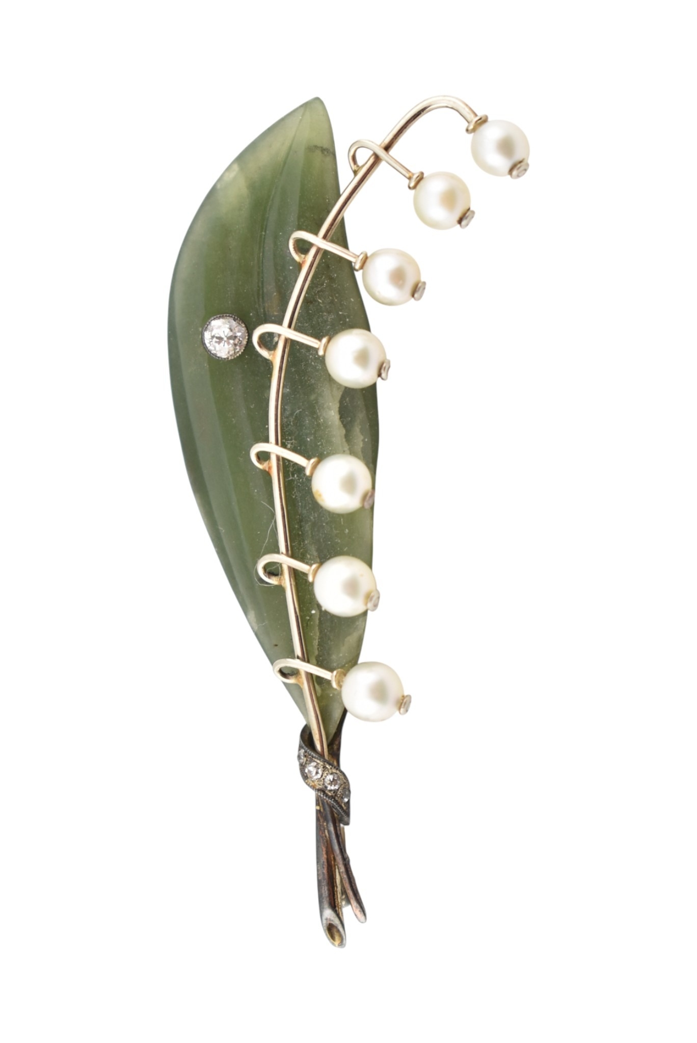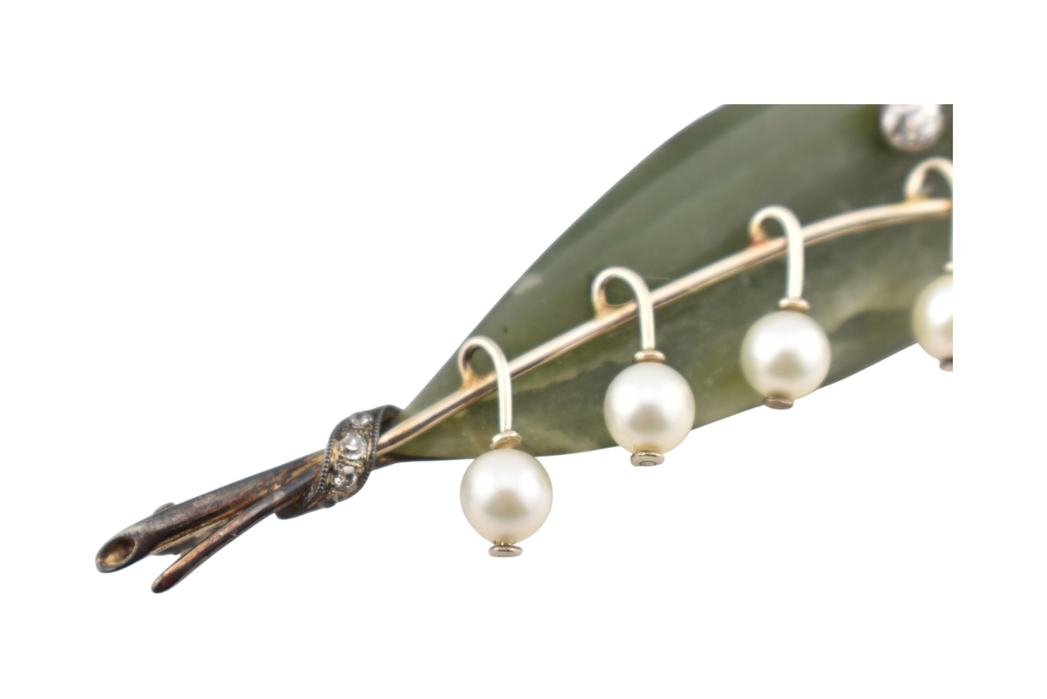 1930s pearl, diamond and carved nephrite brooch pin. The pin in the form of a spray of lily of the valley set with a single old cut diamond, with seven pearls, set against a carved nephrite leaf with a diamond set stem. Assay marks to pin illegible tests indicate 14ct gold. Weight 10.7g. Measures 6.3cm.