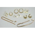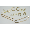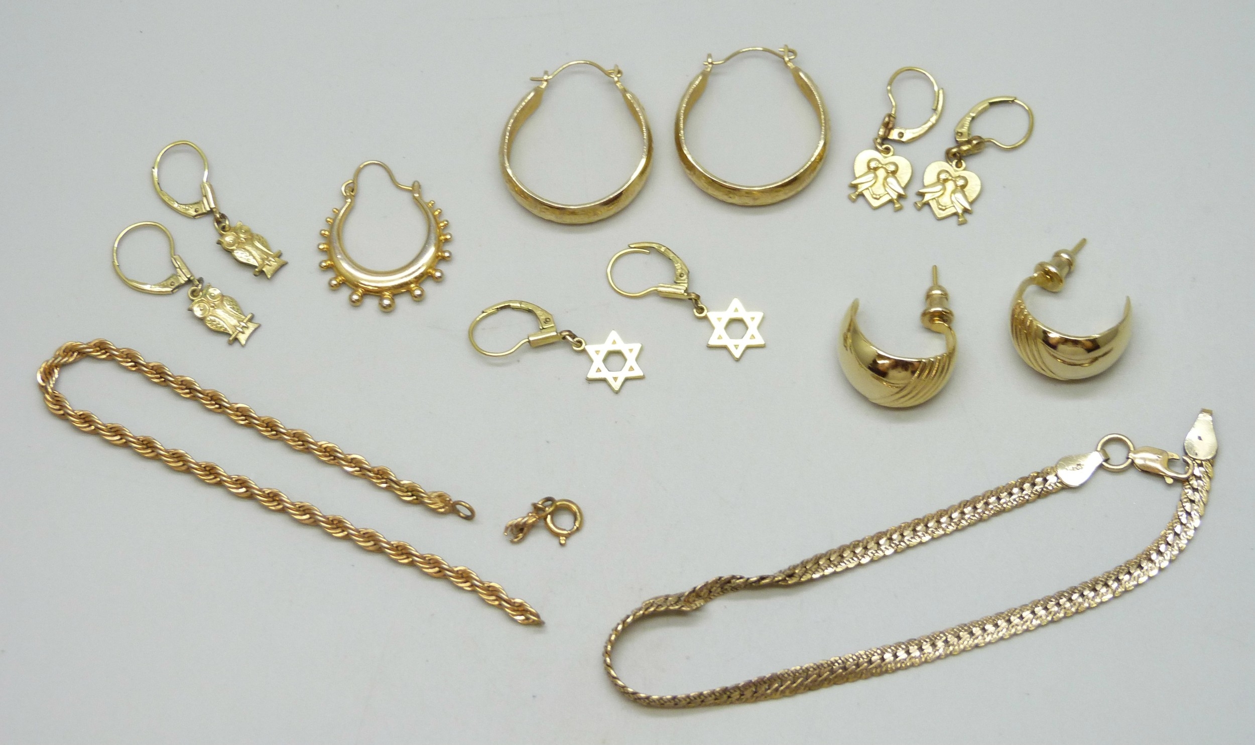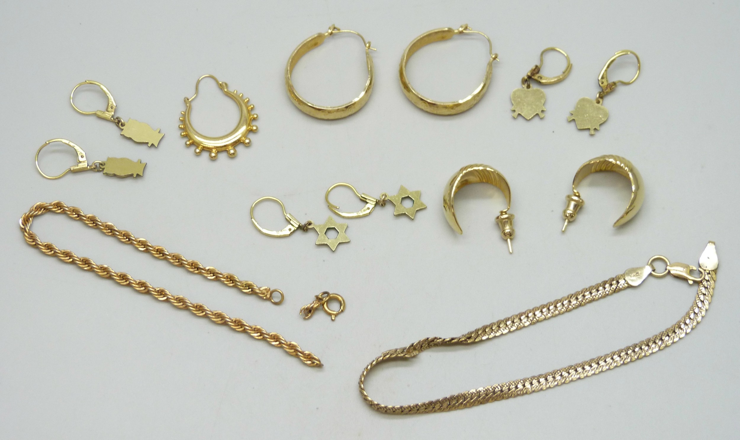 Three pairs of 14ct rolled gold earrings, two other pairs of plated earrings, a 14ct plated bracelet and one other, a/f