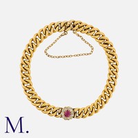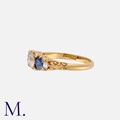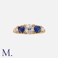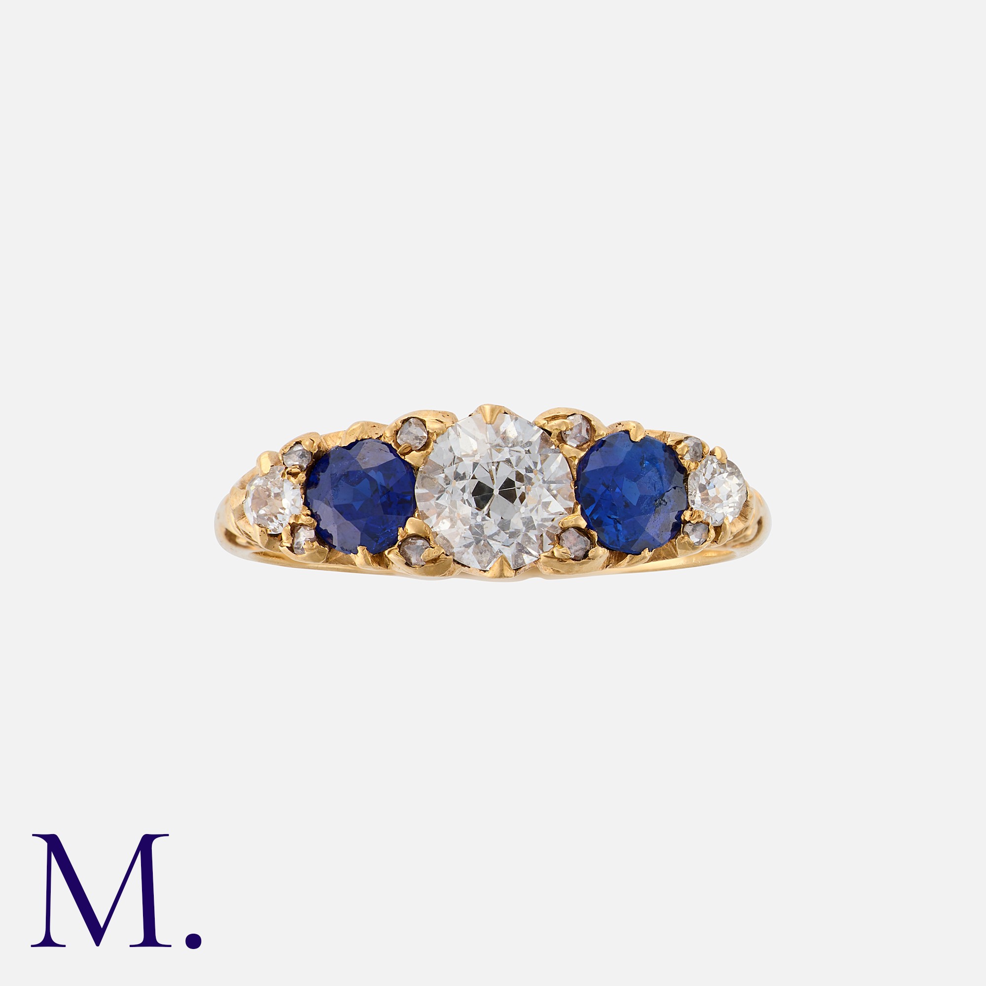 An Antique Sapphire And Diamond Five Stone Ring in 18k yellow gold, set centrally with an old cut diamond of approximately 0.75ct, flanked either side by a round cut sapphire and two further old cut diamonds. Marked 18, RS.