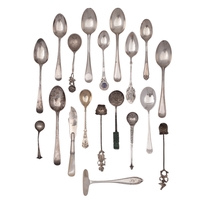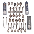 Sixteen silver souvenir spoons, mixed standards & regions, together with eight other silver plated examples and a pair of silver plated sugar tongs; 5.4ozt (25)
