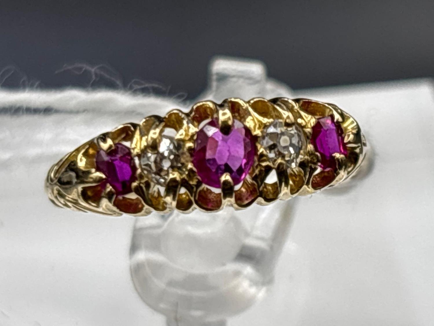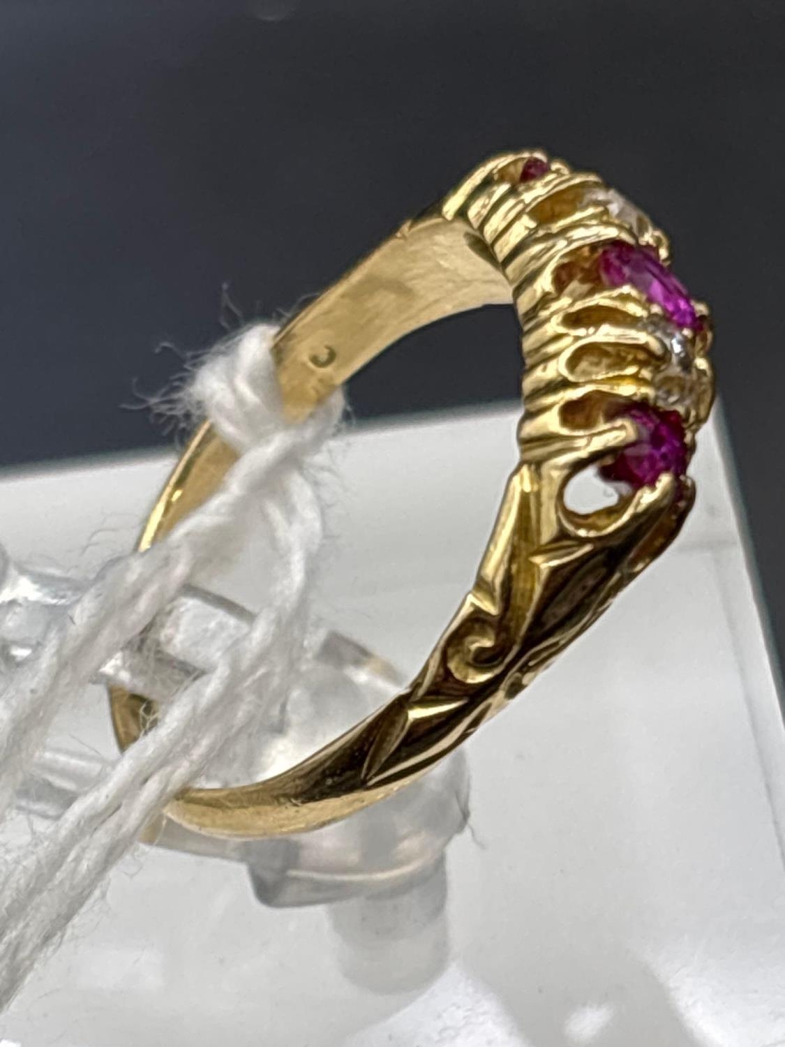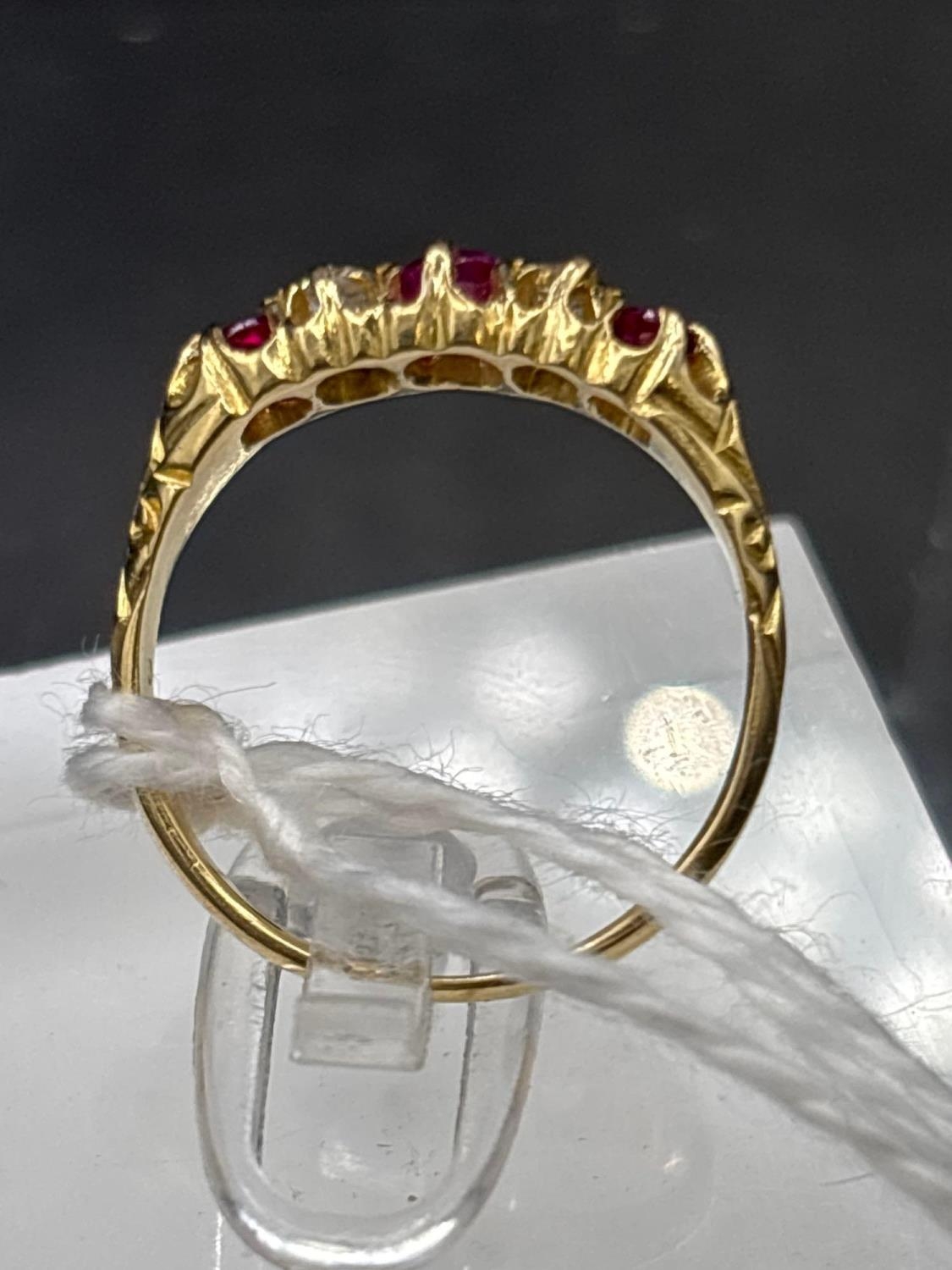 Antique Edwardian Ruby and diamond 18ct 5 stone ring, size M, 2.8g