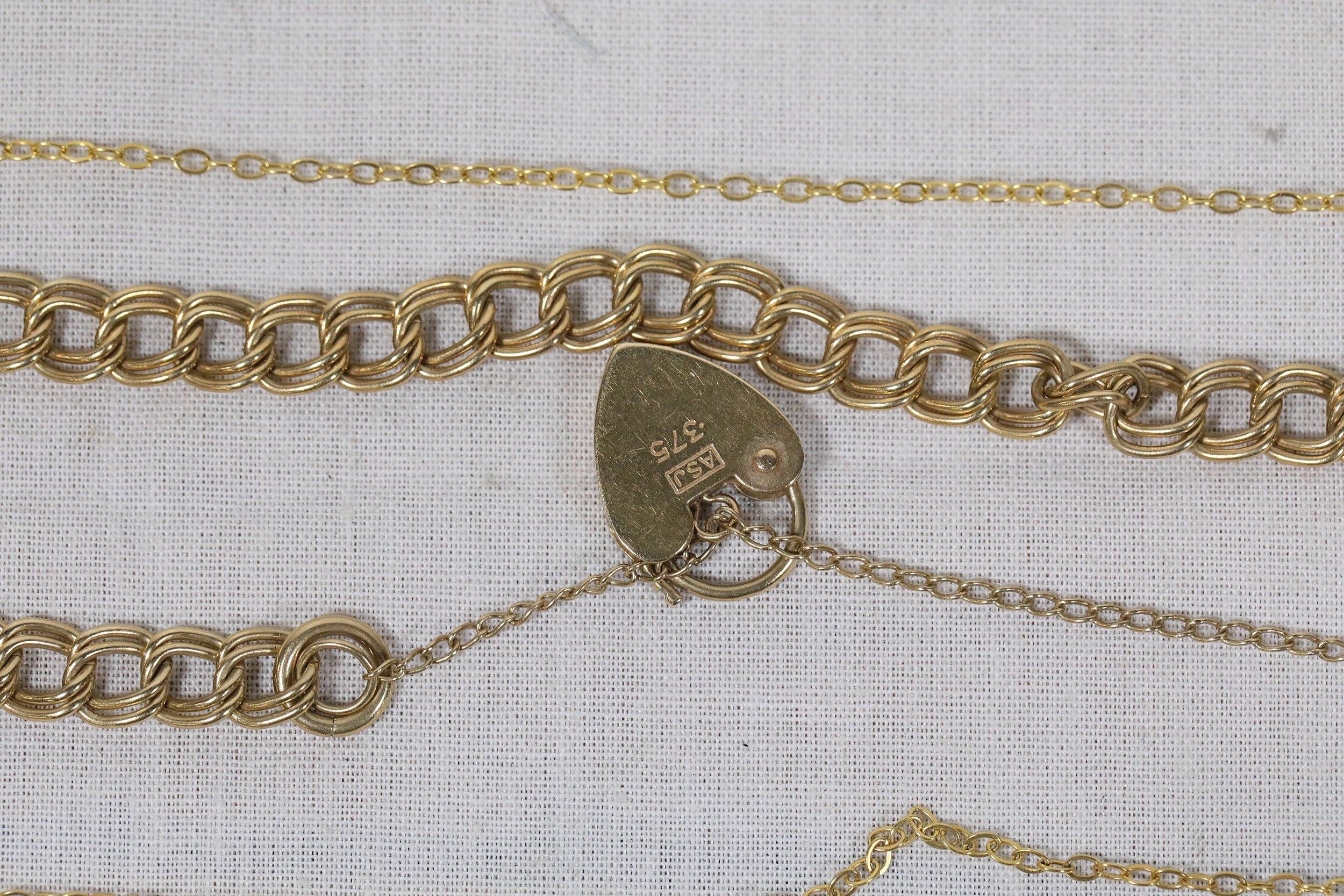 The heart padlock clasp is a classic British sentimental design, and the 375 mark confirms 9-carat gold.