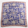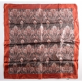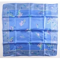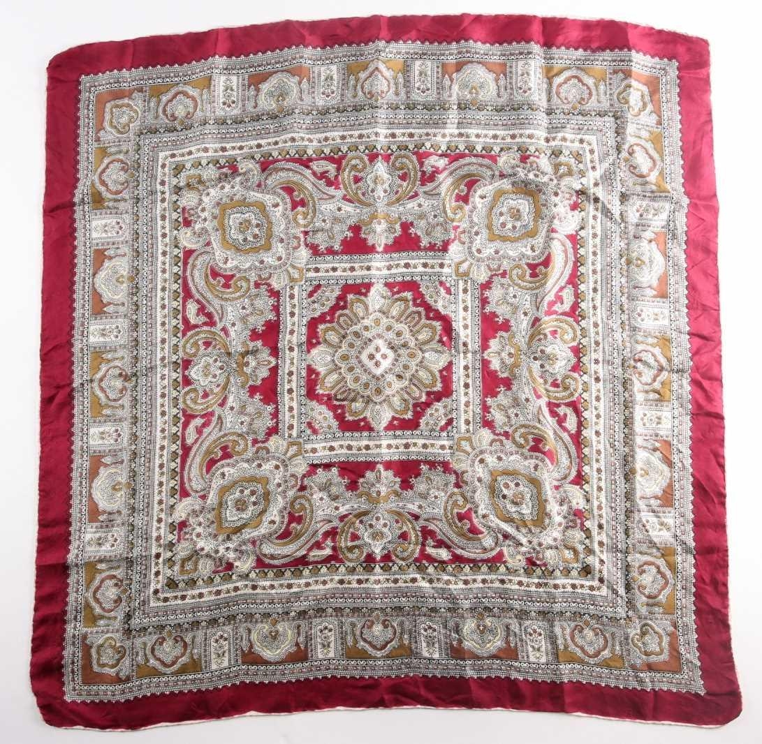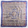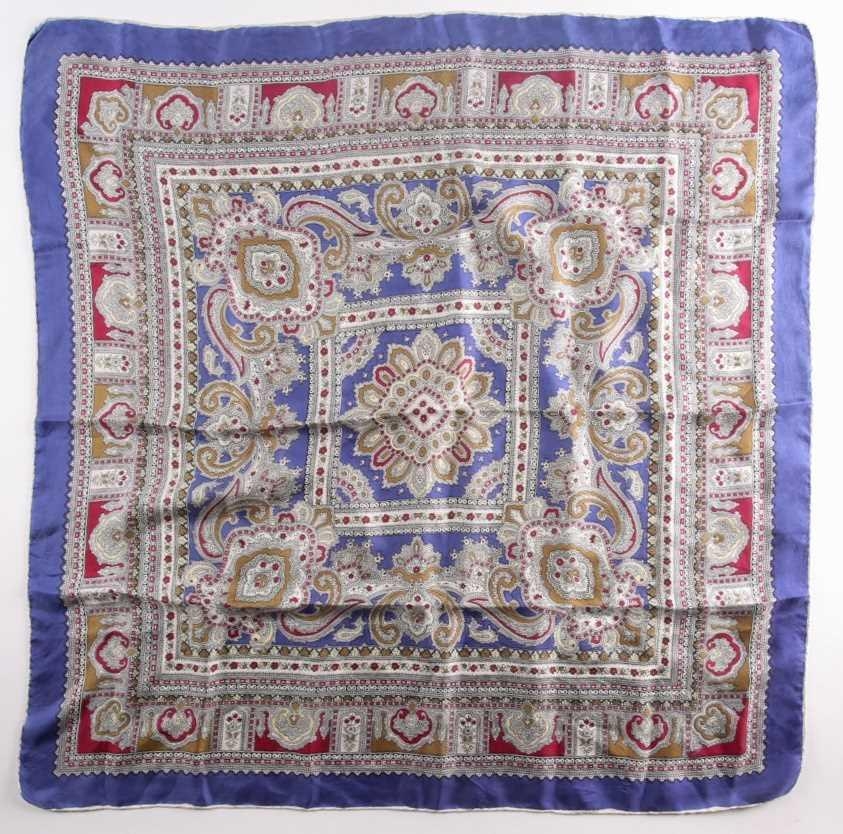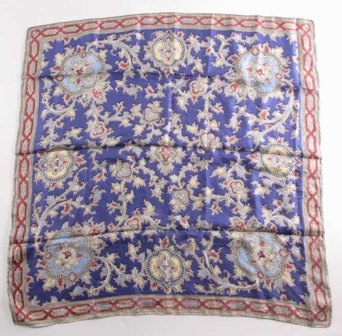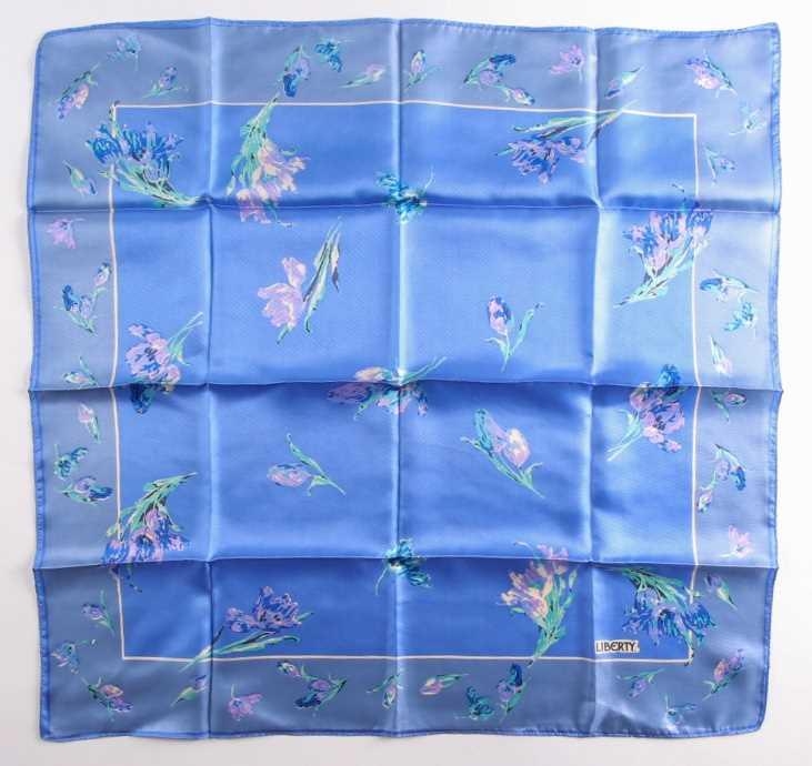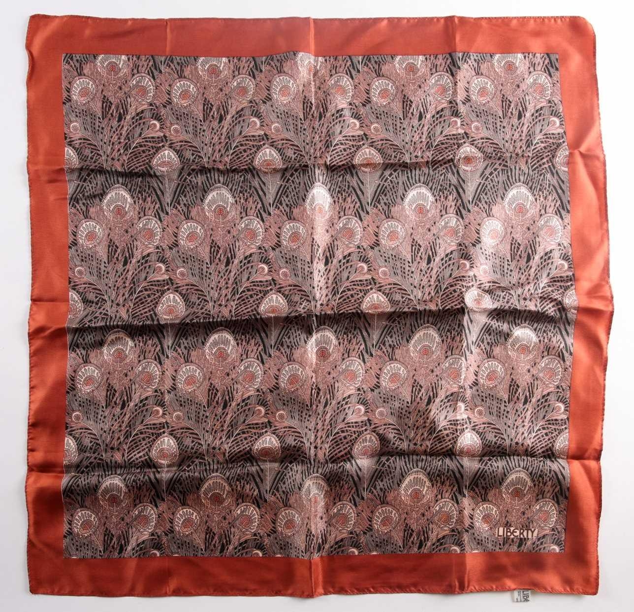 A Liberty silk square scarf with peacock feathers on a black ground with a rust border, together with another Liberty scarf with tulips on a blue ground within a wide border of further tulip sprays, and three other Liberty style silk scarves (5)