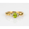 9ct GOLD RING claw set with a centre oval olivine and a tiny diamond to each shoulder, ring size ‘L’, 2.3gms