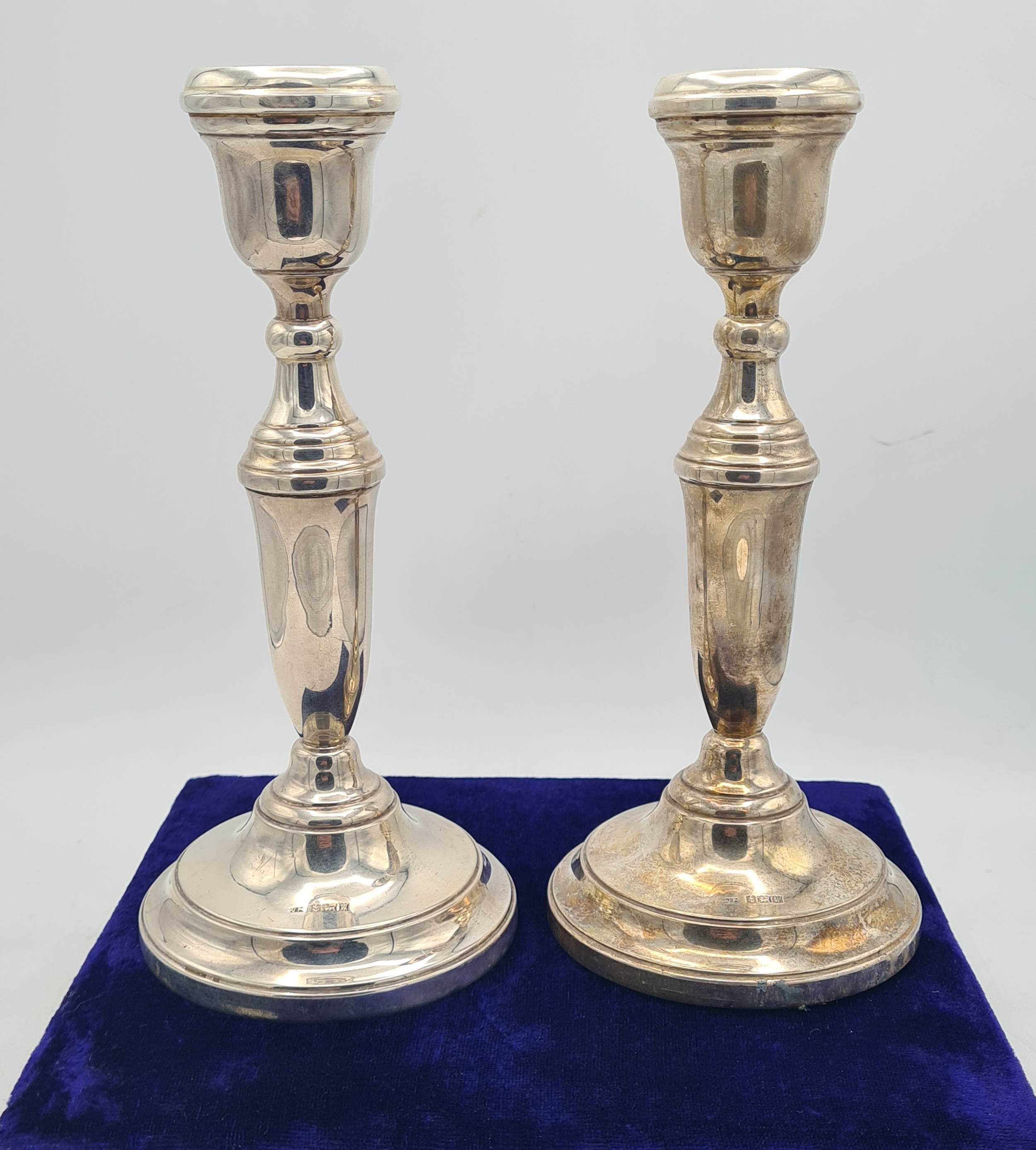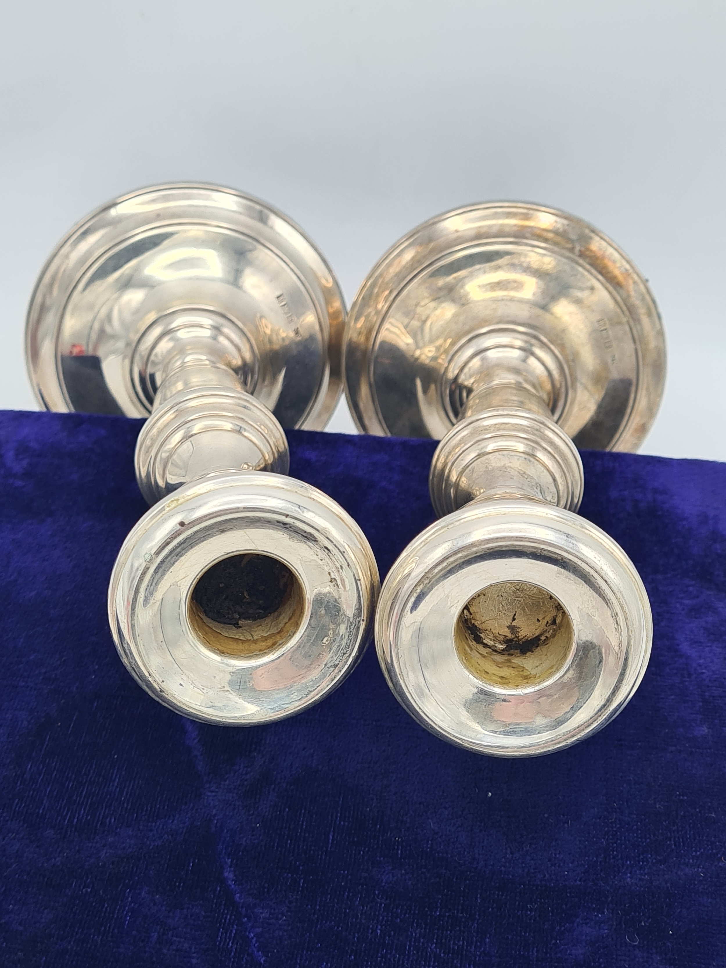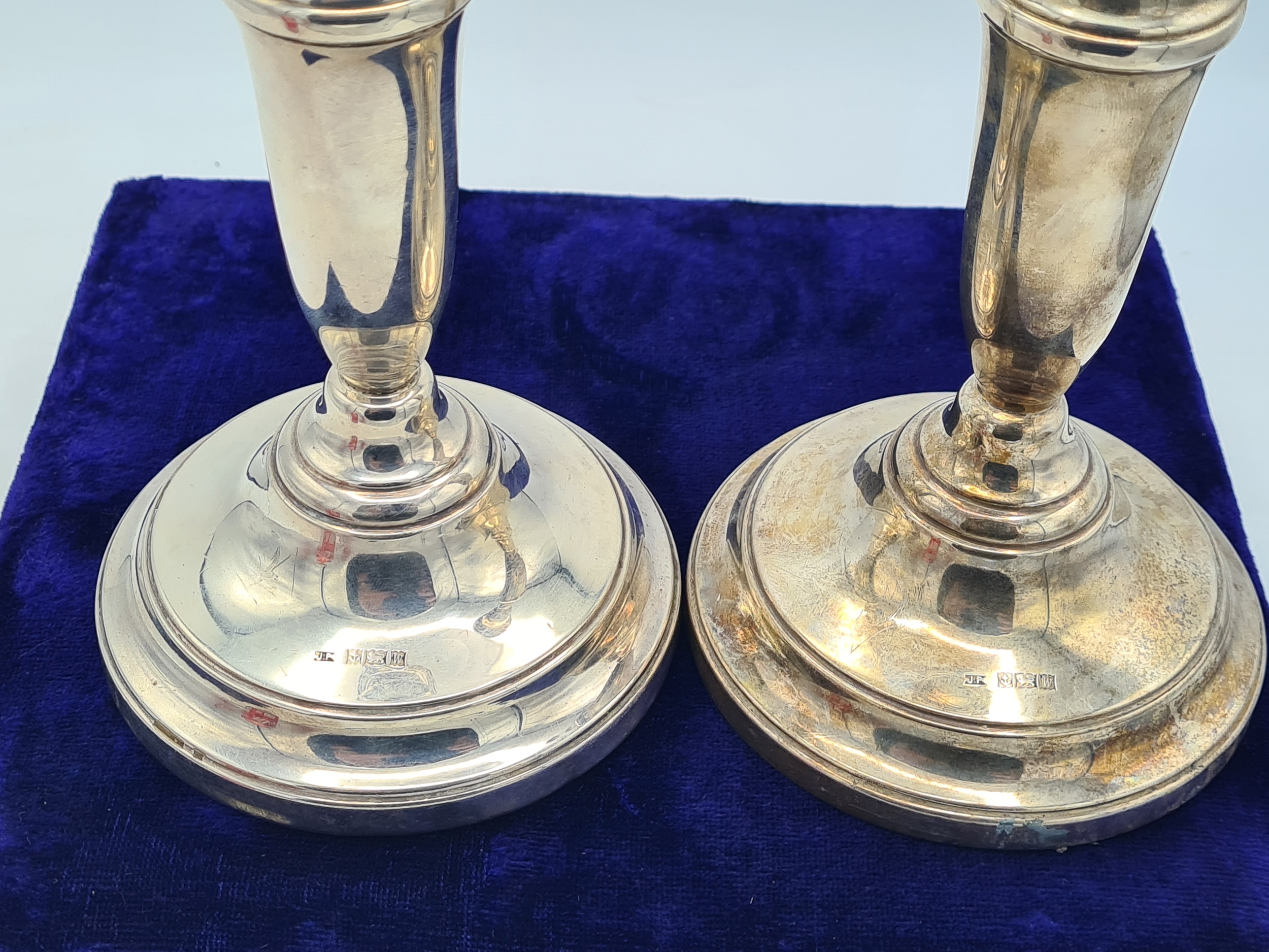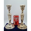 A pair of Sterling Silver weighted Candlesticks. each measures H22cm x 10cm widest diameter. Hallmark J.P Birmingham 1971.