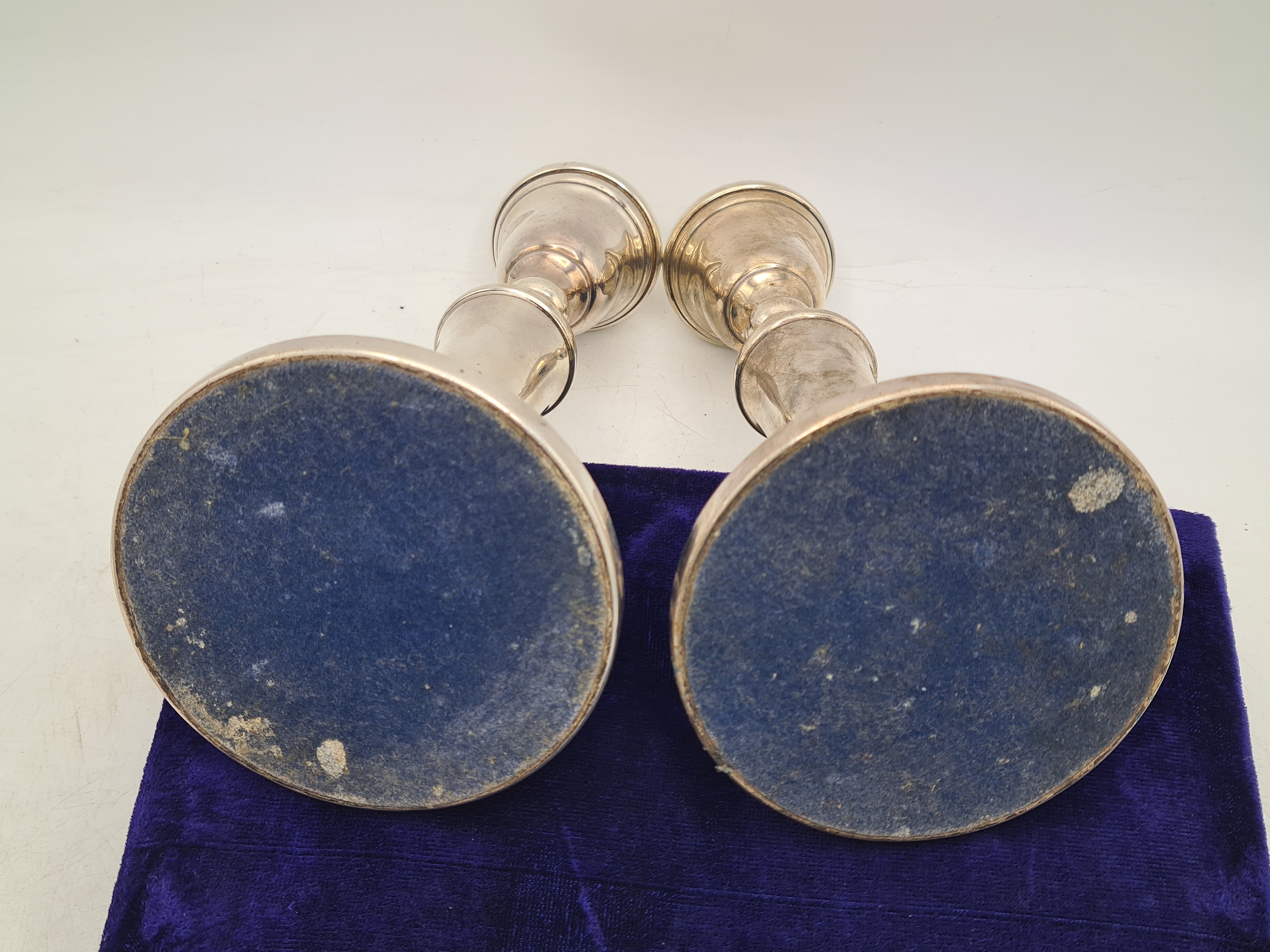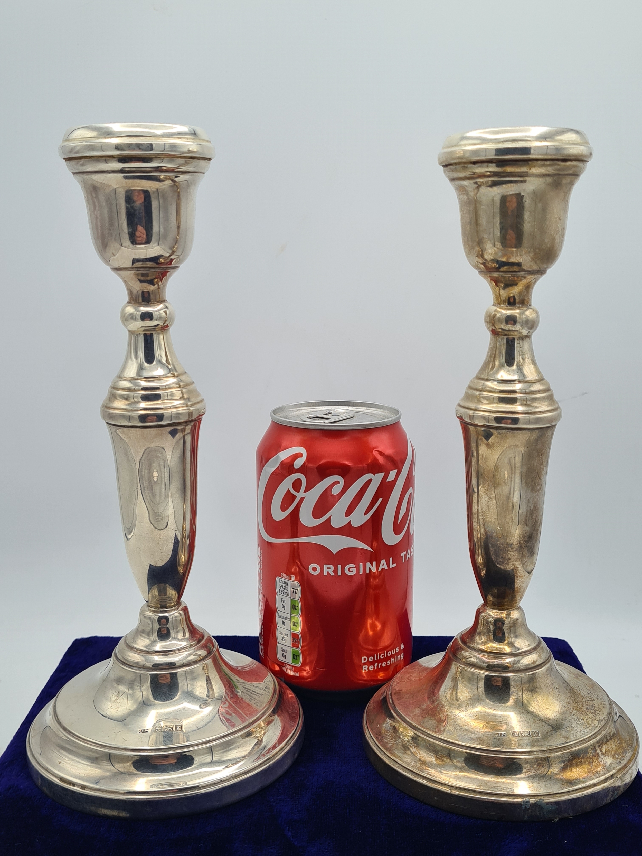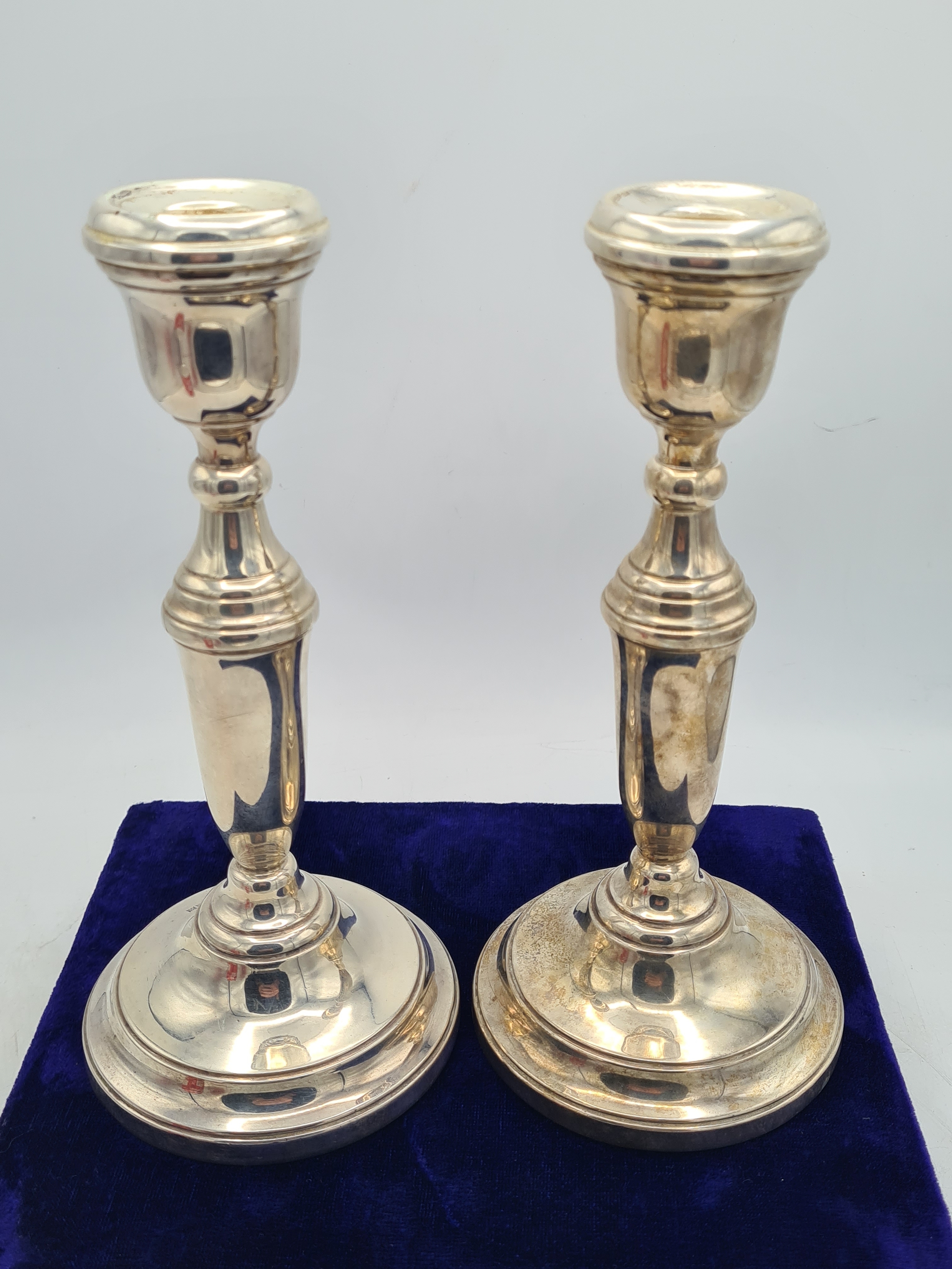 A pair of Sterling Silver weighted Candlesticks. each measures H22cm x 10cm widest diameter. Hallmark J.P Birmingham 1971.