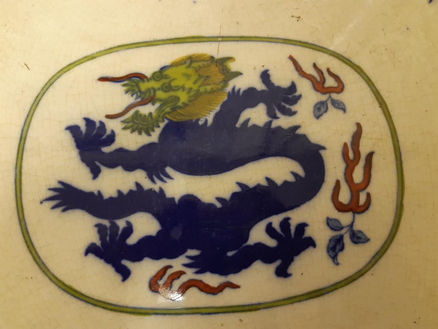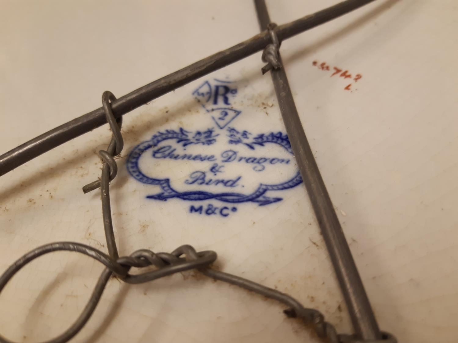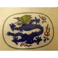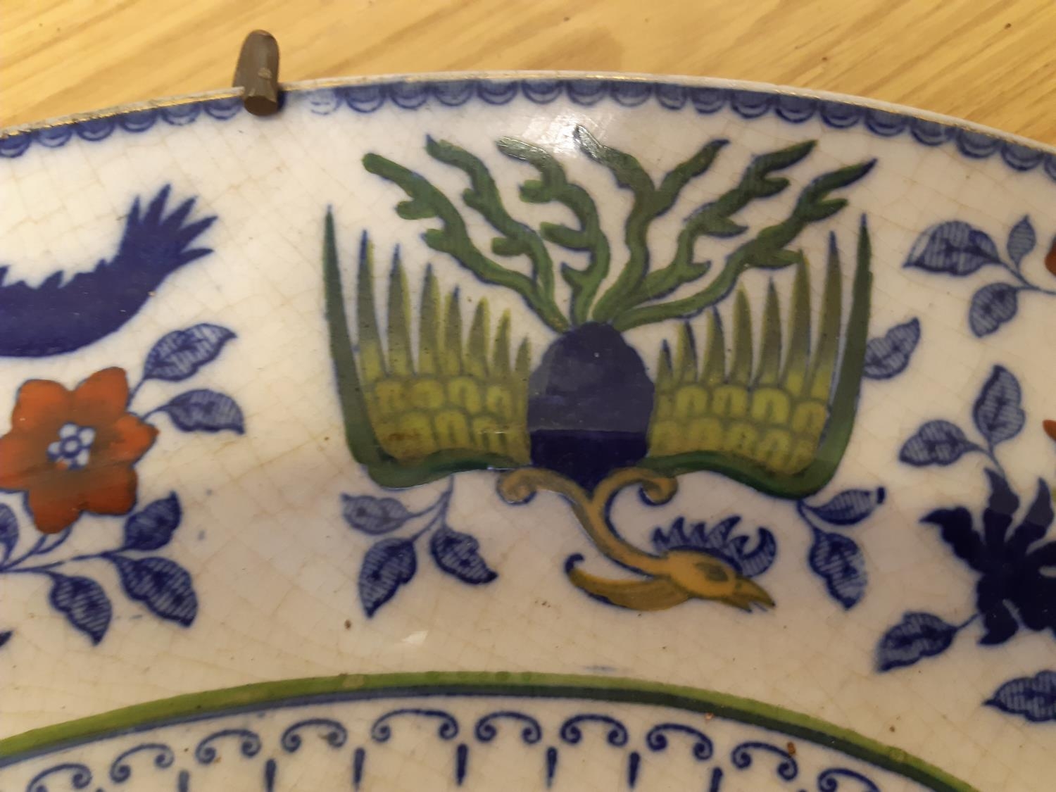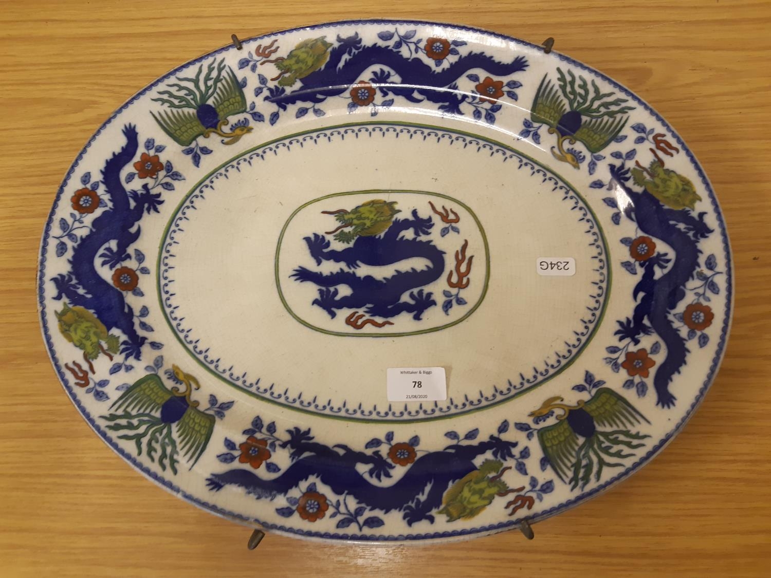 A Victorian oriental style serving meat plate with Chinese five fingered dragon and bird design with printed marks to base