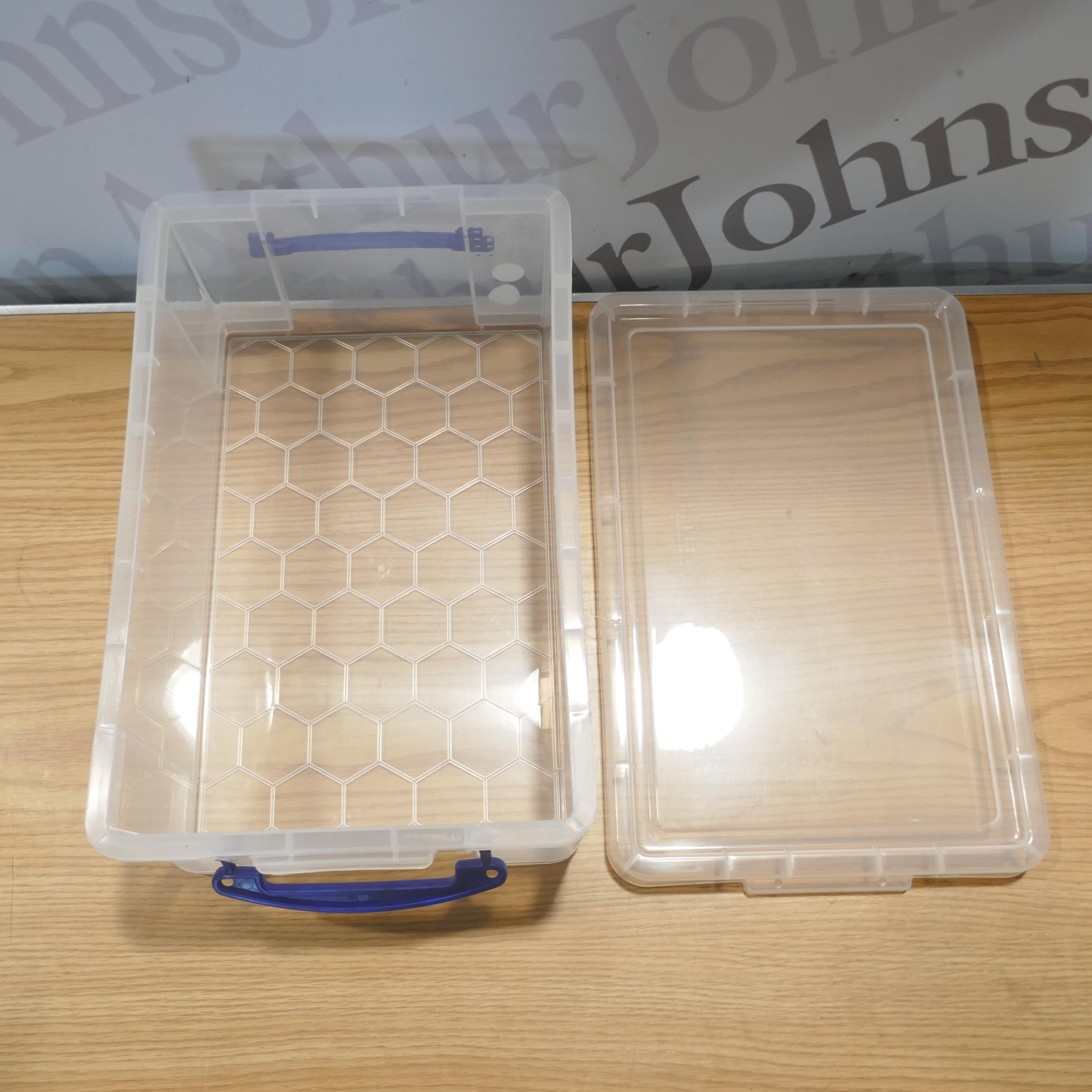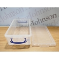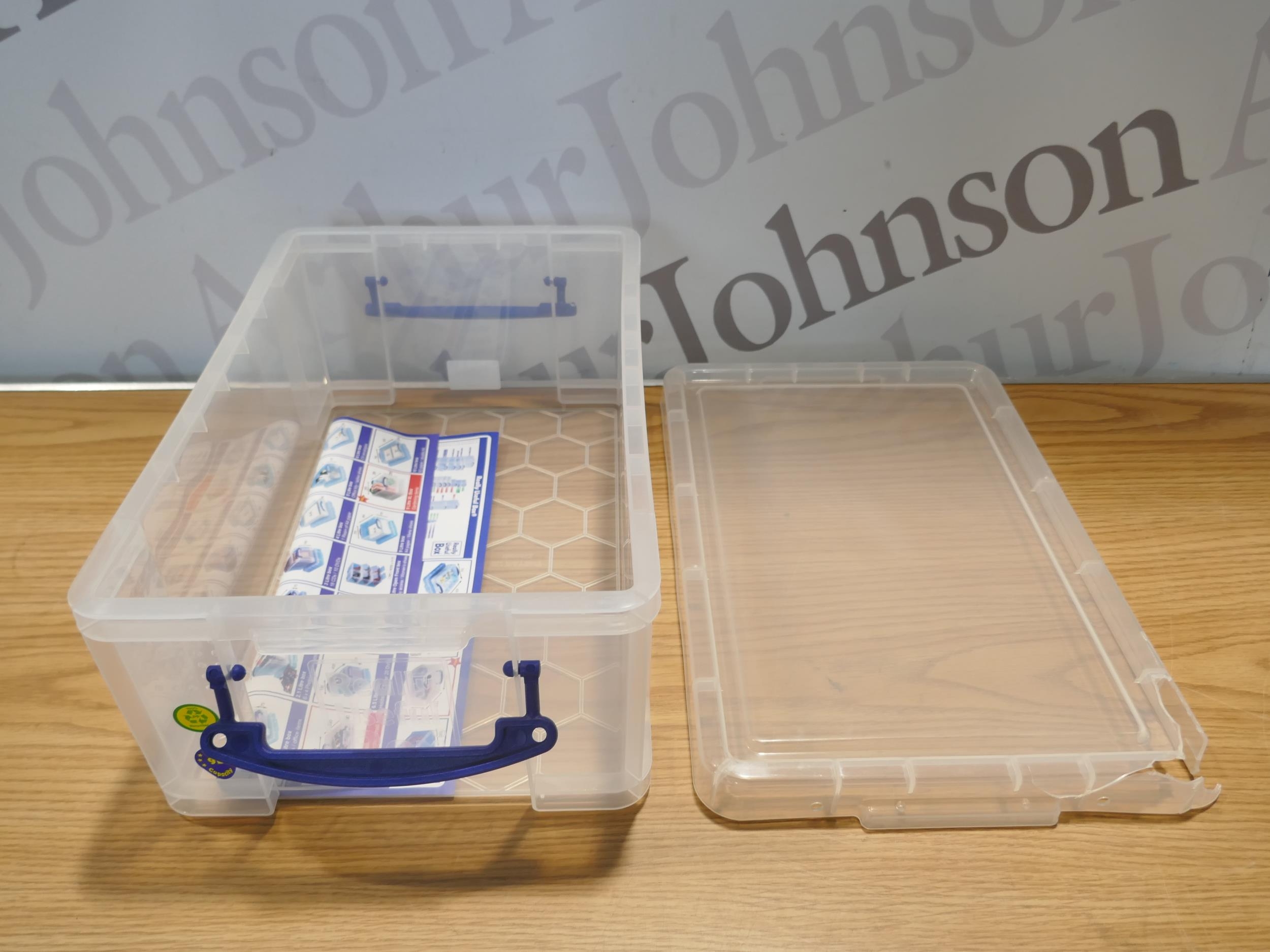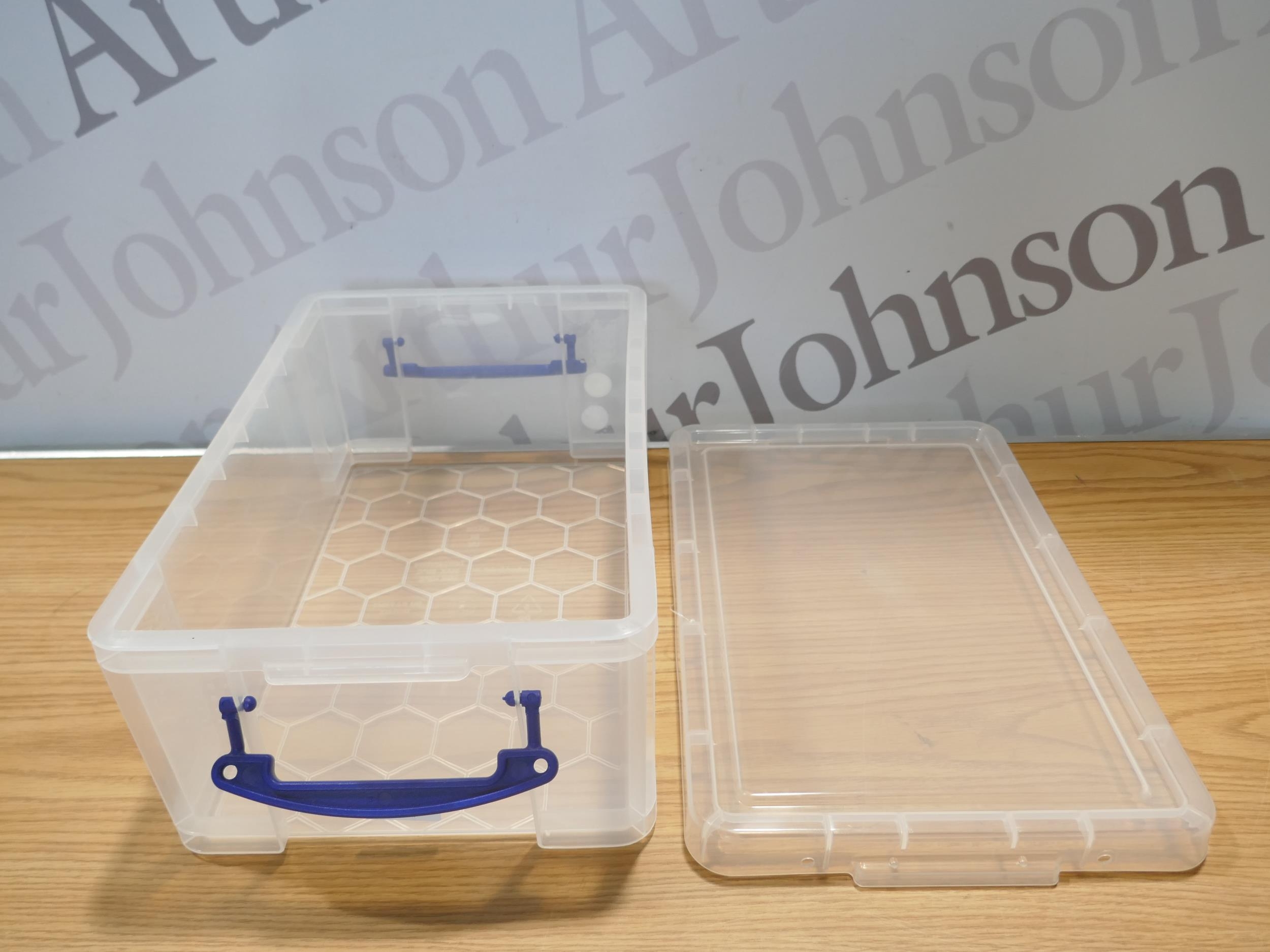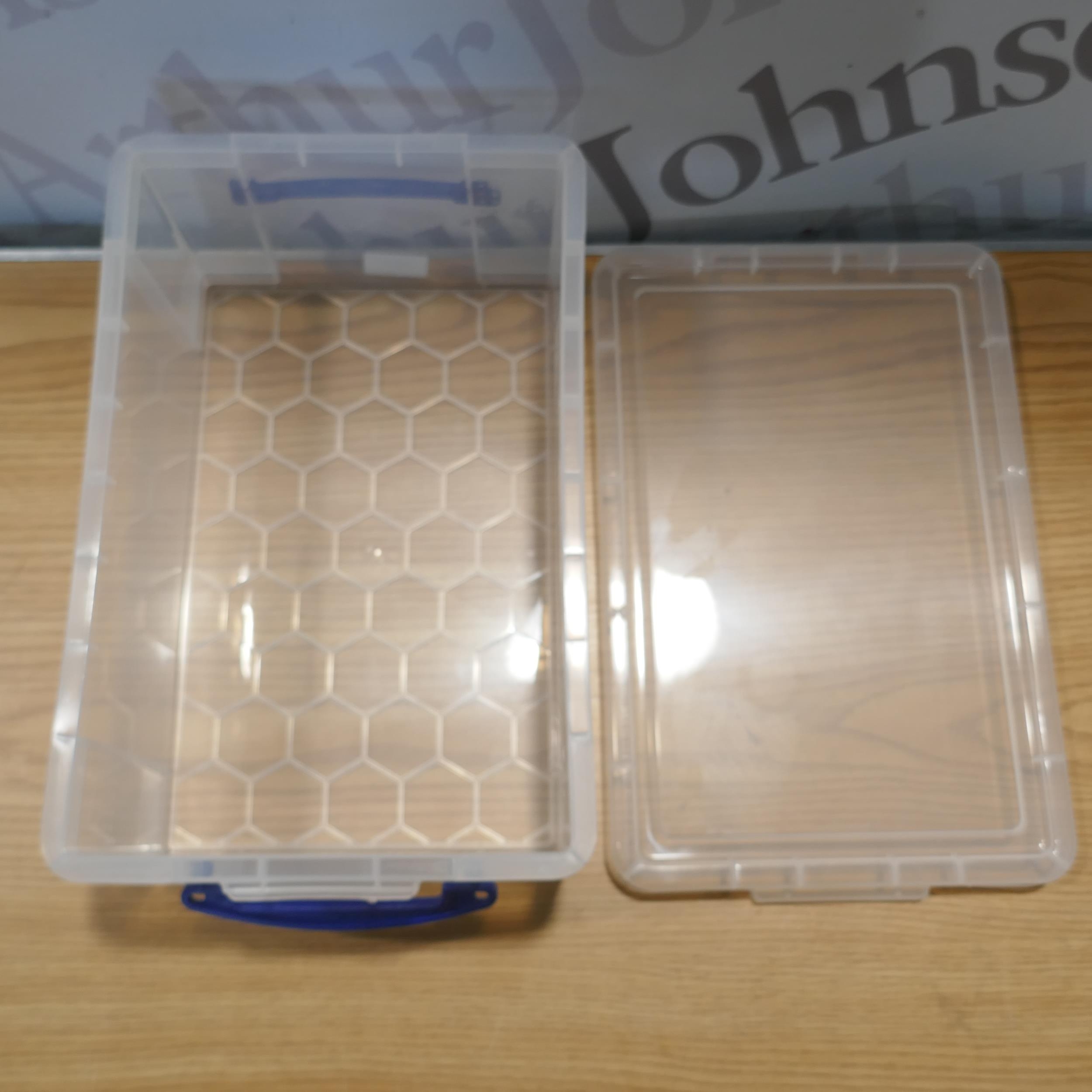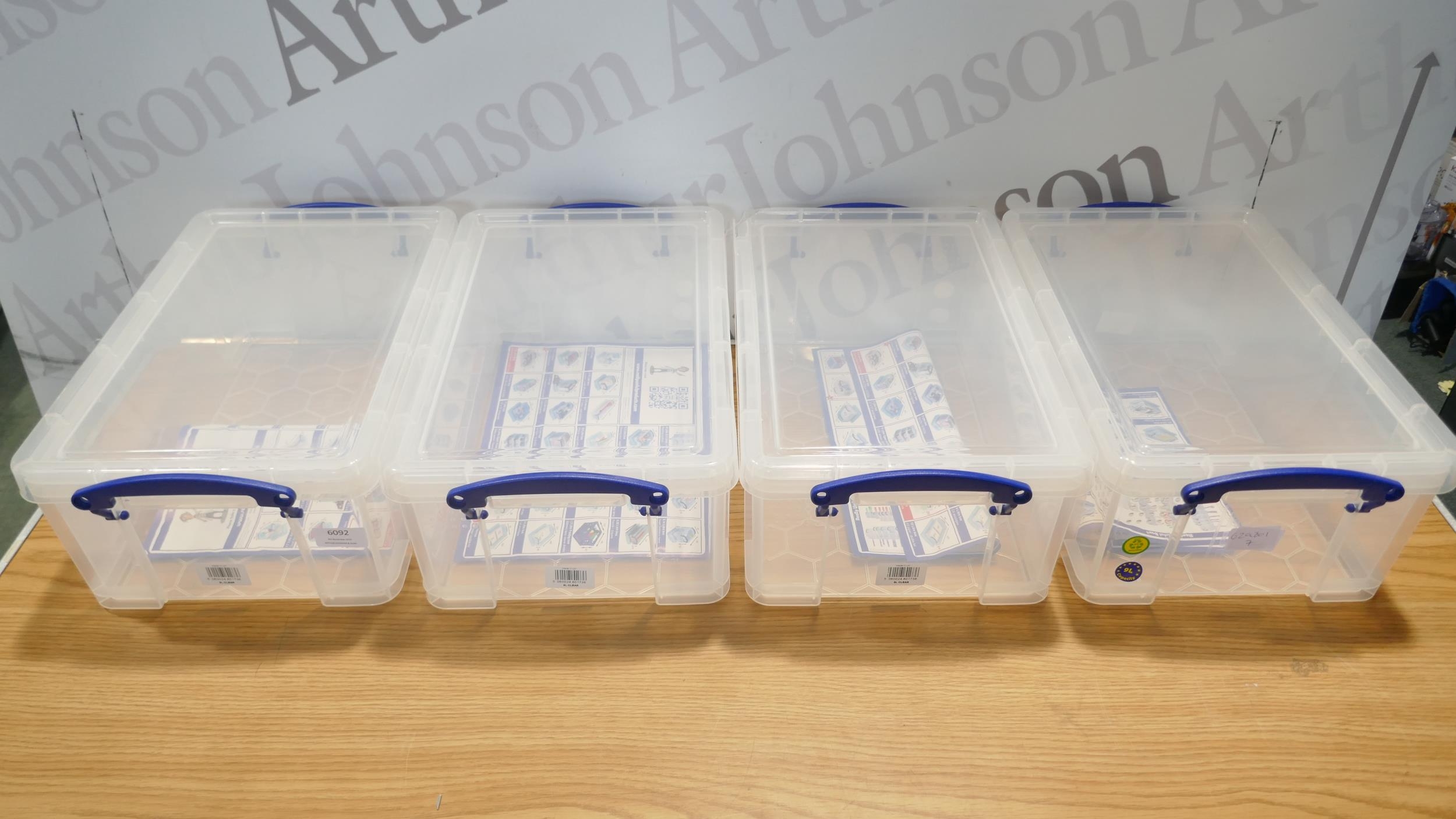 Four Really Useful 9 litre storage boxes with lids (damaged lid)