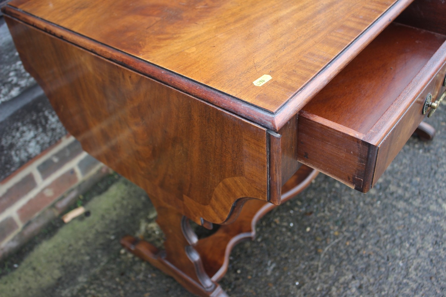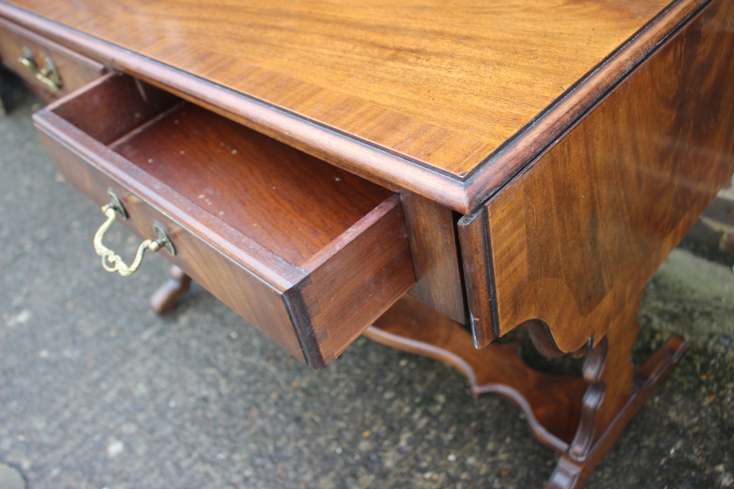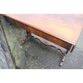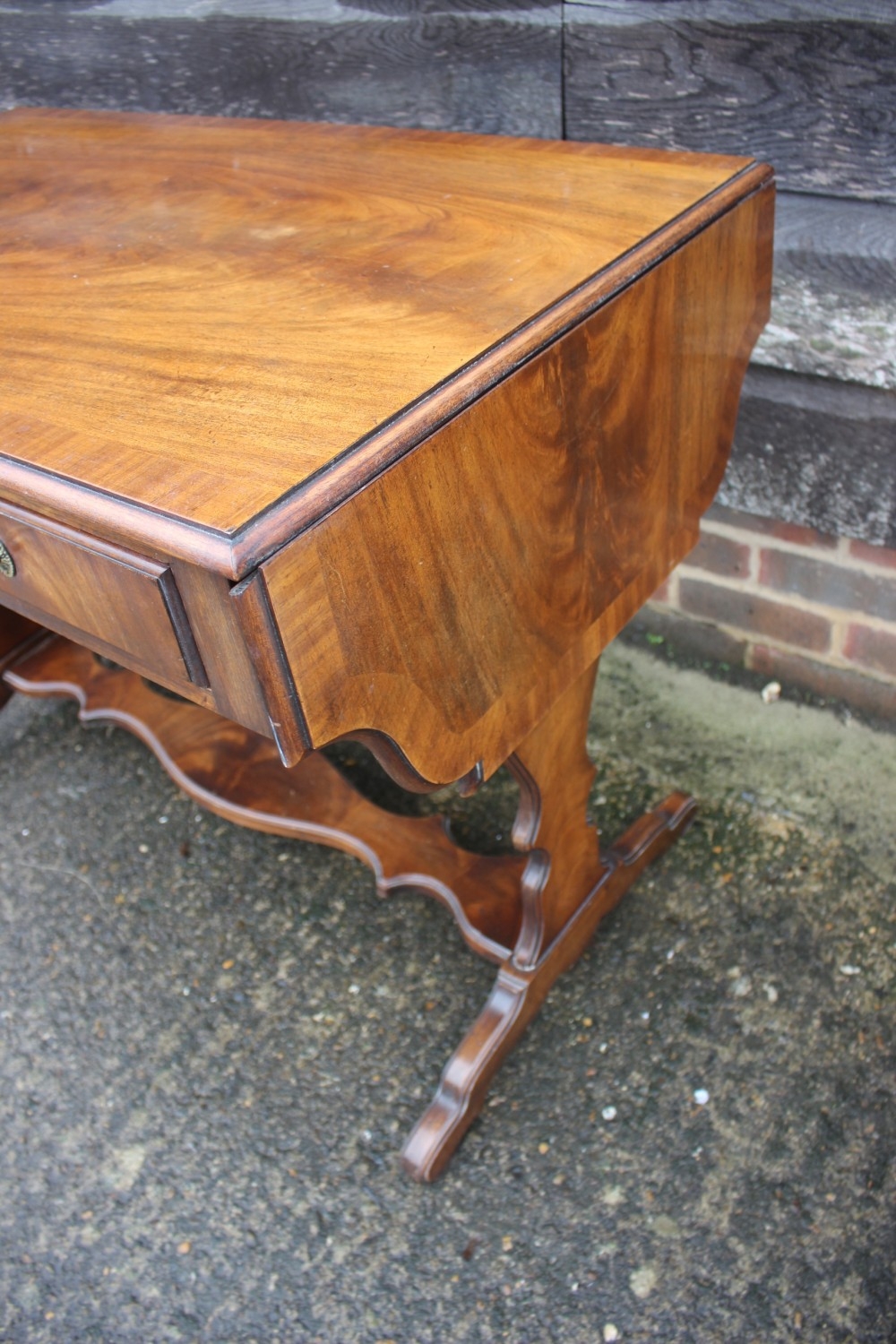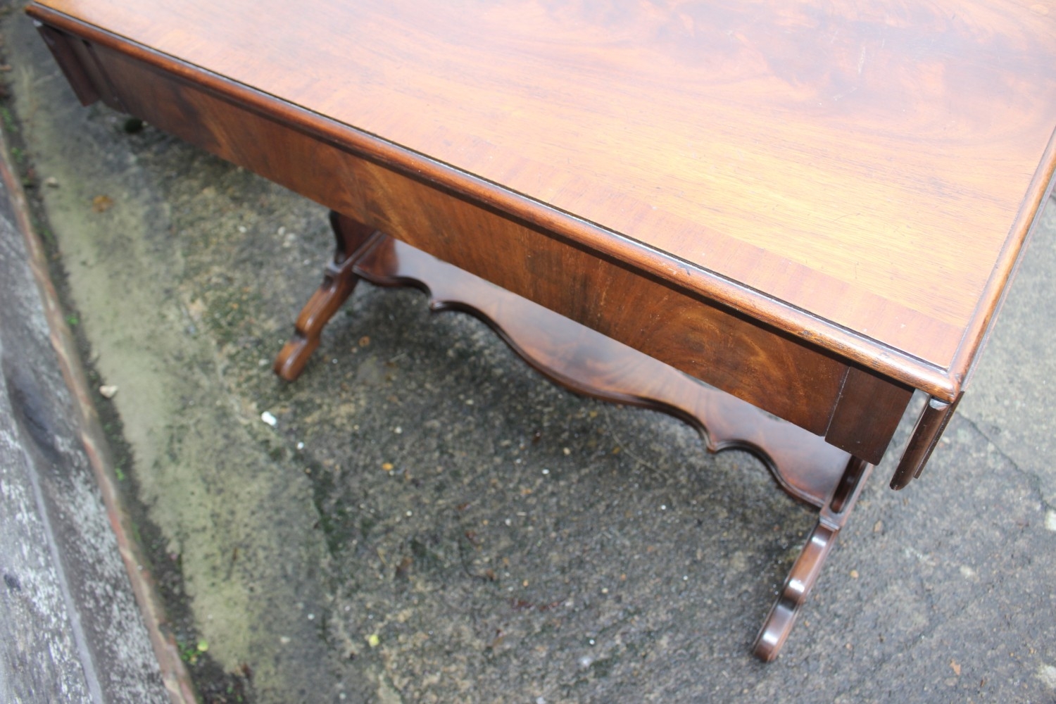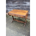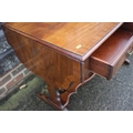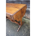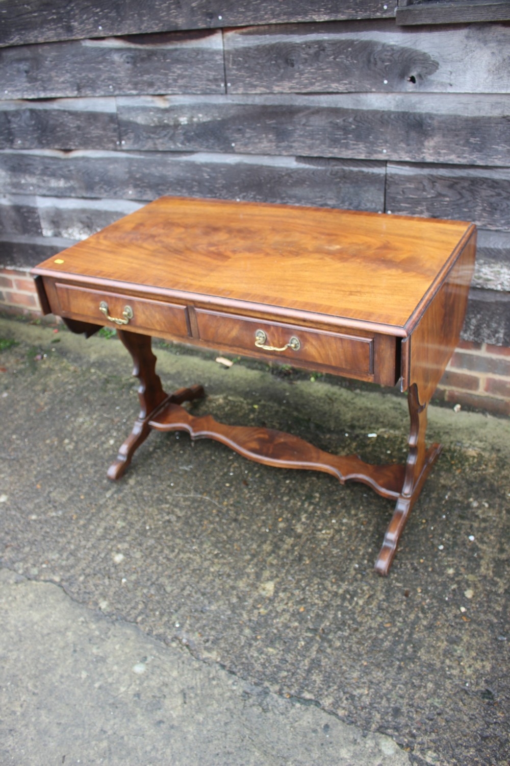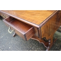 A mahogany and banded drop-flap sofa table, fitted two drawers, on shaped supports, 58" wide x 23" deep x 29" high