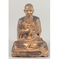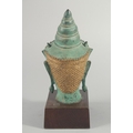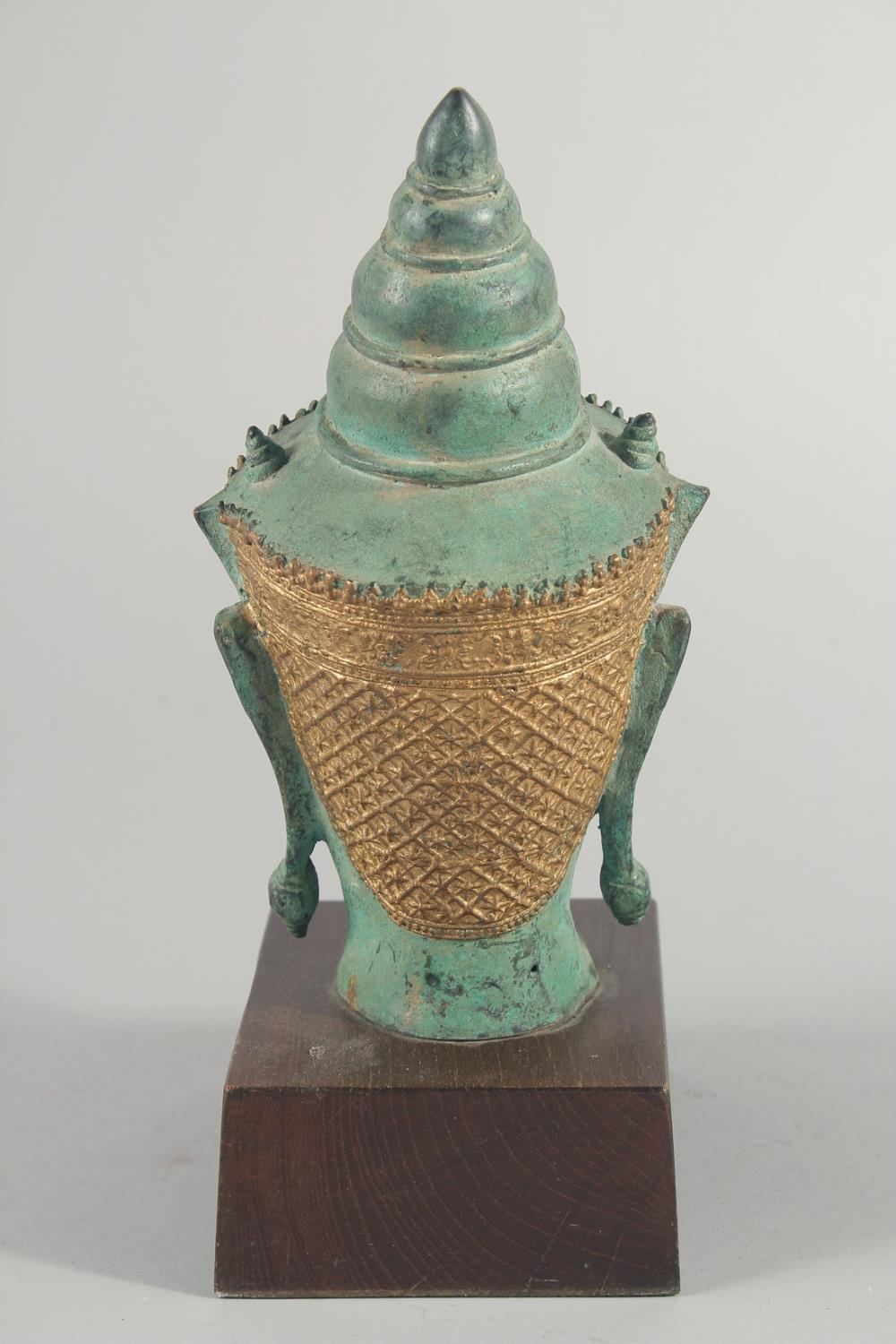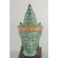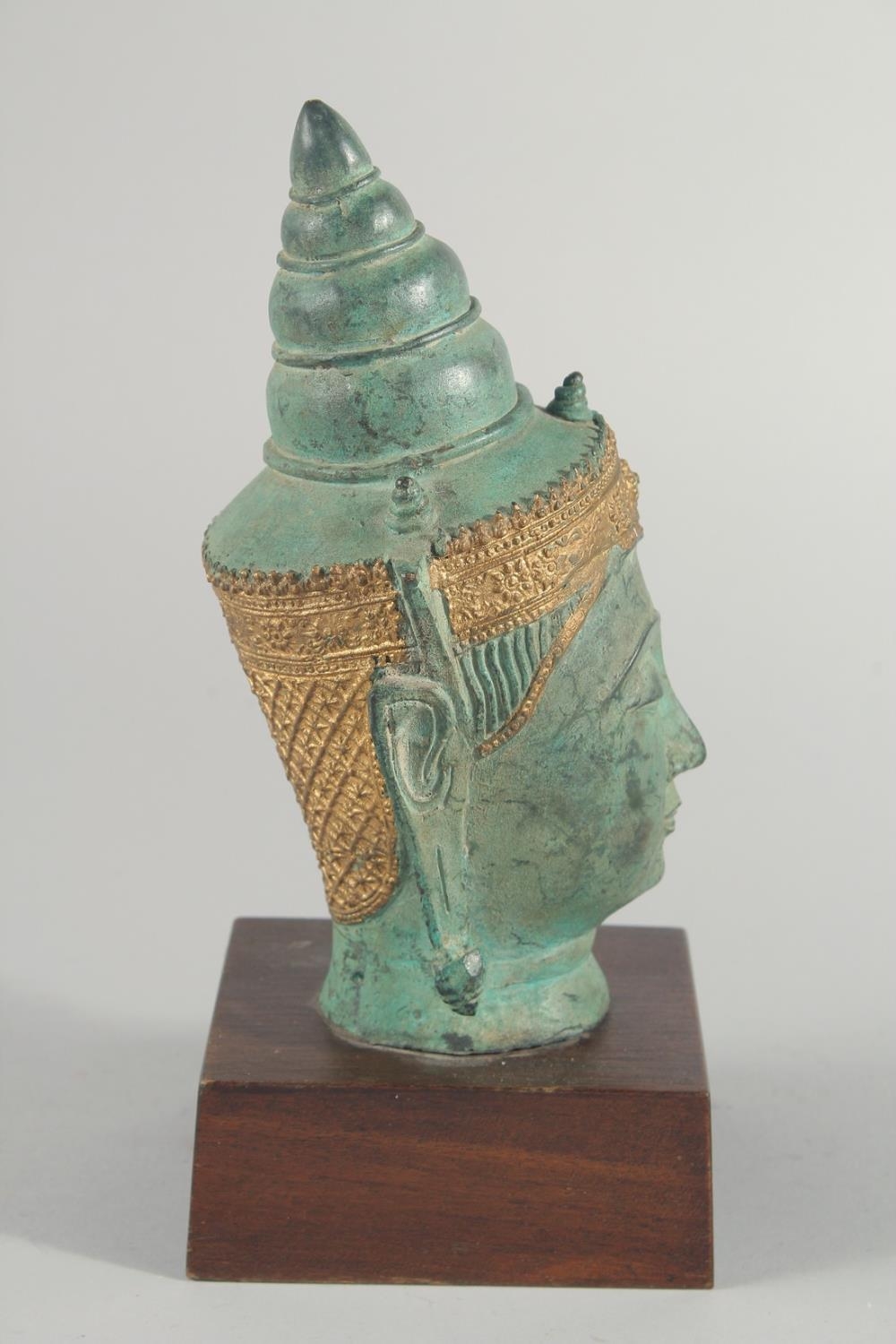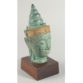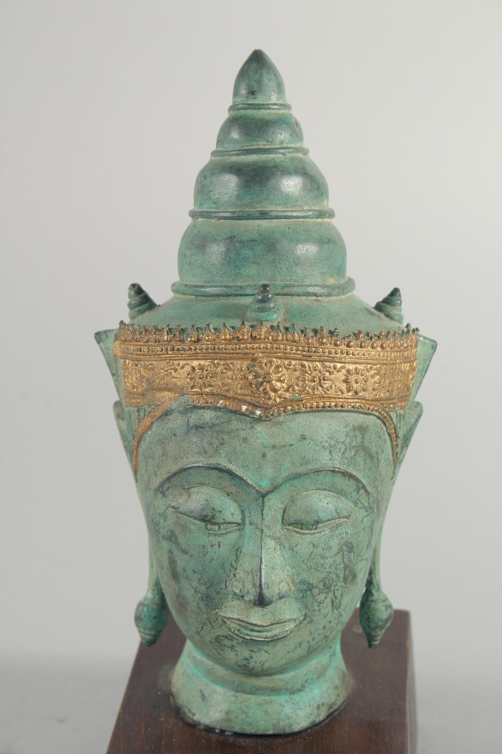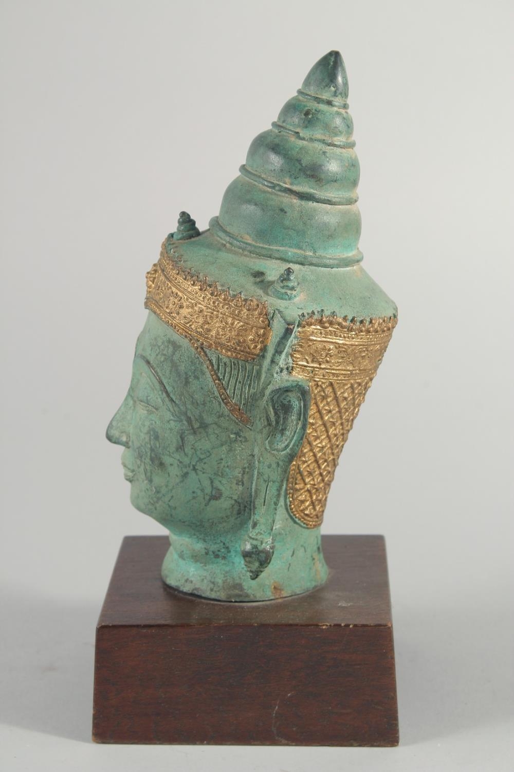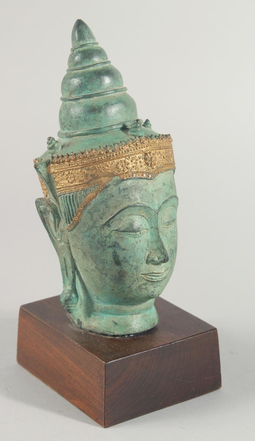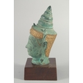 A THAI METAL BUDDHA HEAD, with gilded headpiece and mounted to a wooden base, head 22cm high.