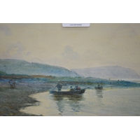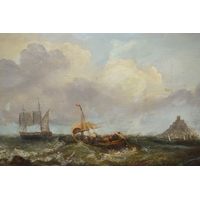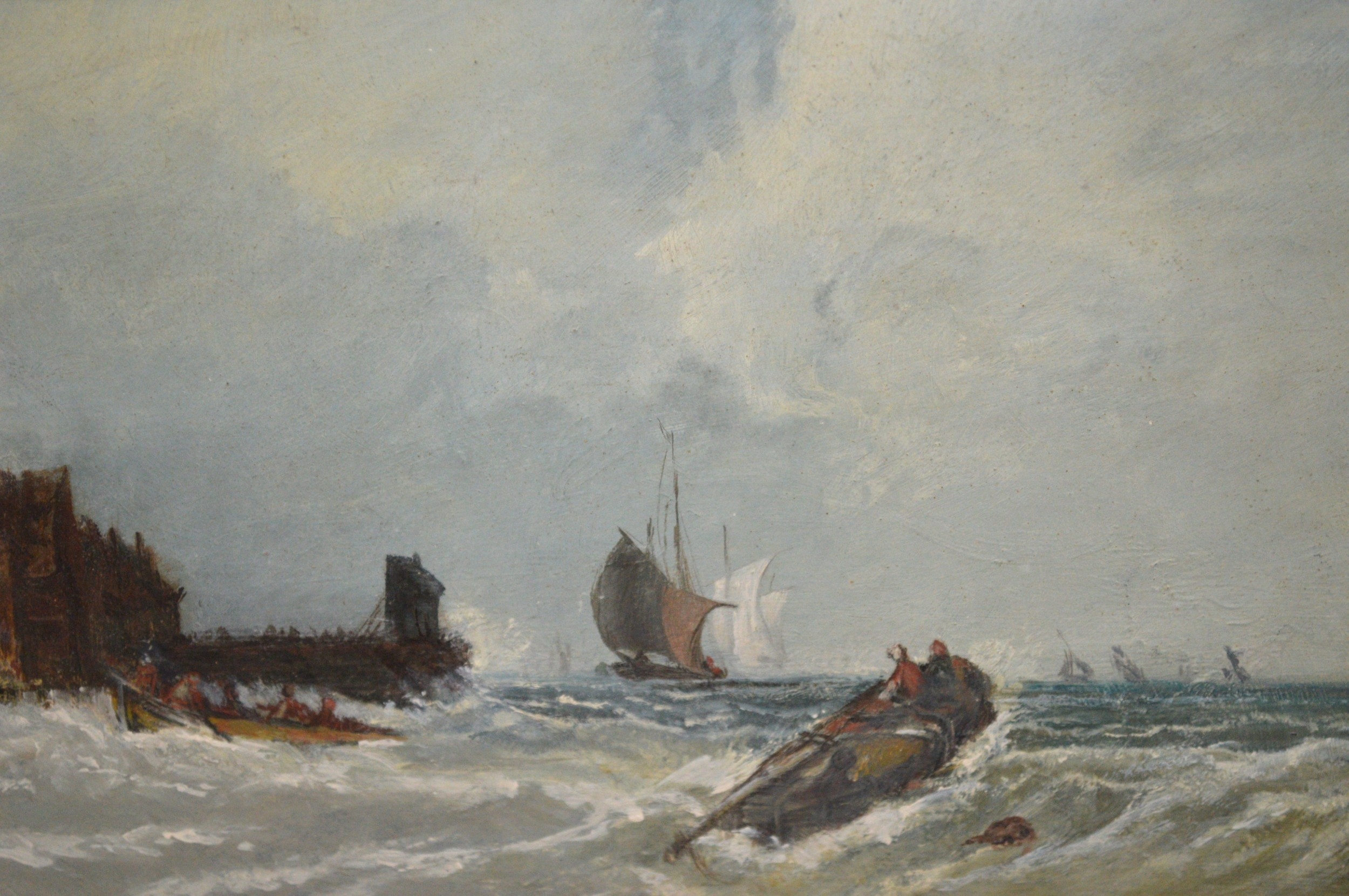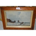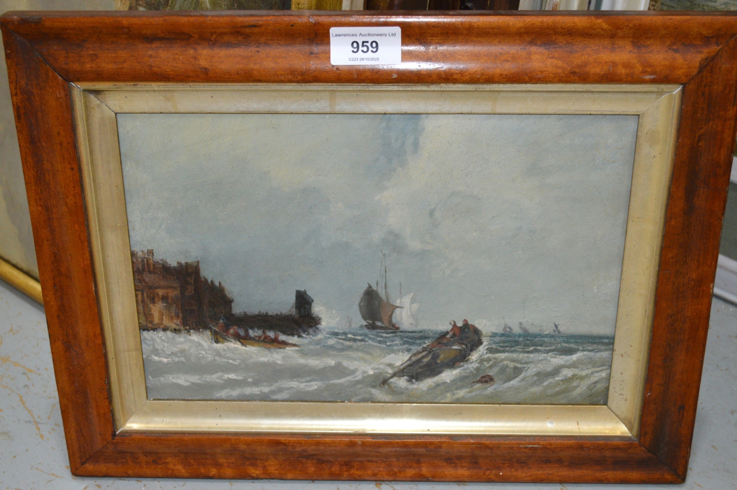 19th Century, maplewood framed oil painting on millboard, maritime scene with mixed shipping near coastal dwellings, 20 x 30cm