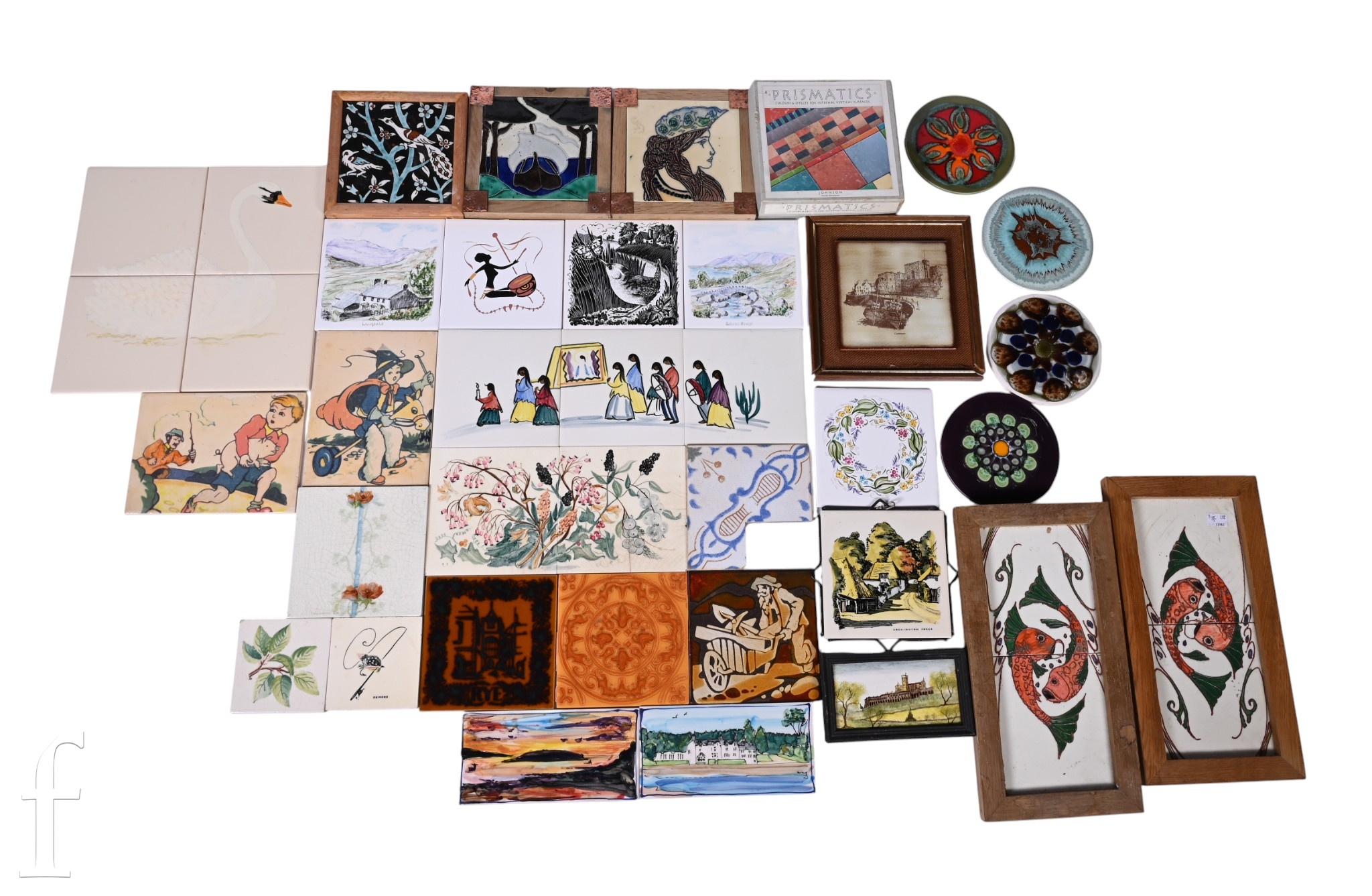 A collection of 1950s and later dust pressed tiles, landscapes, figural and abstract. (qty)