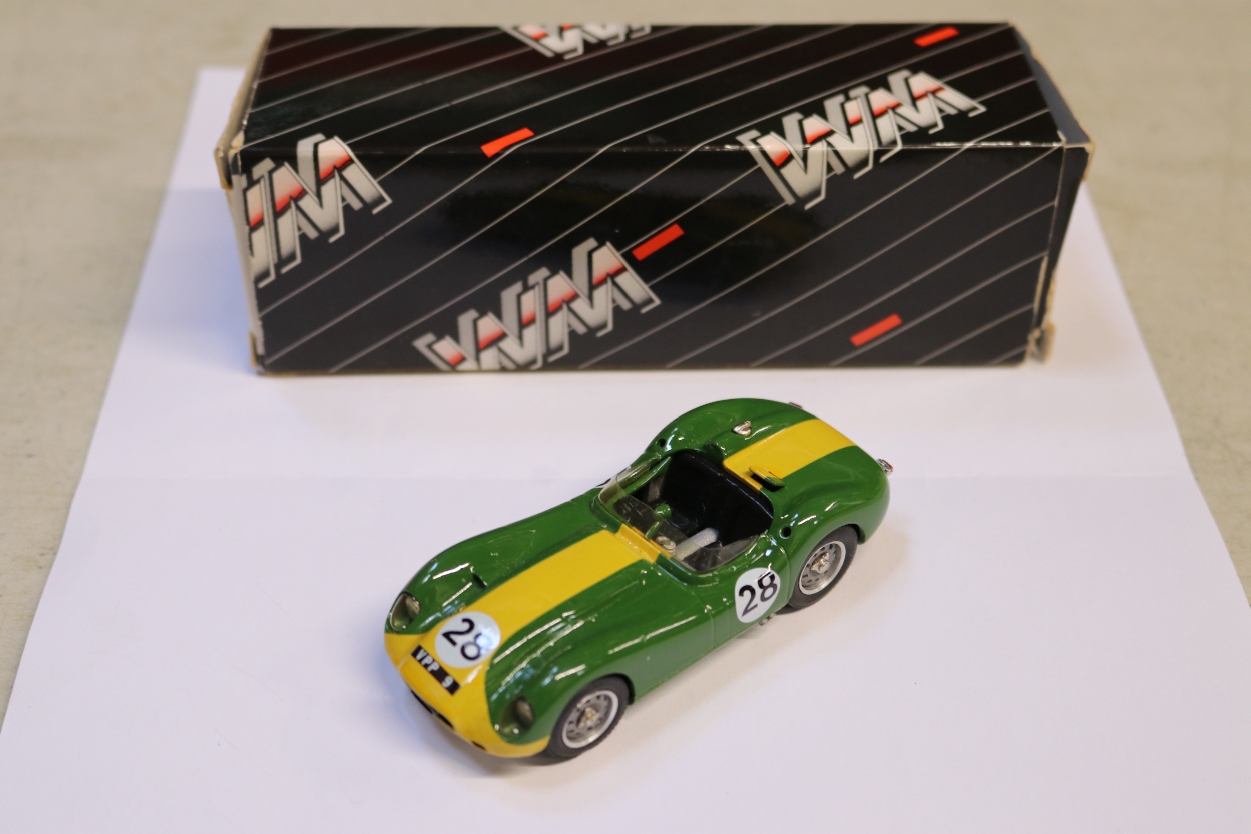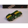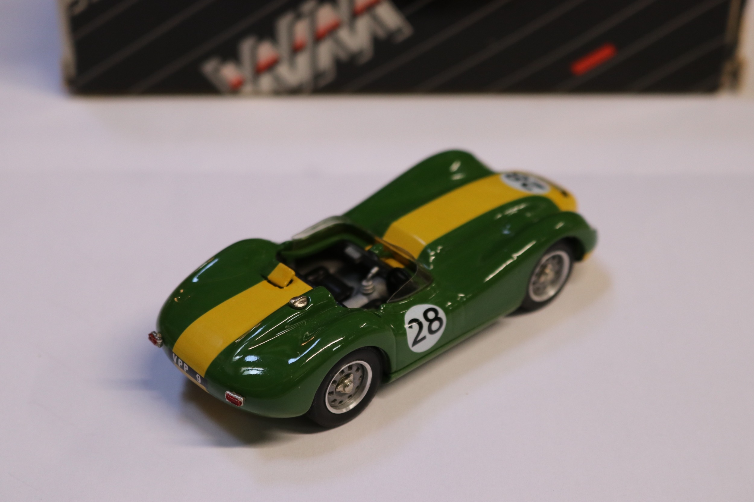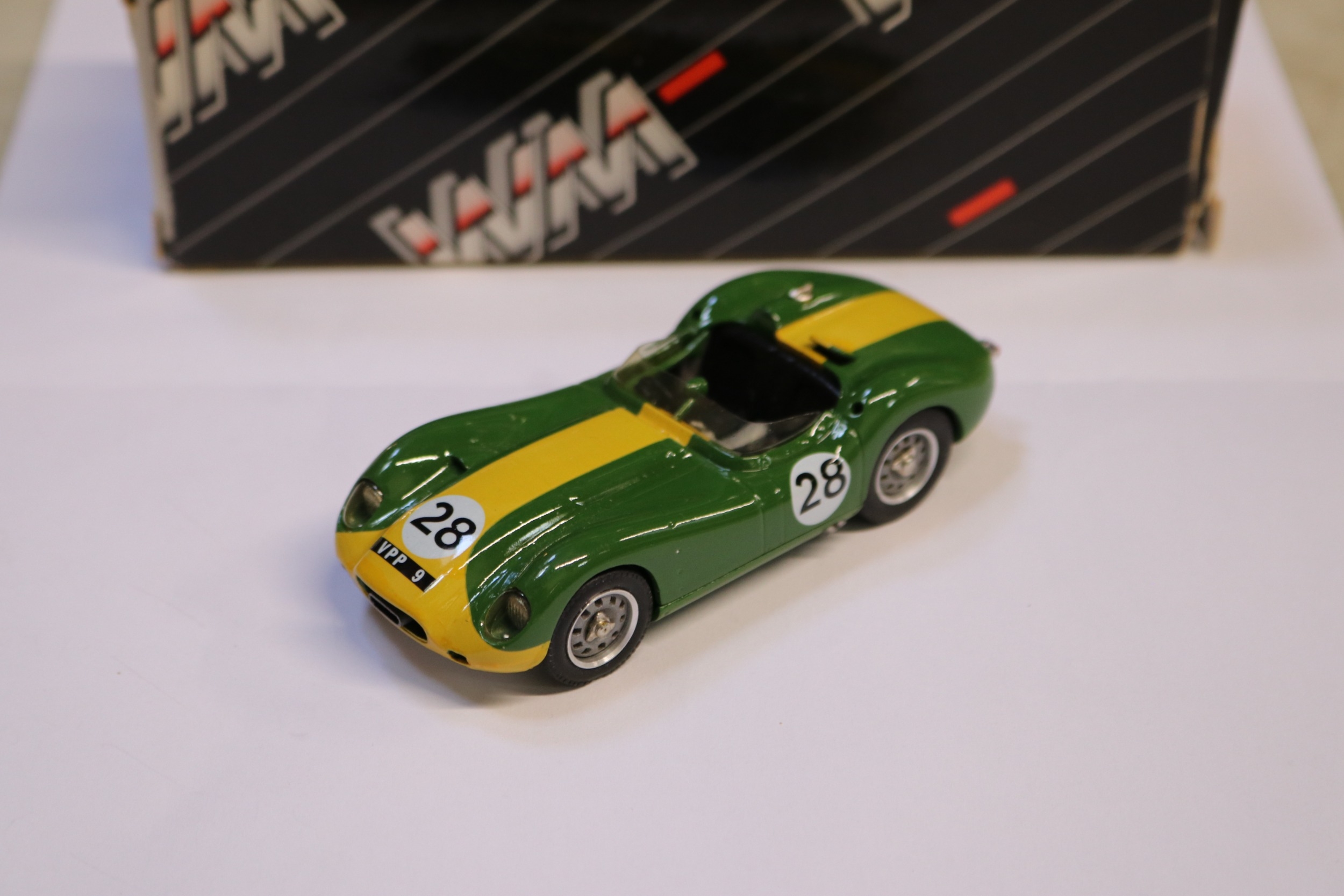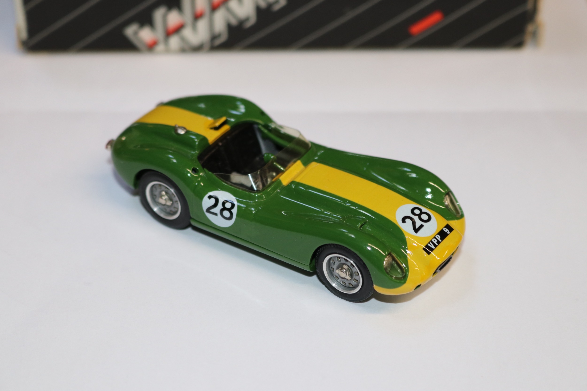 A Western Models 1958 Lister Jaguar (WRK 45). In green with yellow racing stripe, RN28, fitted with wire wheels and black rubber tyres. Boxed. Vehicle VGC-Mint. £40-60