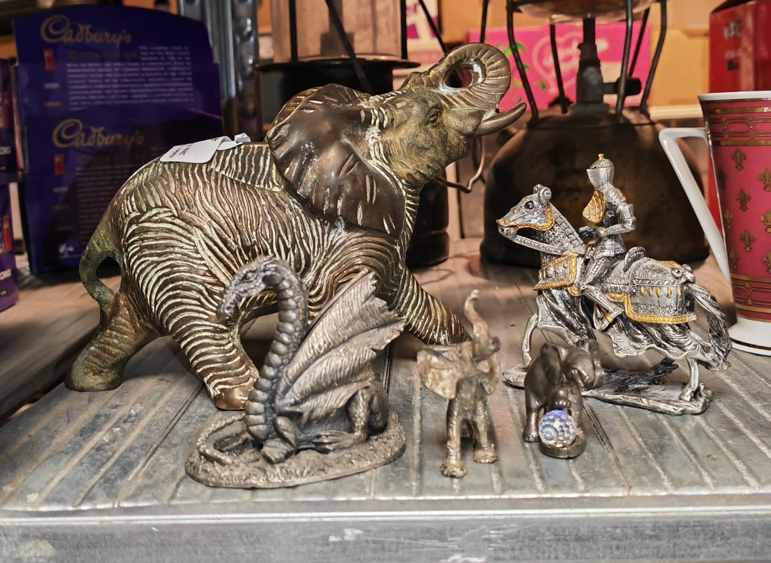 Selection Of Metal Items Including Elephants, Knight On Horse And Dragon