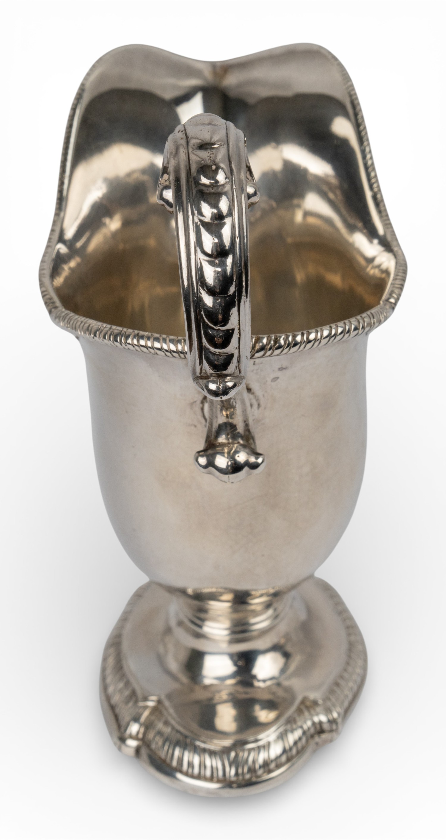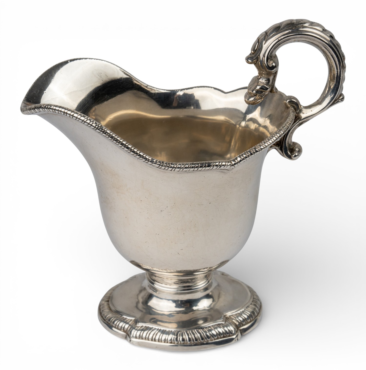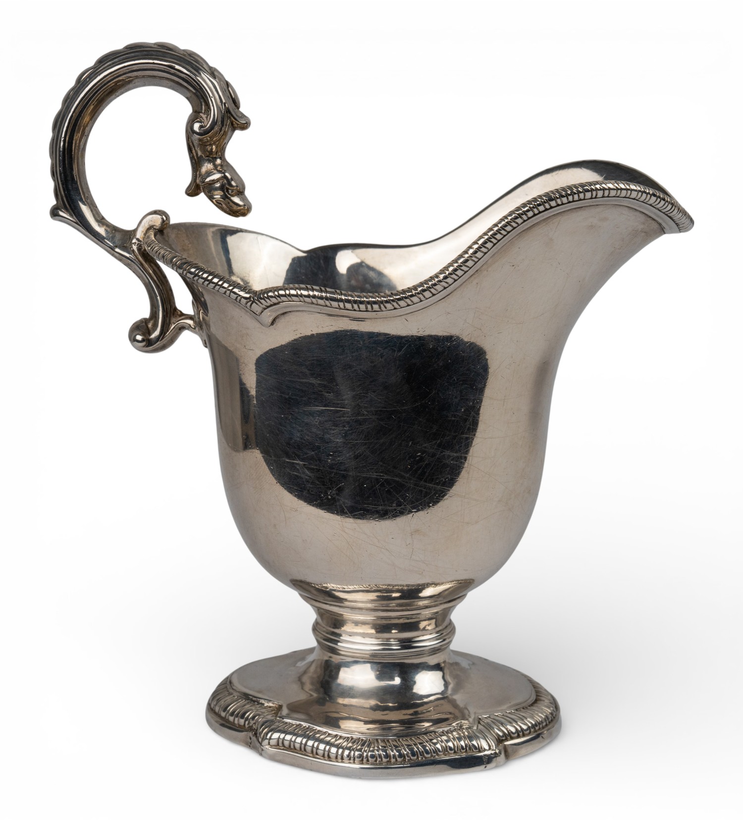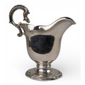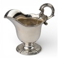 A silver gravy boat, with animal handle and on an oval-shaped pedestal. Hallmarked London, 1757. With indistinct maker's mark.