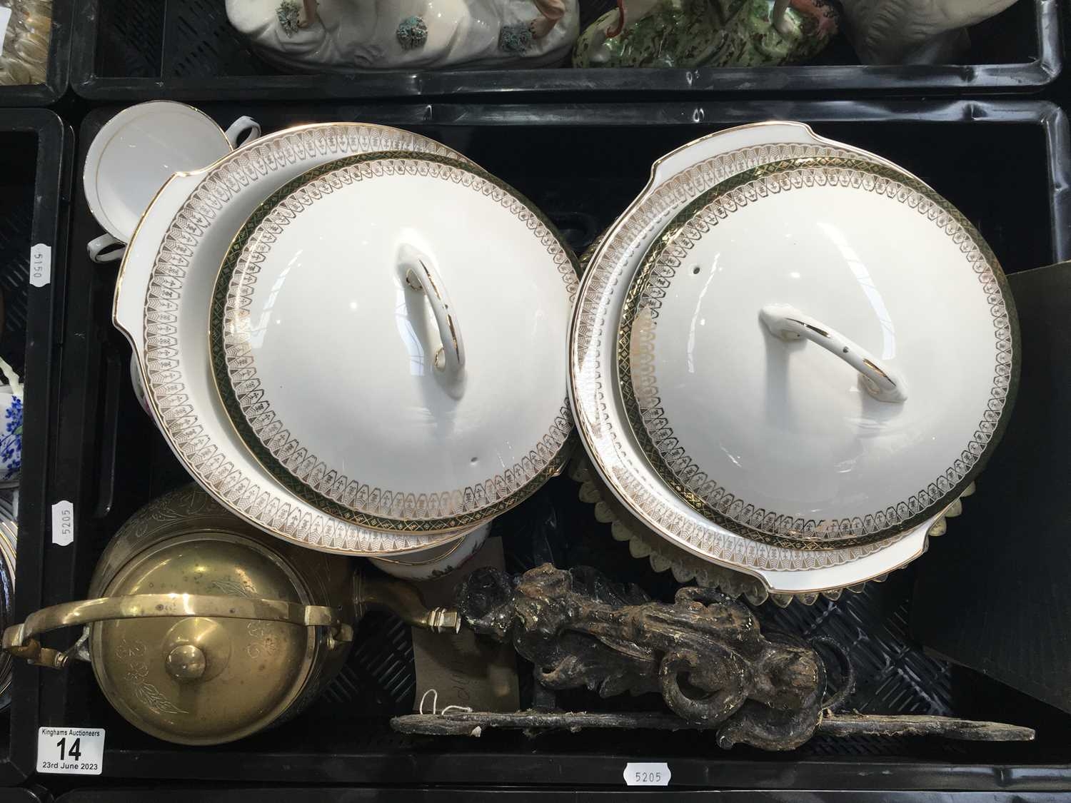 Ceramics and metal ware, including two Grafton Majestic tureen and covers, Ridgway Potteries part tea service, cast iron door knocker and brackets, and a book Britain's Wonderful Fighting Forces