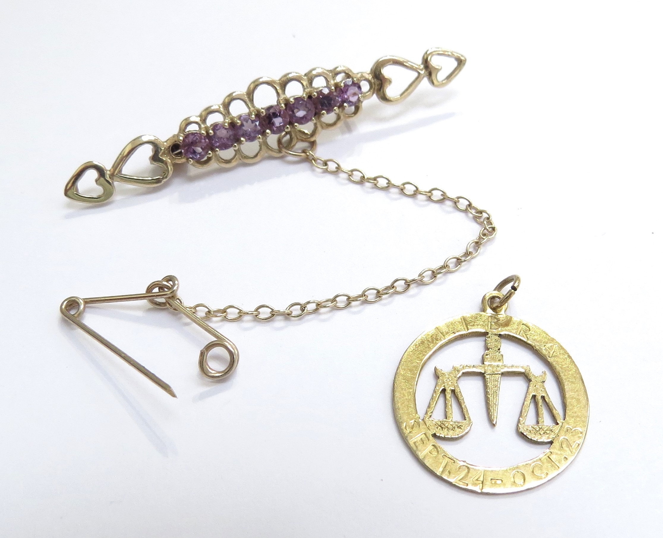 A 9ct gold 'Libra' pendant and a 9ct gold amethyst brooch, 3.2g total (2)