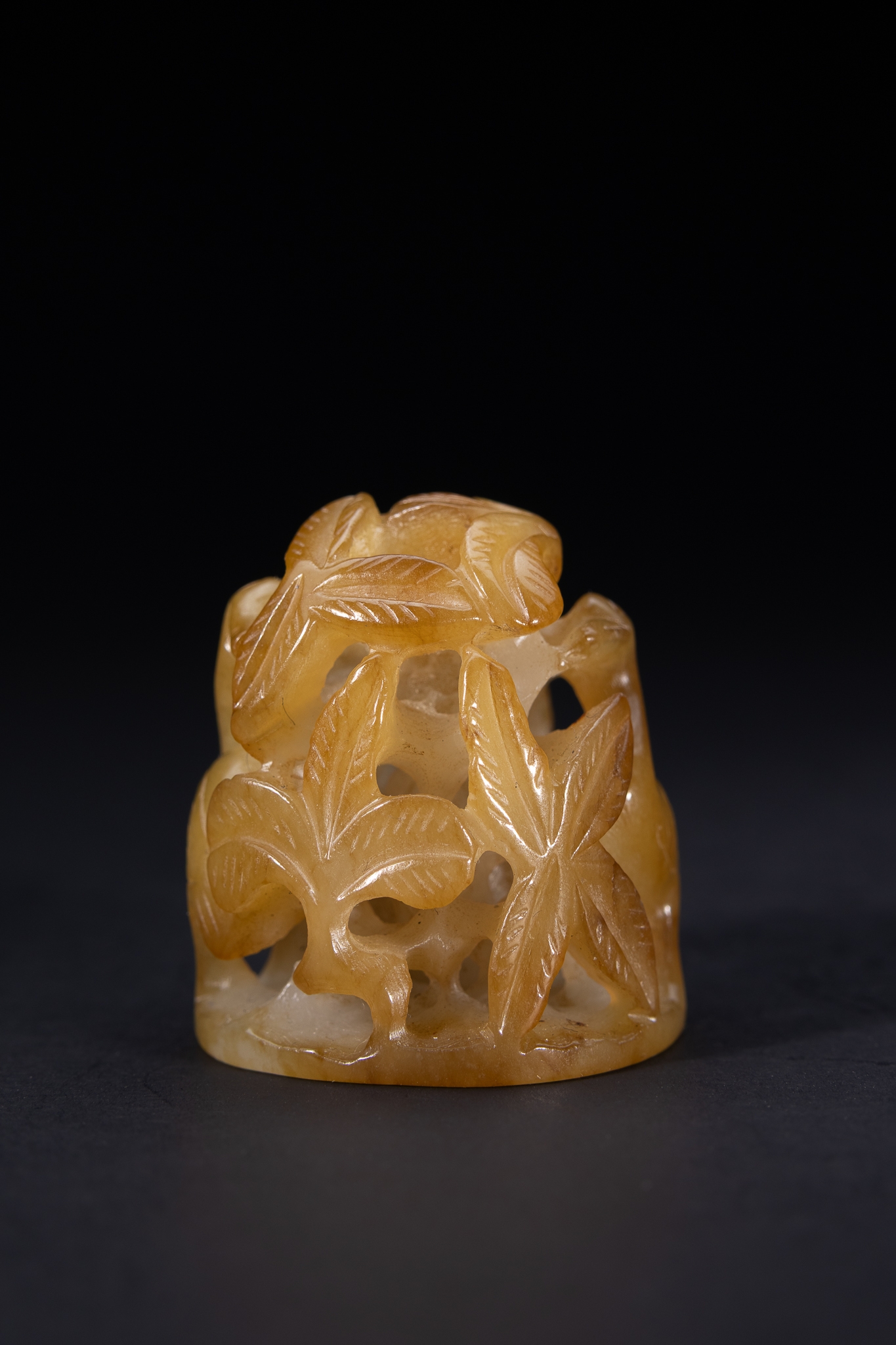 The piece is carved from translucent yellow jade, worked in openwork relief to form a cylindrical structure. The exterior is decorated with stylised birds shown in profile, their bodies rounded and softly modelled, with incised feather details. The birds are interspersed with scrolling foliage and leaves that pierce through to the interior, creating a layered, pierced effect.