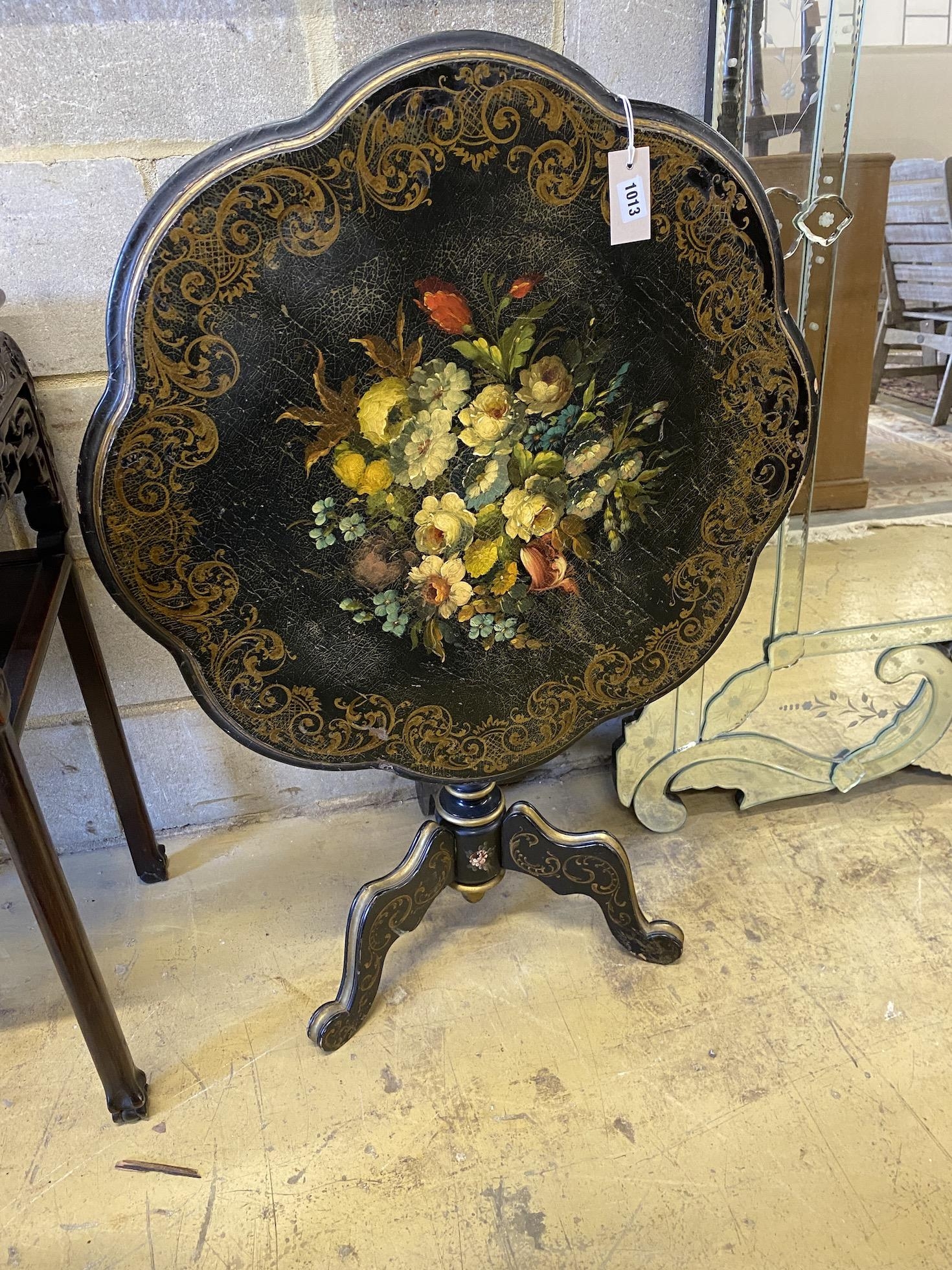 A Victorian style circular floral painted tilt top tripod table, width 68cm, height 66cm
