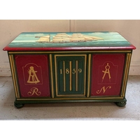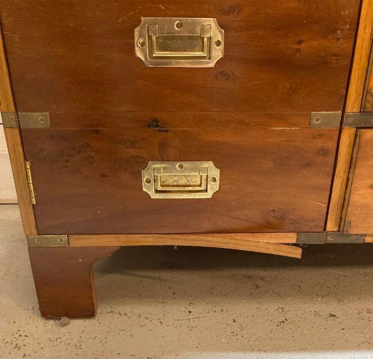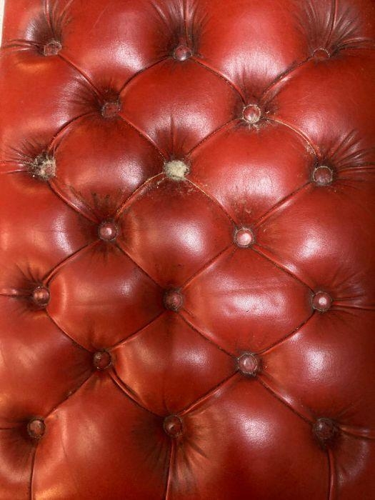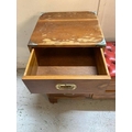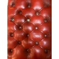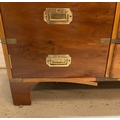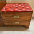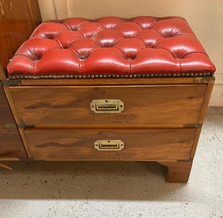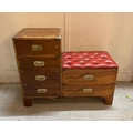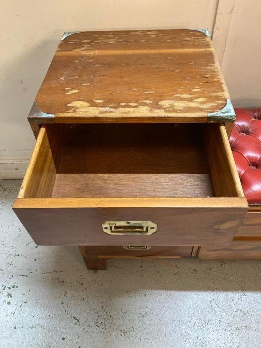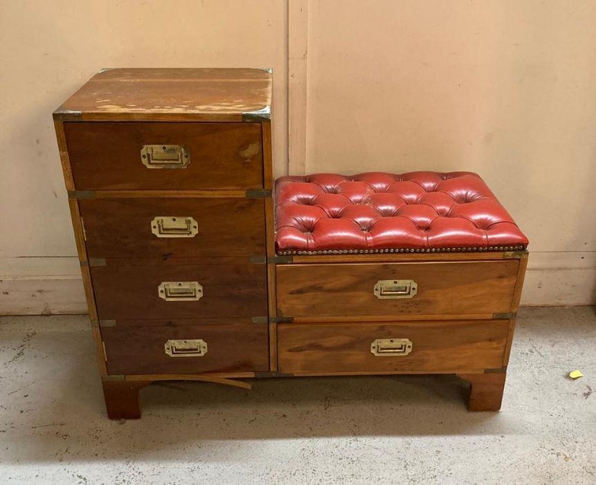 A military campaign style telephone bench with red leather buttoned seat AF (H72cm W90cm D37cm)