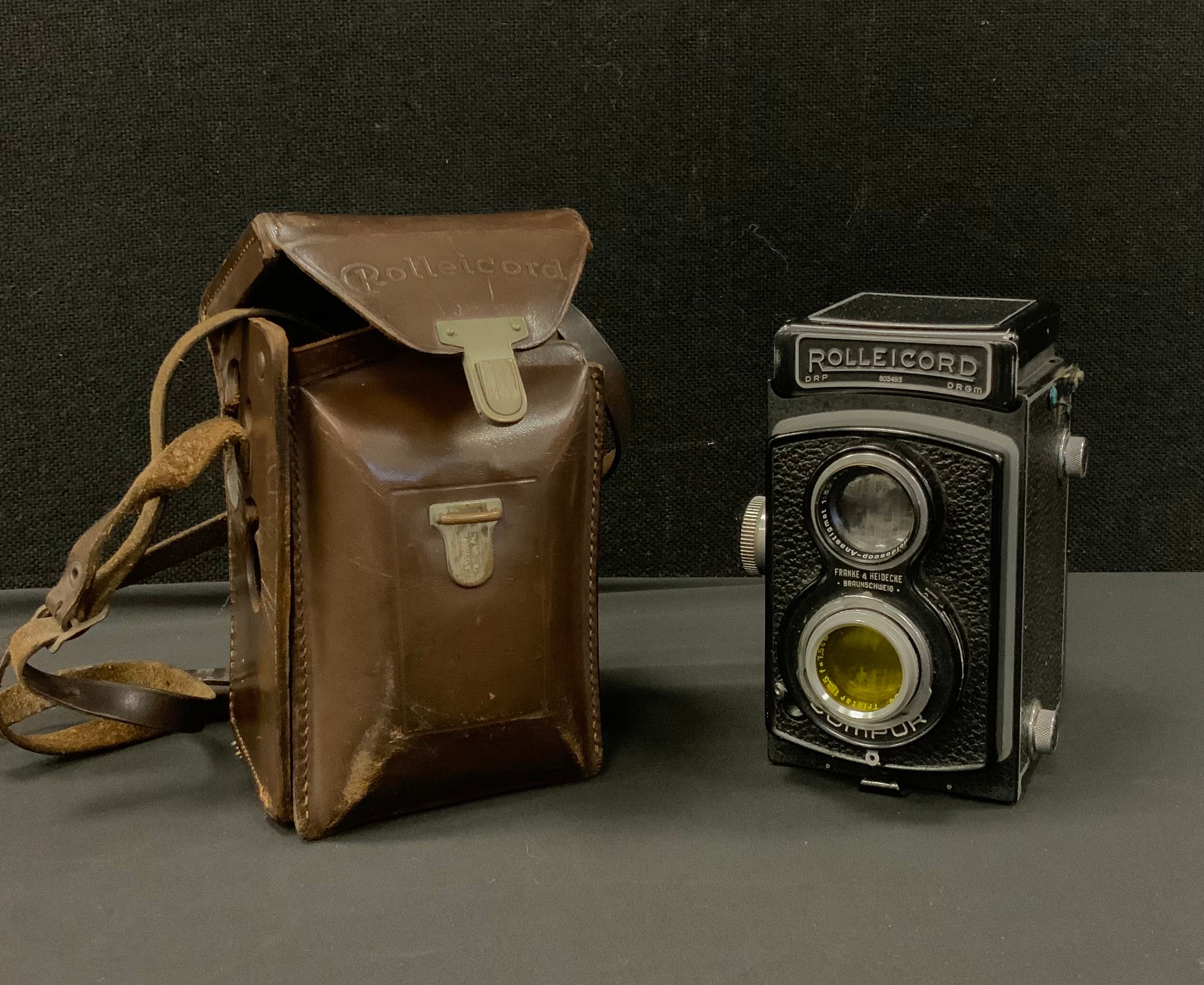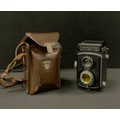 A Rolleicord medium-format twin lens reflex camera made by Franke & Heidecke (Rollei) triotar 1:35, 7.5cm lens, case serial number 803493, lens serial no 786035/2409834, tan leather carry case