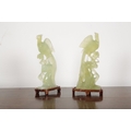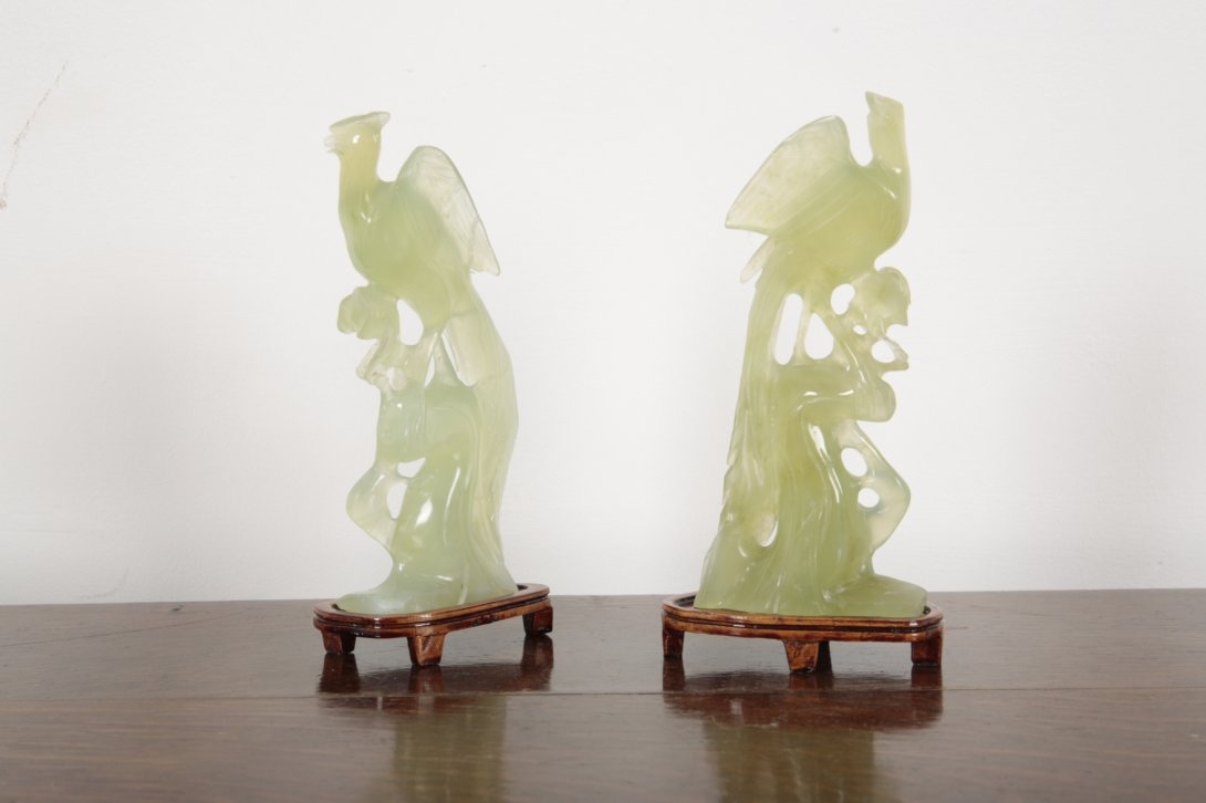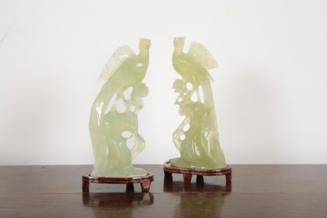 A PAIR OF CHINESE CARVED JADE BIRDS20th century, each figured naturalistically on tree stumps with flowers issuing, 18.5cm high, on wooden stands and boxed (2)