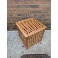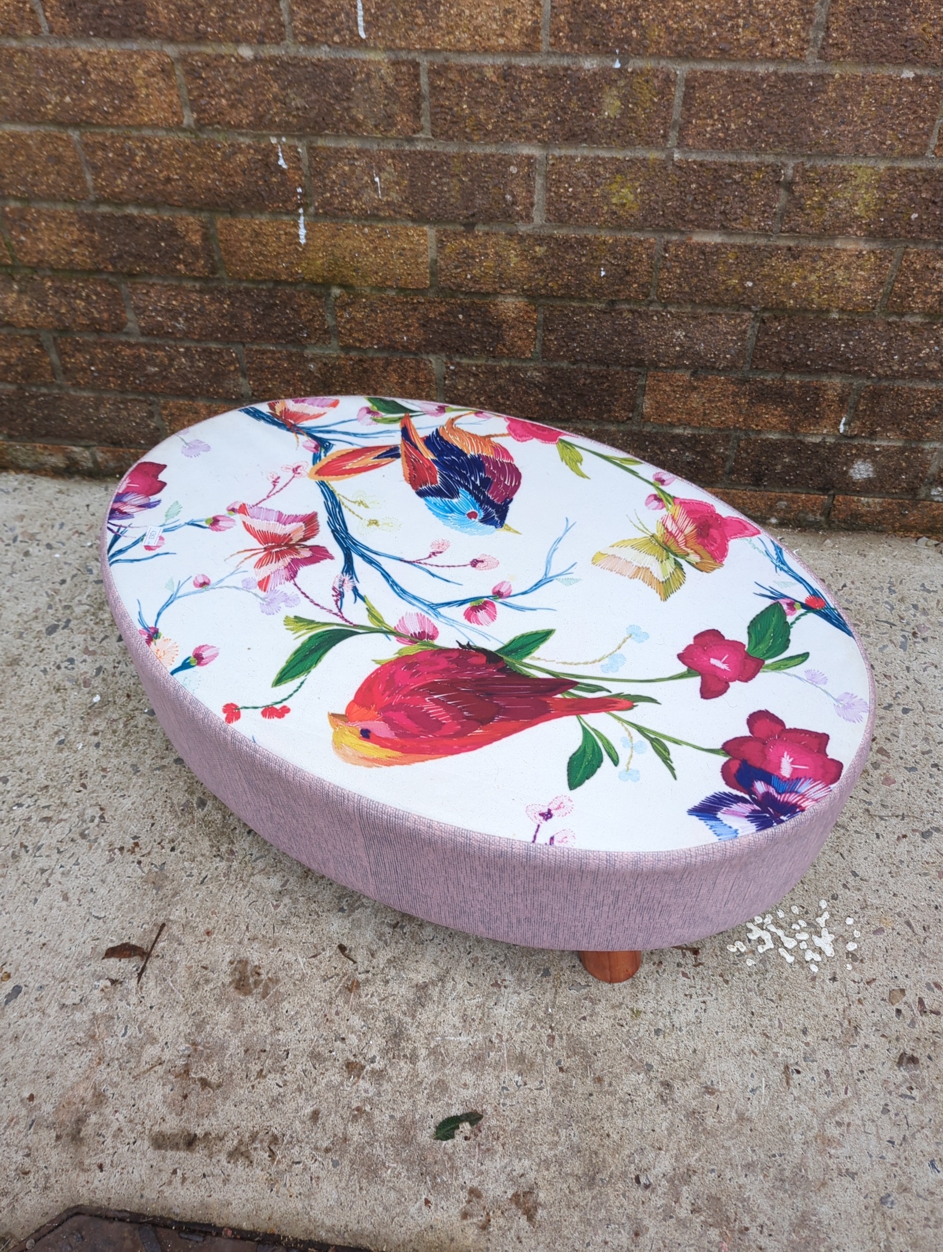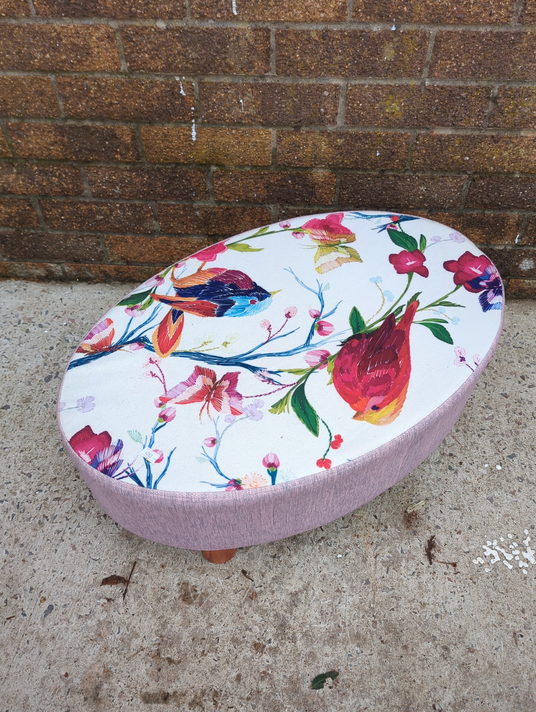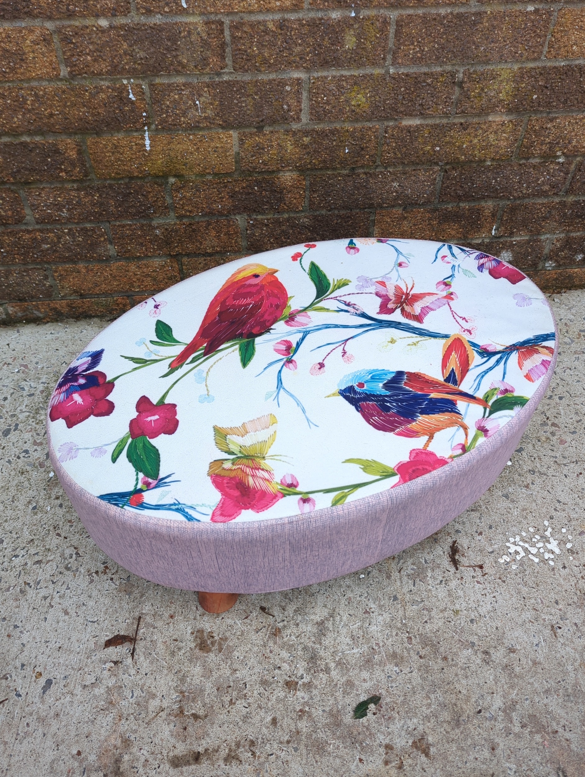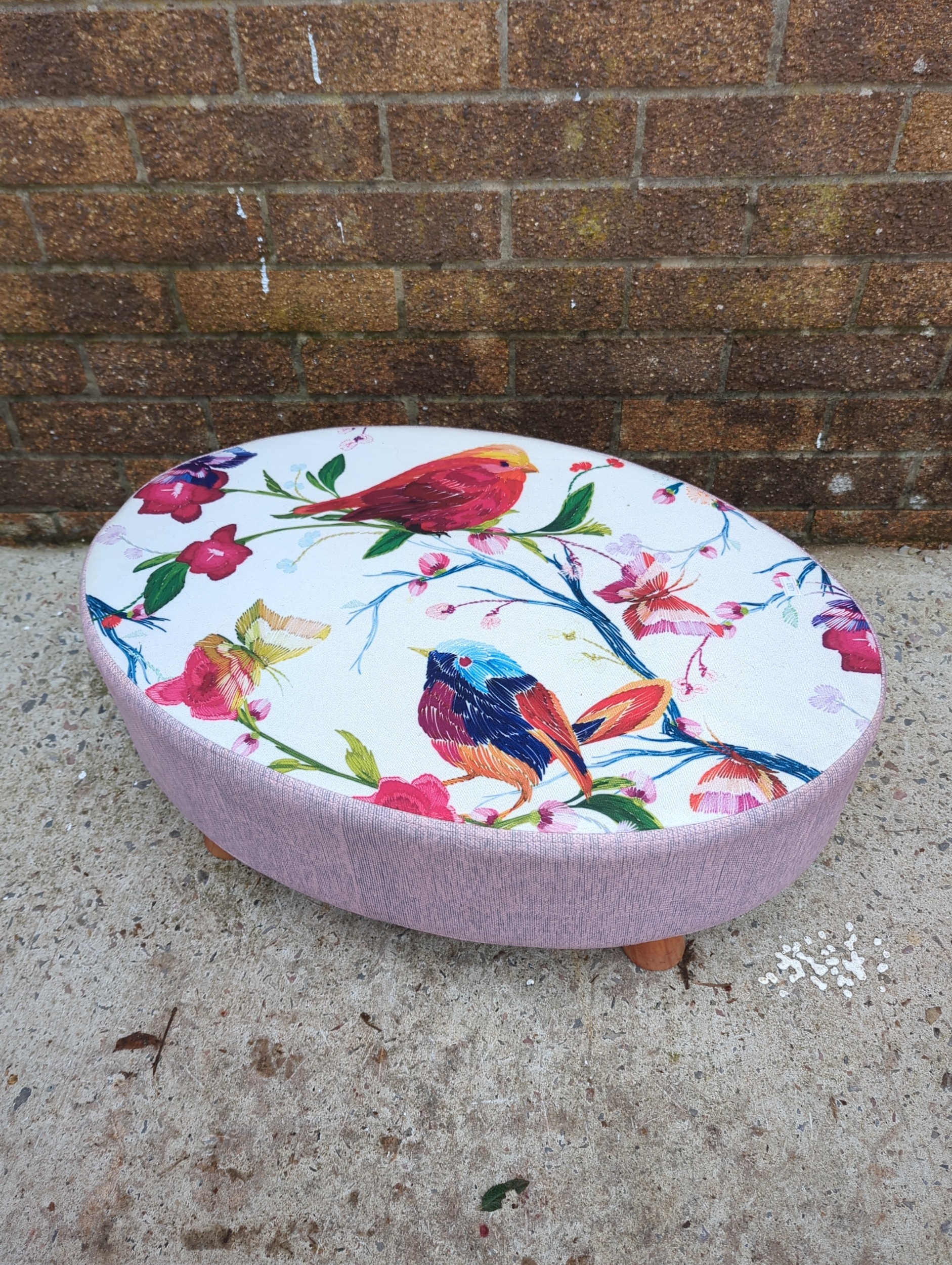 This is a round footstool featuring a colourful floral and bird design on the cushioned top. The sides are upholstered in a complementary pink fabric, and it stands on four small wooden legs, providing stable support. It would make a vibrant and functional addition to any room, ideal for resting feet or extra seating.