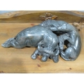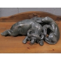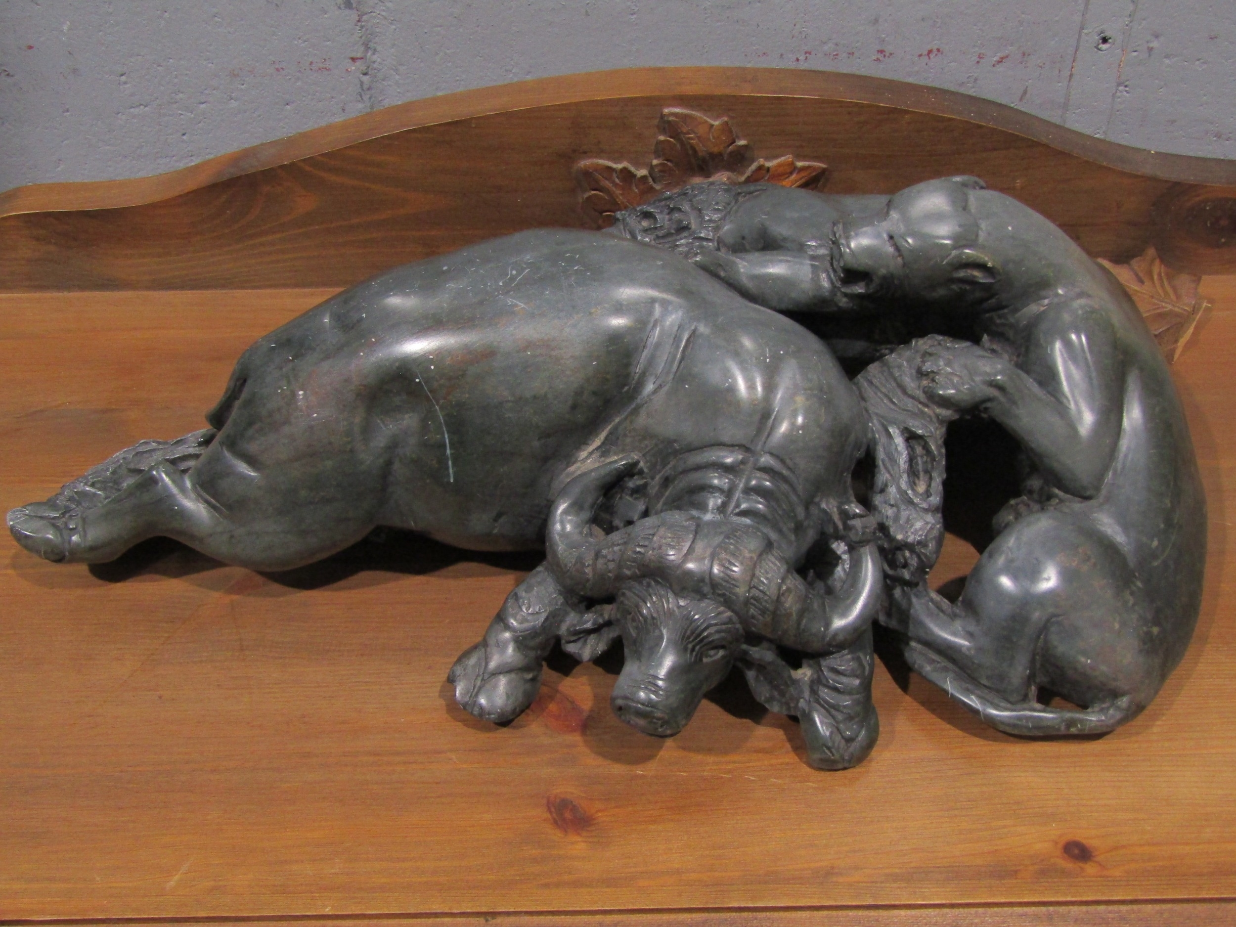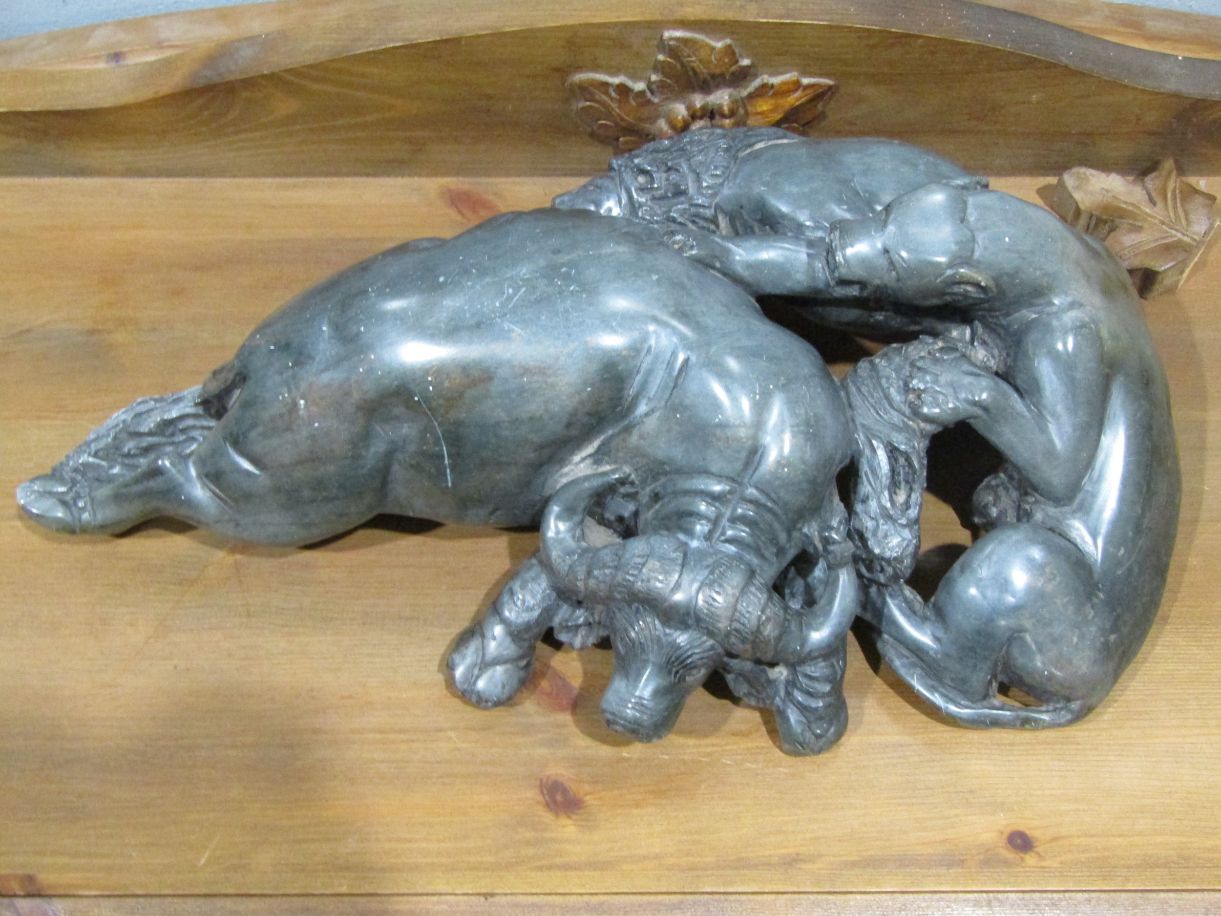 A stone carved animal scene of a lion and lioness attacking a buffalo, 40cm long