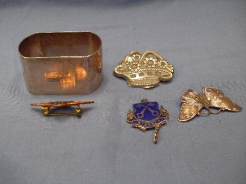 A COLLECTION OF SILVER ITEMS - BADGES AND NAPKIN RING