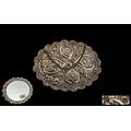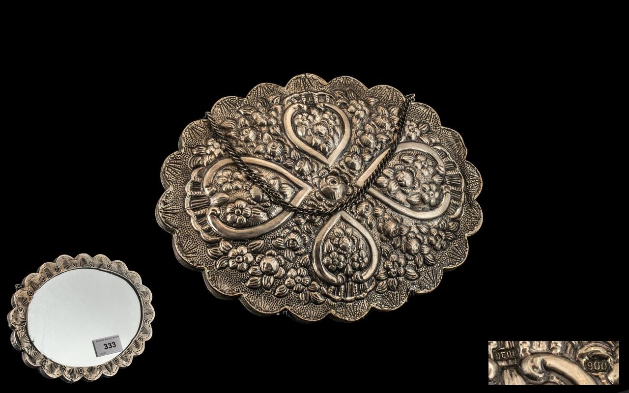 Turkish Silver Embossed Ottoman Design Shaped Hand Mirror, decorated to the body with flowers in garlands, with a stamped silver mark Bedo 900. 8'' wide x 6.5'' deep.