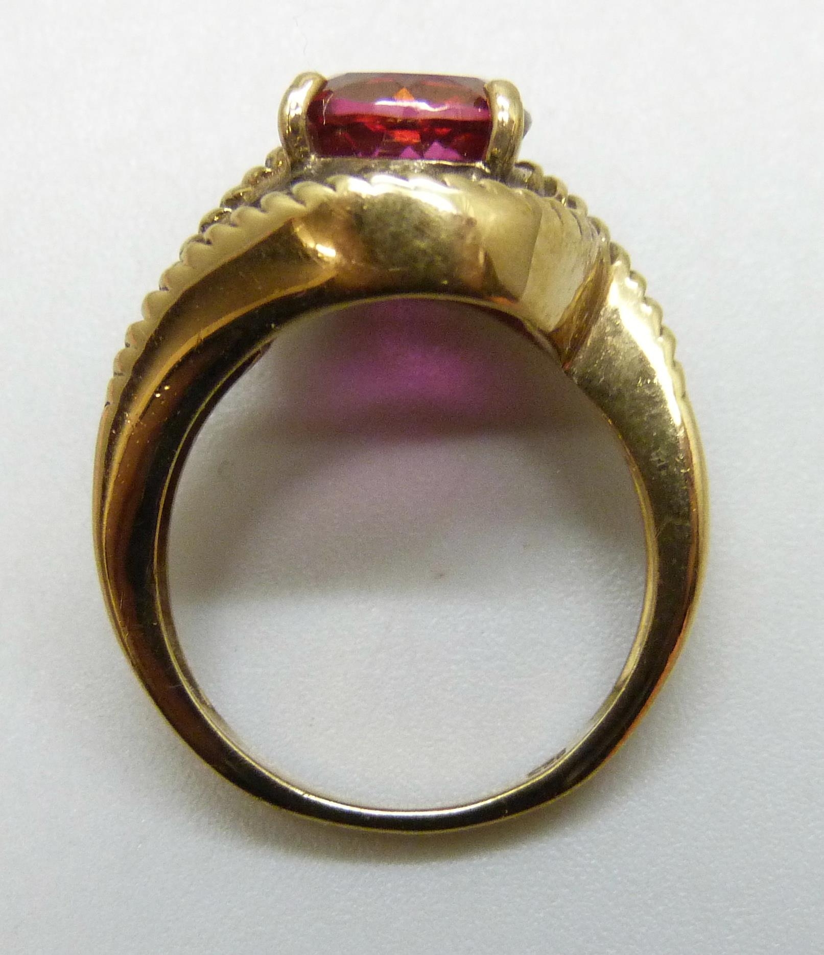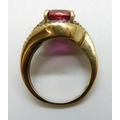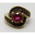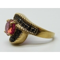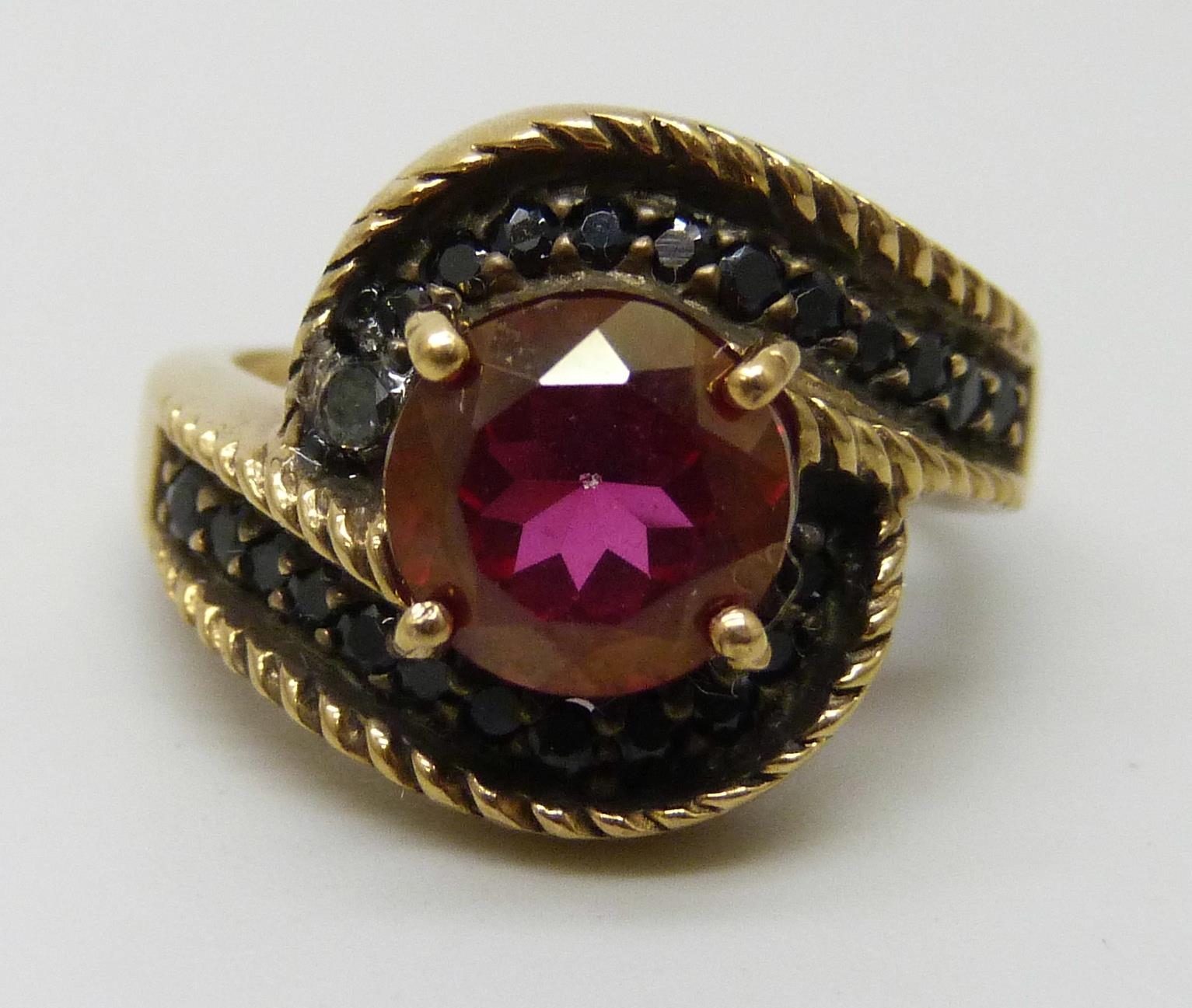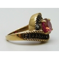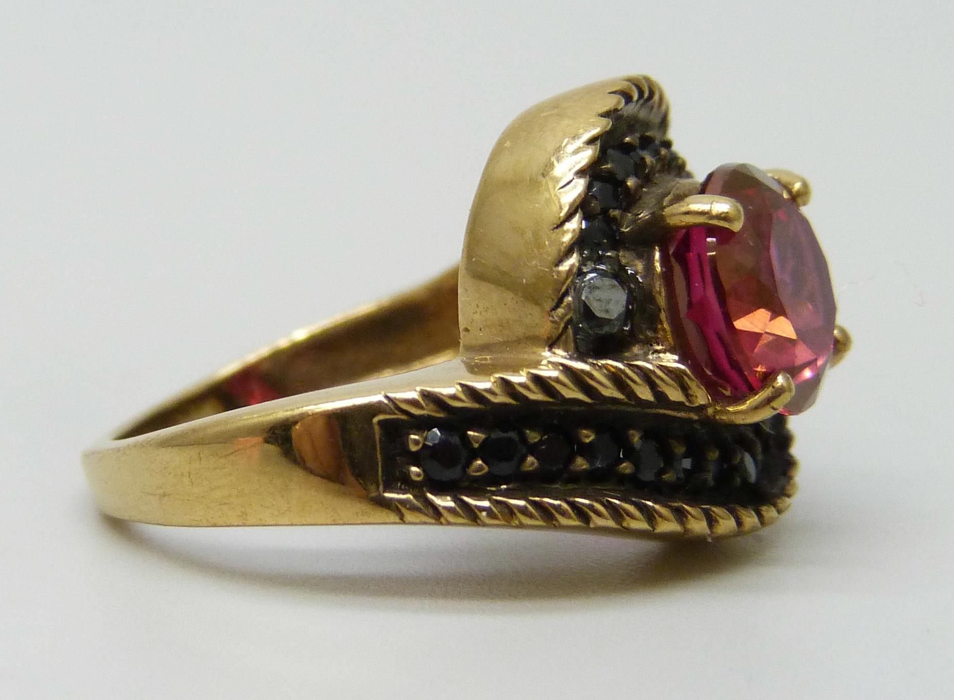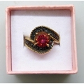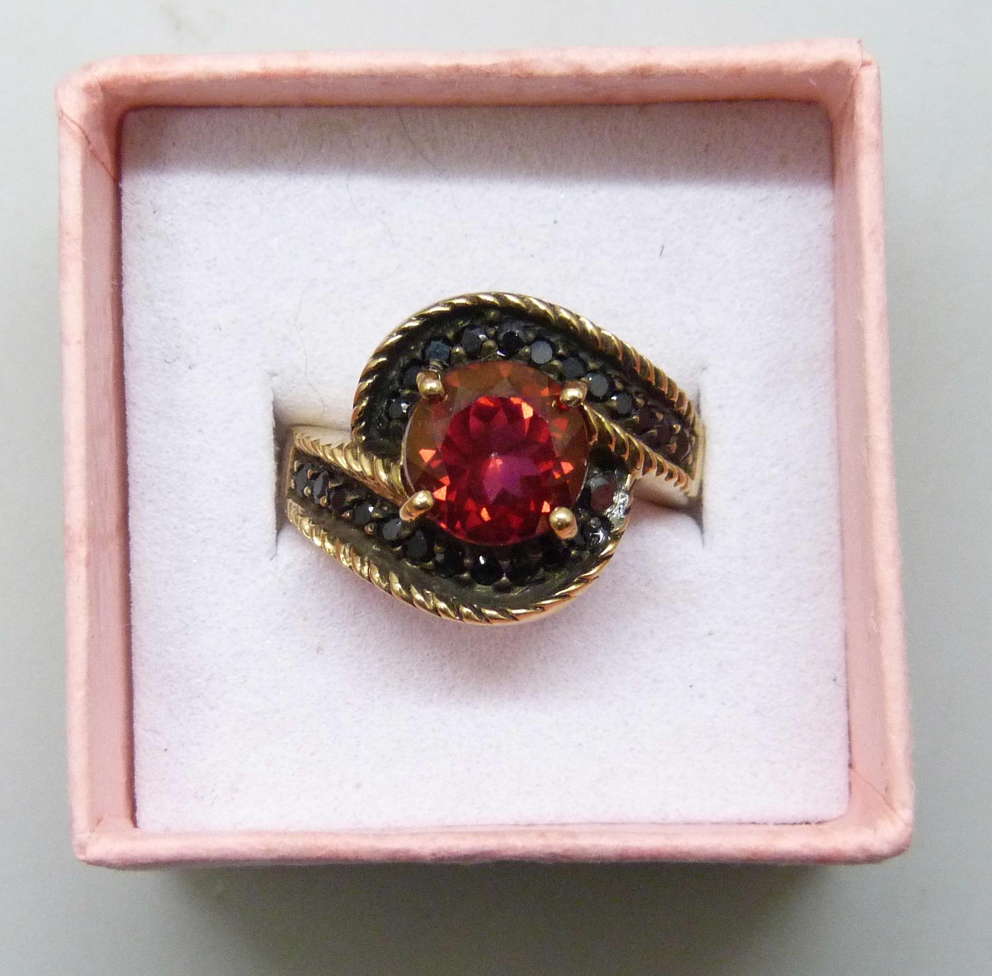 A silver gilt red and black stone ring, J