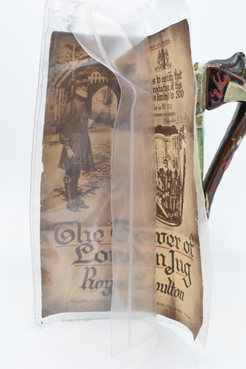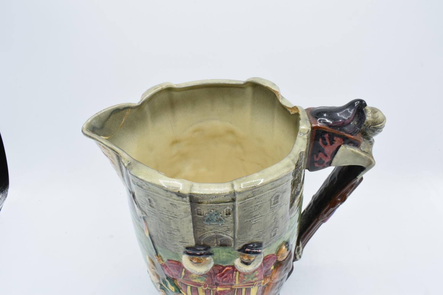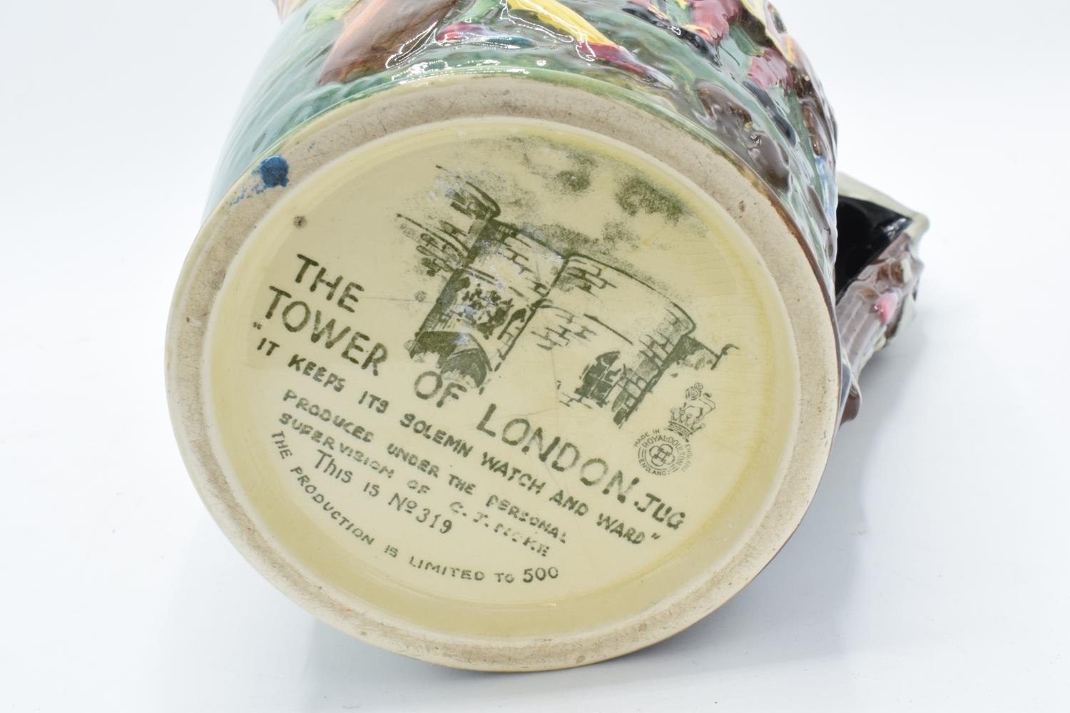 Royal Doulton embossed jug 'The Tower of London' jug 'It keeps Solemn Watch and Ward' with certificate. Number 319 of 500. 25cm tall It displays well however has suffered various damage during its life. The spout has been reglued whilst the top of the handle on the inside rim has been damaged/ chipped. There are a couple of other smalls chips as well as hairlines down the side and a star crack to the base.