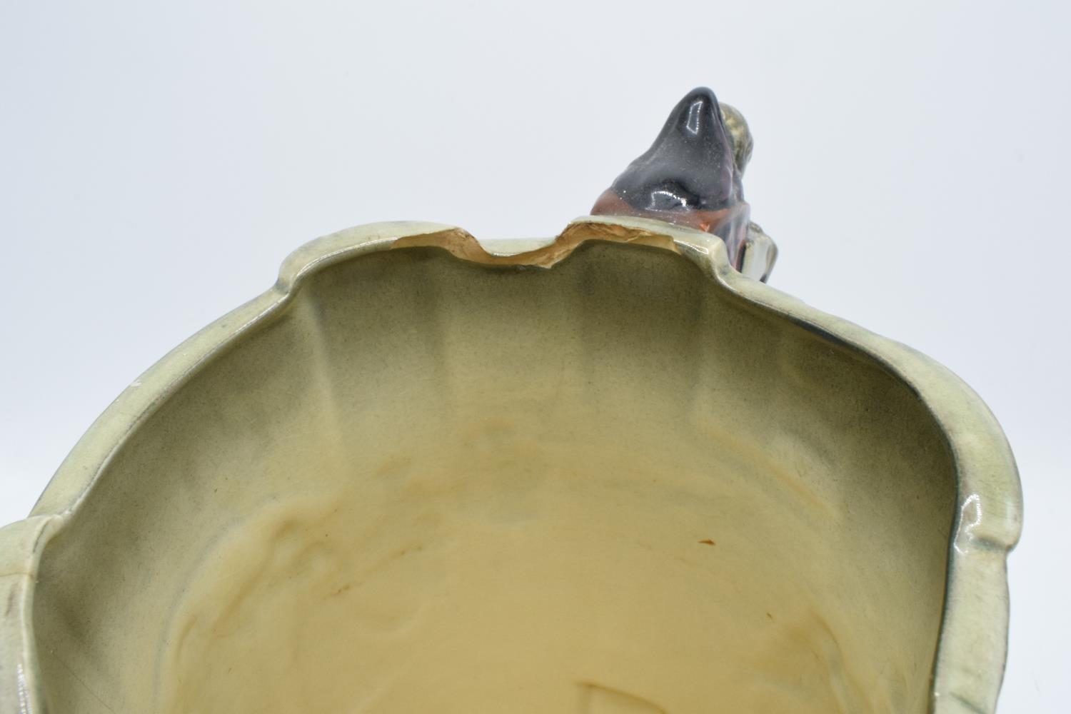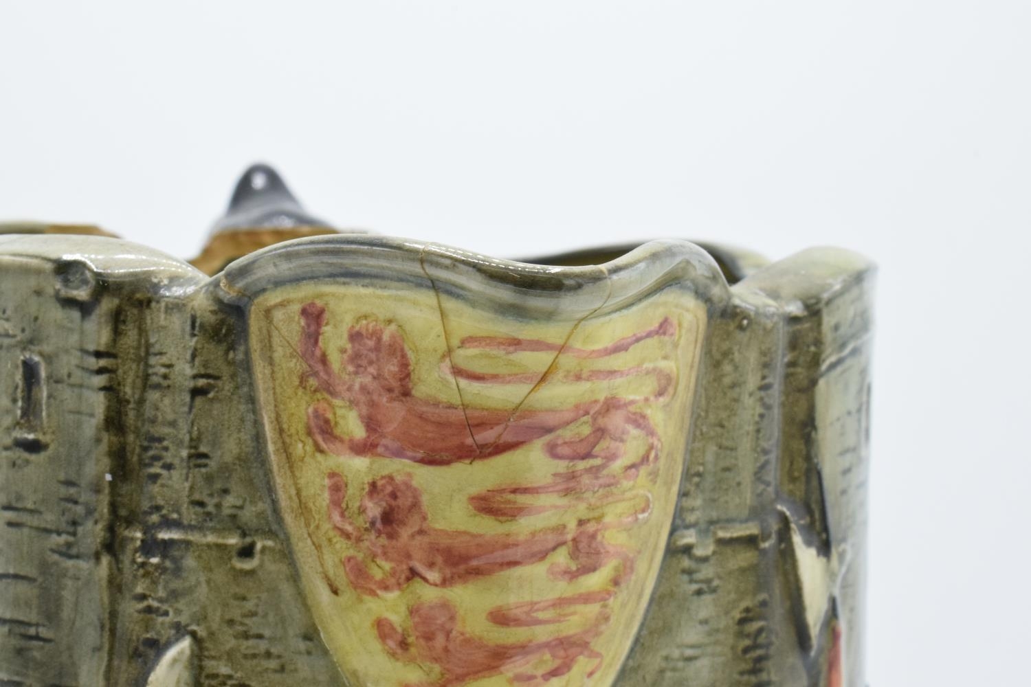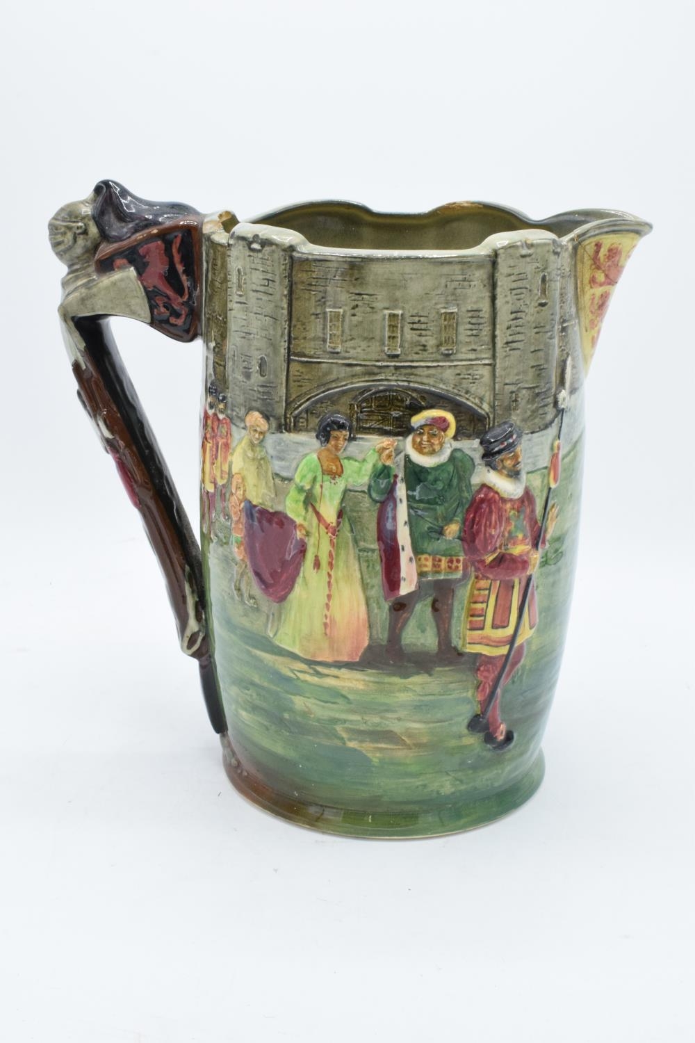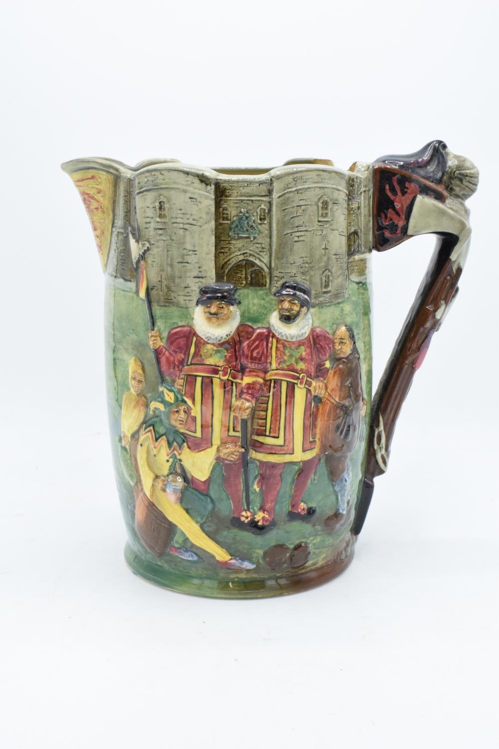 Royal Doulton embossed jug 'The Tower of London' jug 'It keeps Solemn Watch and Ward' with certificate. Number 319 of 500. 25cm tall It displays well however has suffered various damage during its life. The spout has been reglued whilst the top of the handle on the inside rim has been damaged/ chipped. There are a couple of other smalls chips as well as hairlines down the side and a star crack to the base.