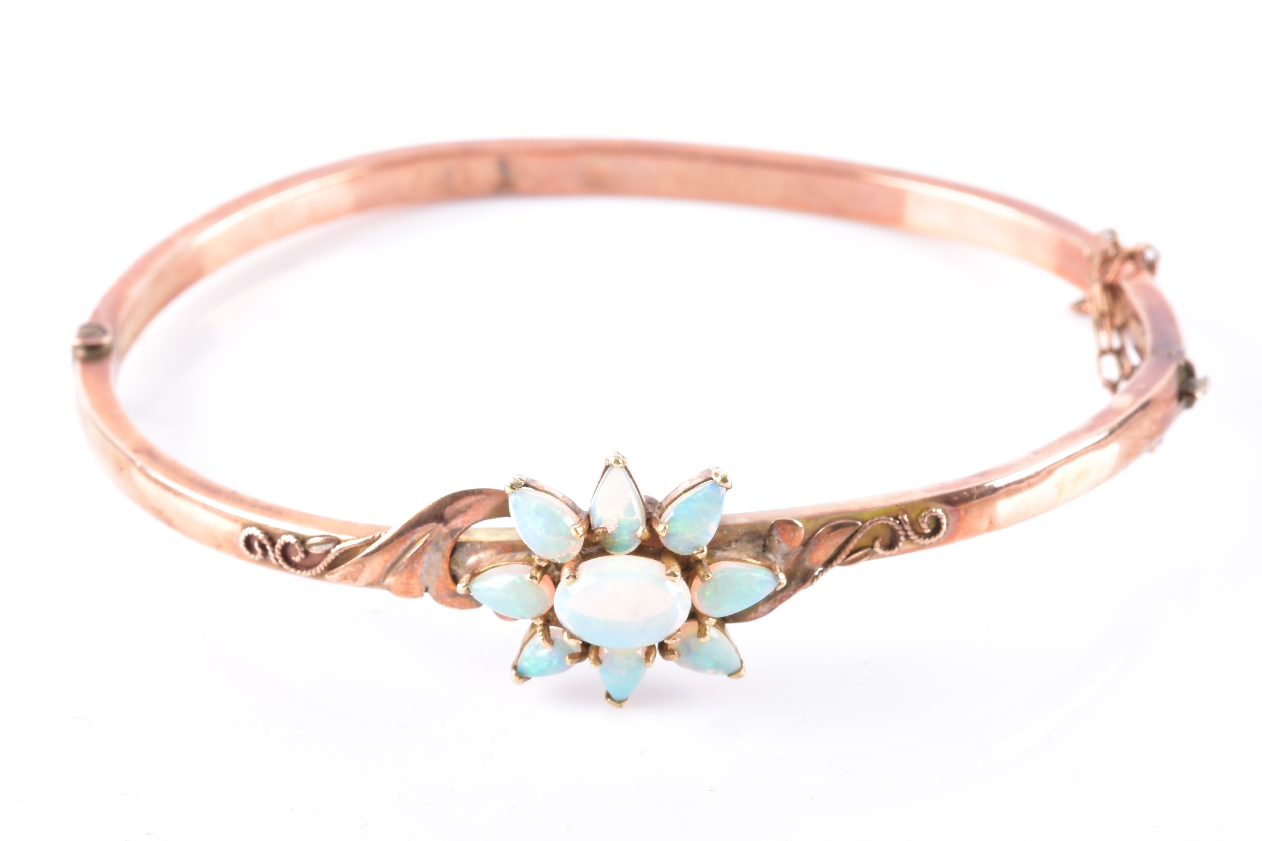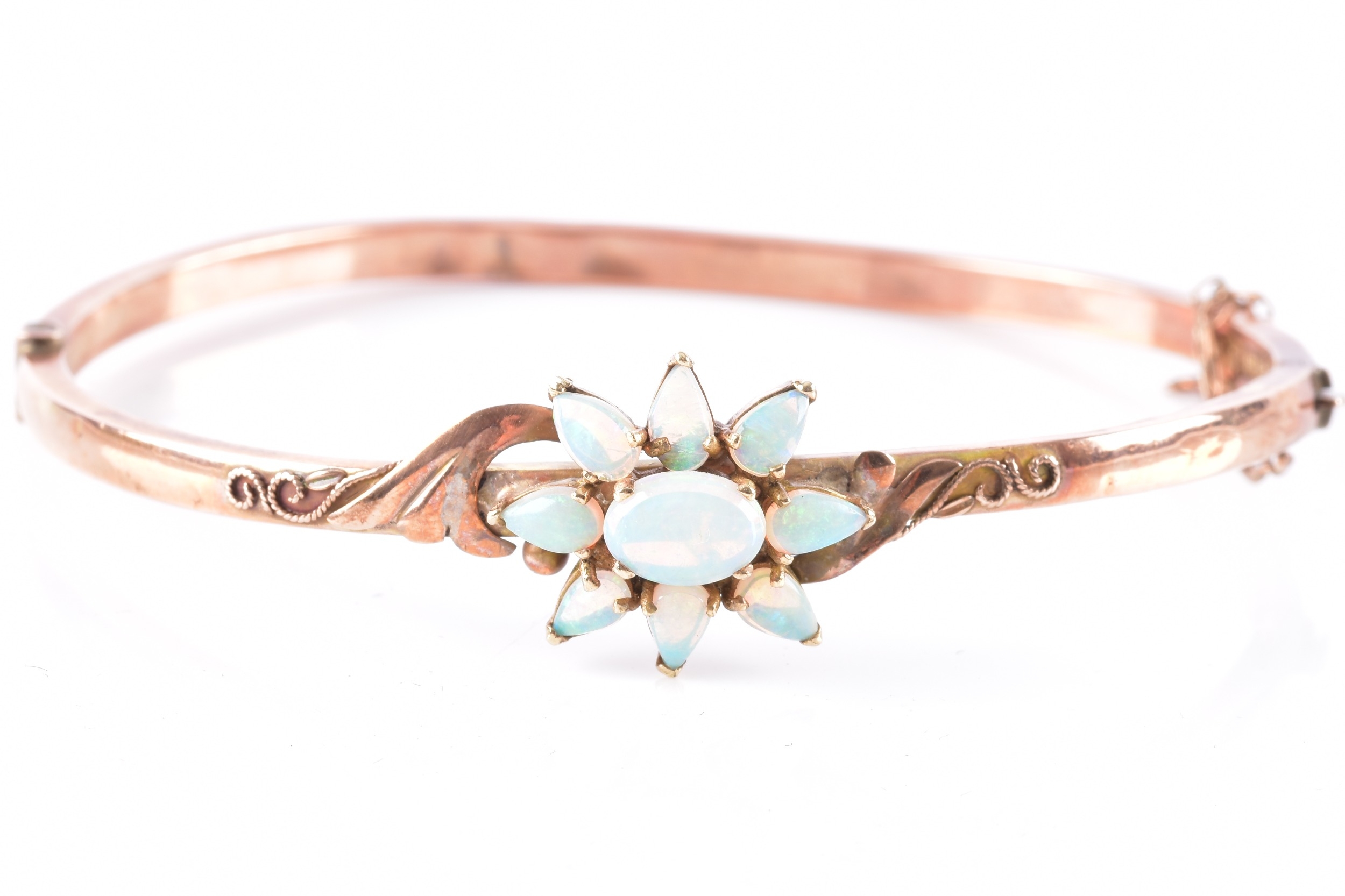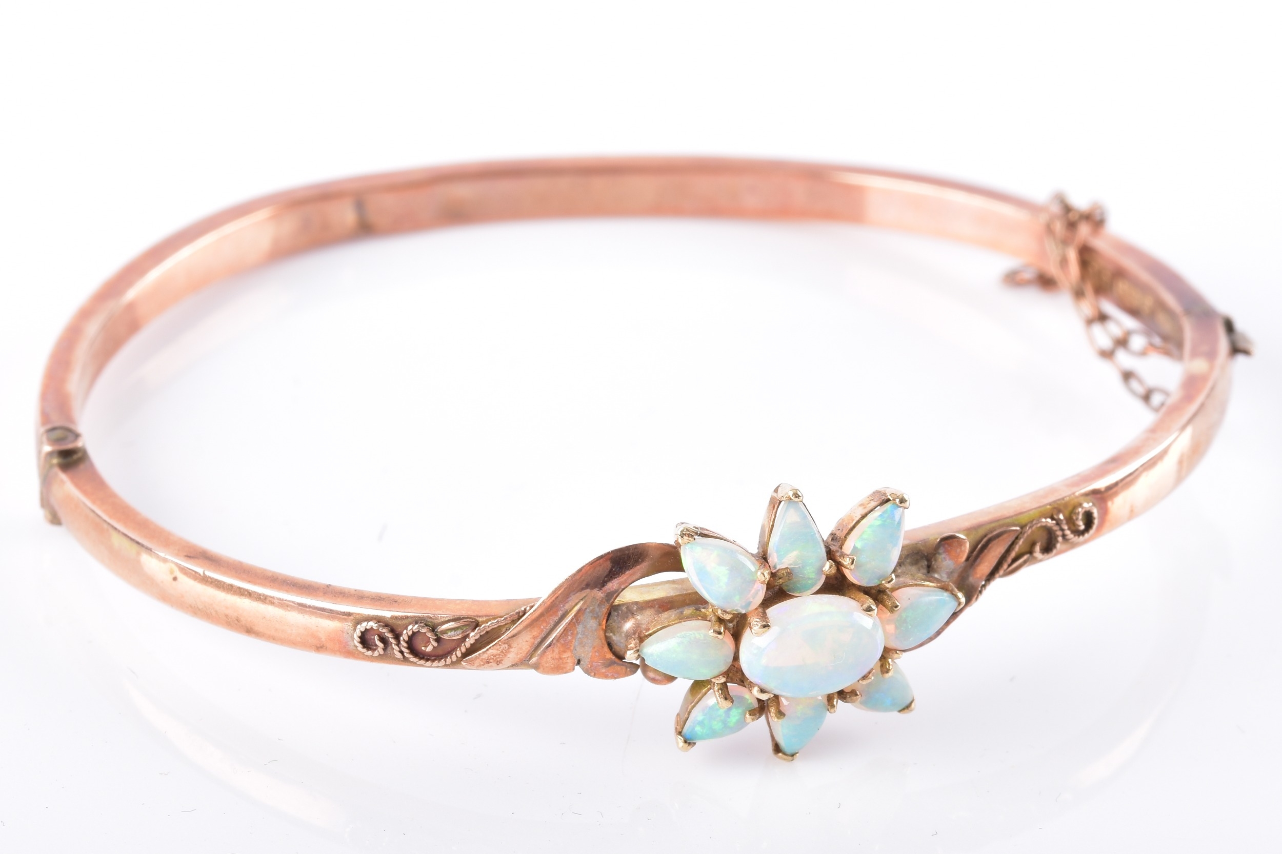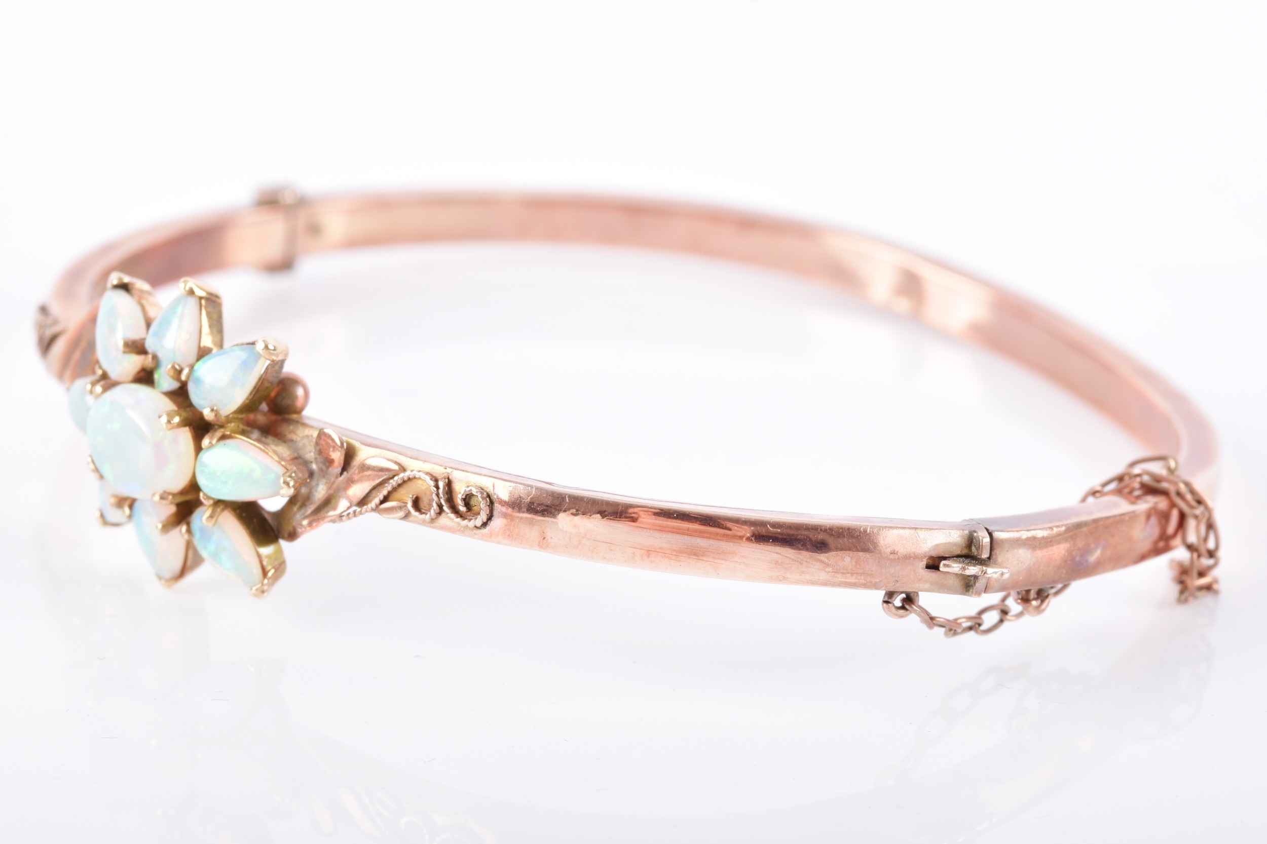 An Edwardian 9ct rose gold and opal bangle, hallmarked Birmingham 1902, by John Henry Wynn, with flower head opal cluster to the centre, on a hinged bangle with engraved decoration, hallmarked .375, with safety chain. Internal diameter 58 mm.