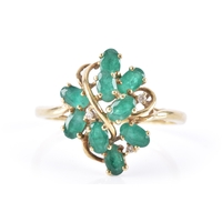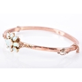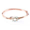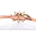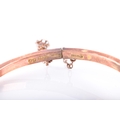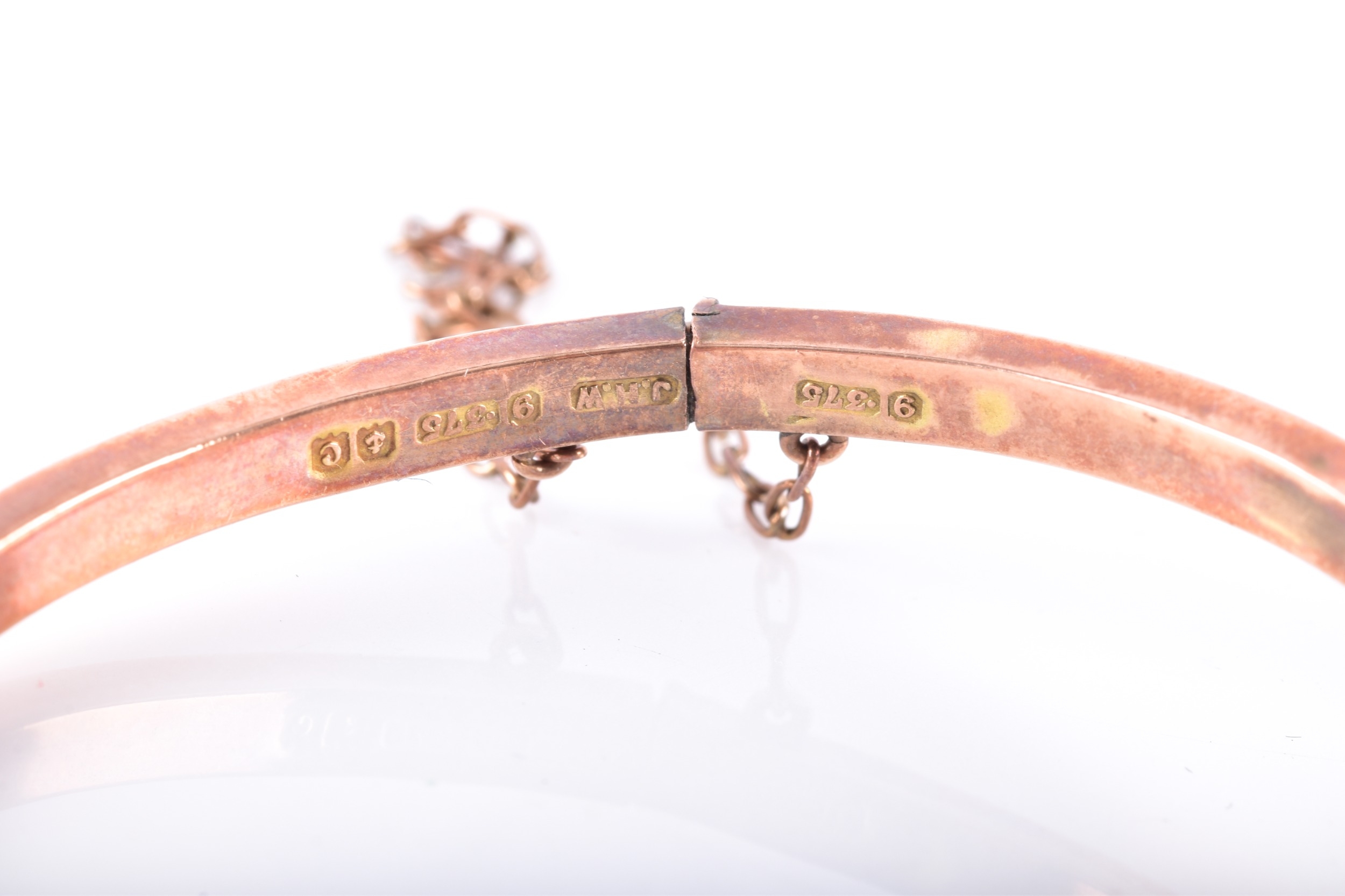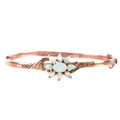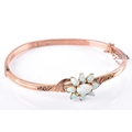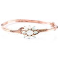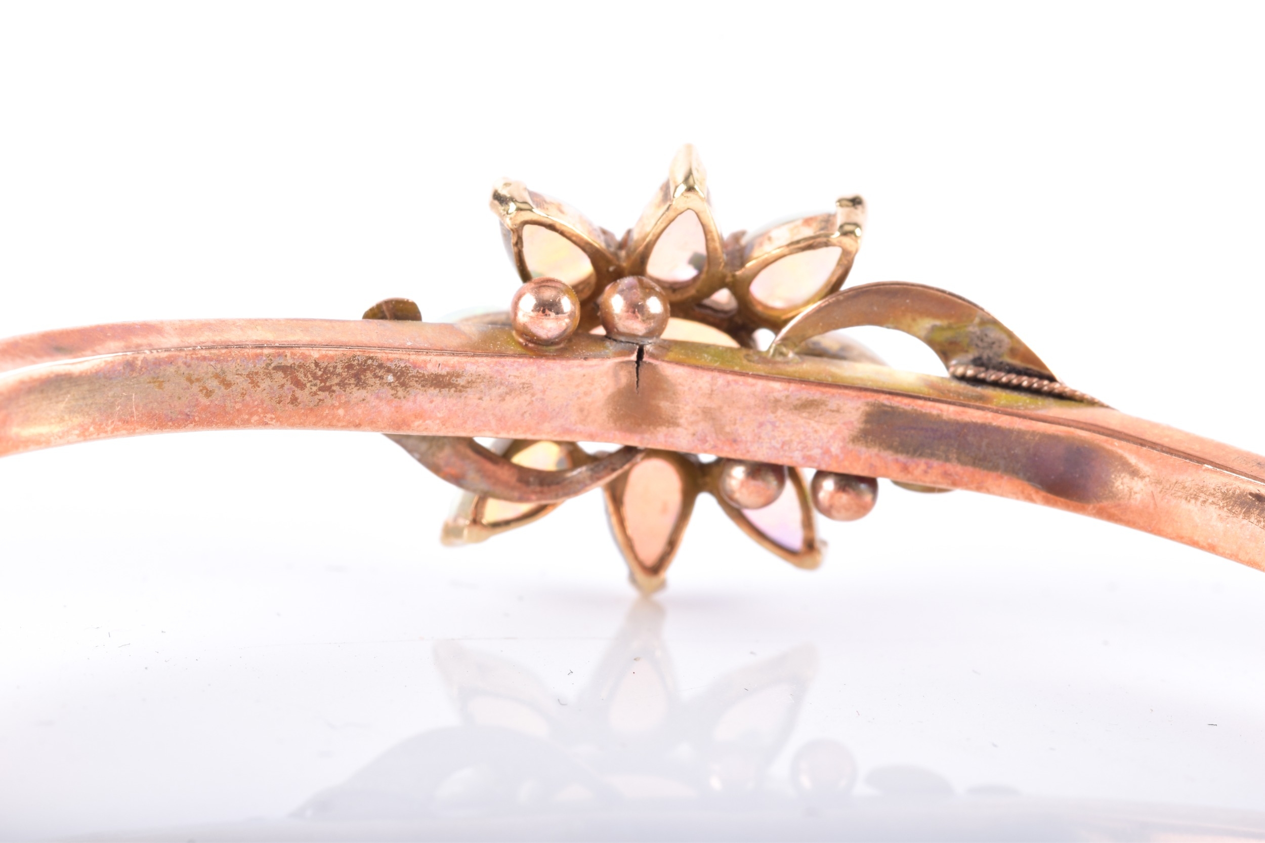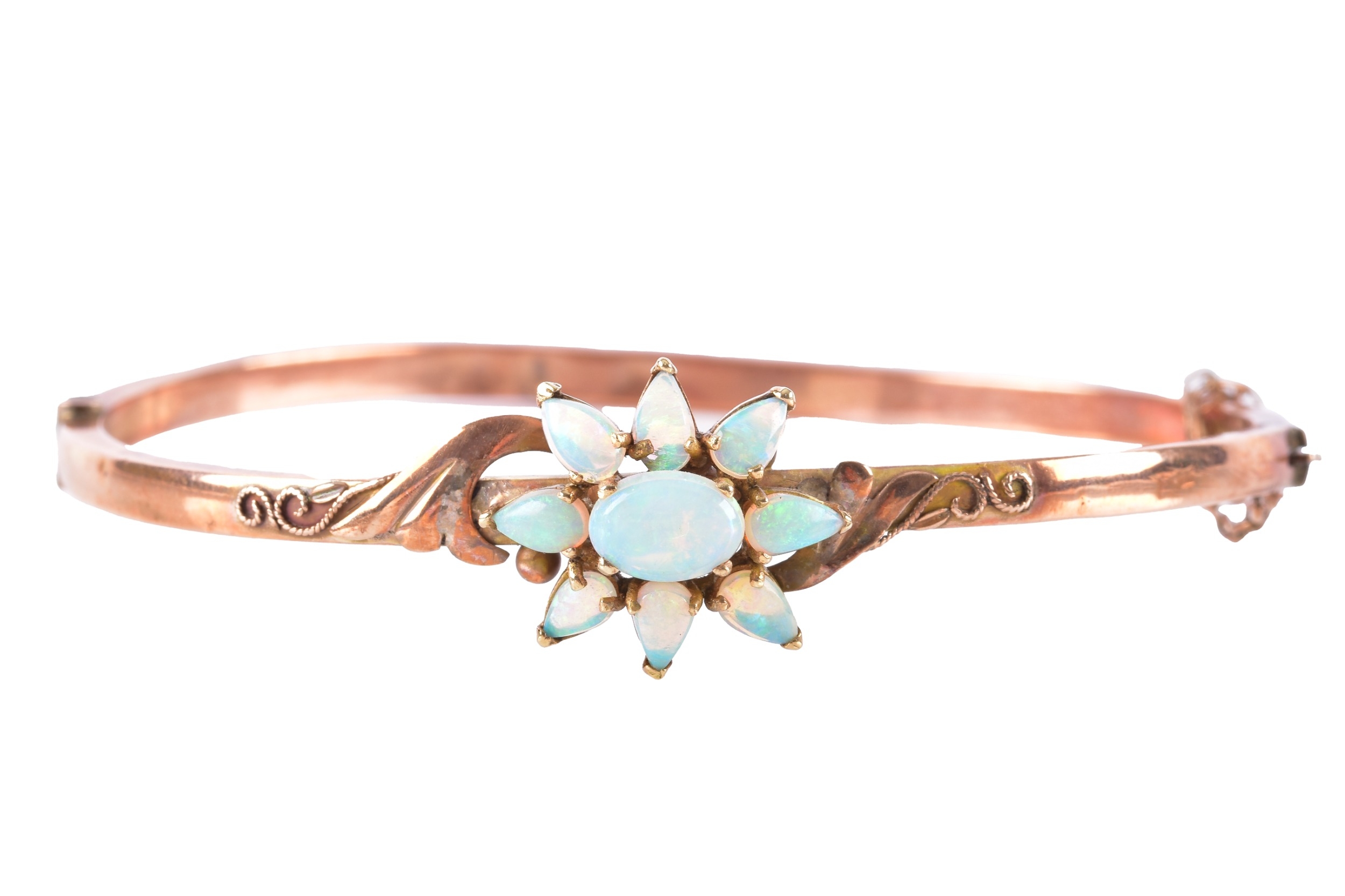 An Edwardian 9ct rose gold and opal bangle, hallmarked Birmingham 1902, by John Henry Wynn, with flower head opal cluster to the centre, on a hinged bangle with engraved decoration, hallmarked .375, with safety chain. Internal diameter 58 mm.