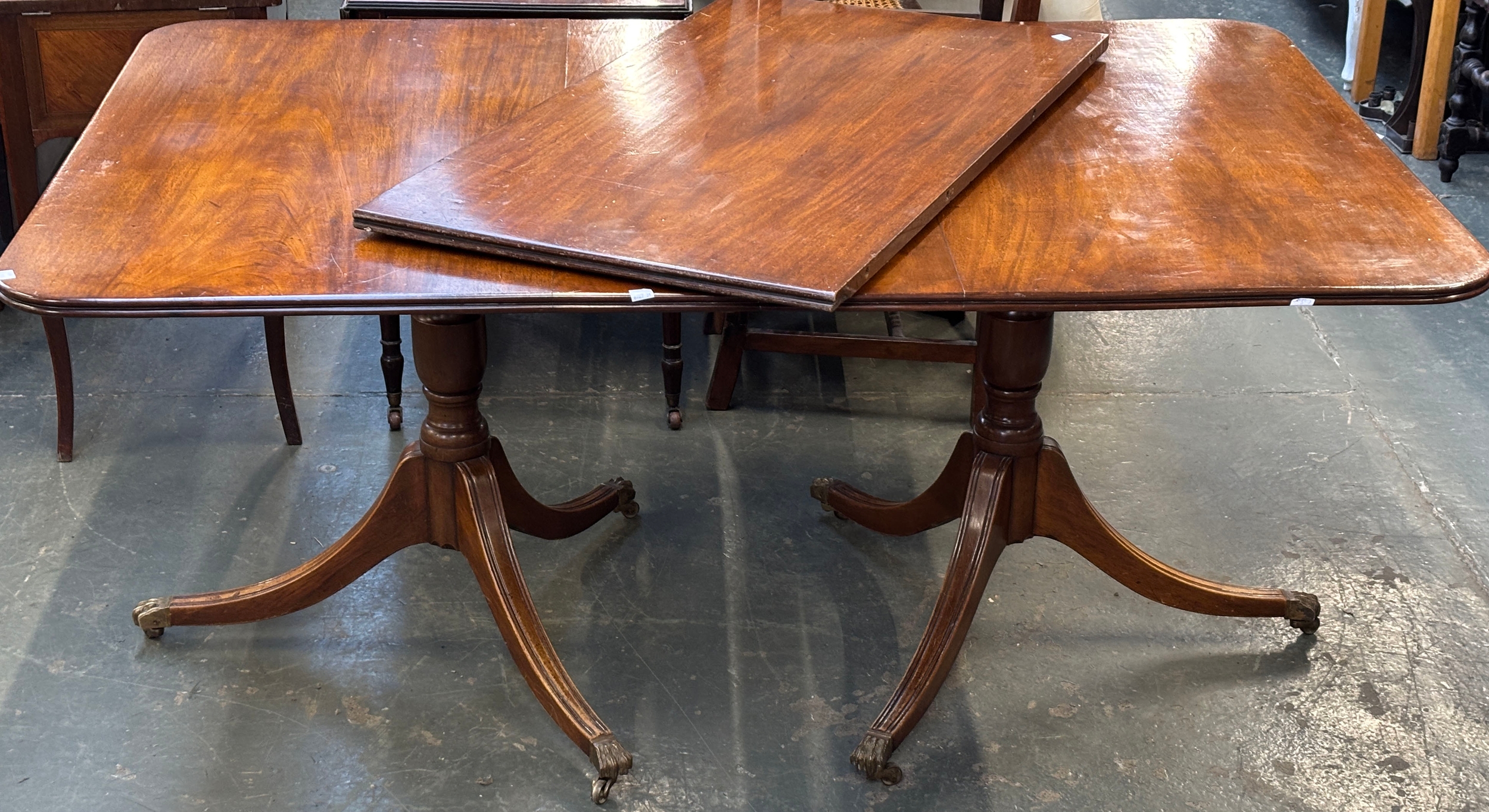 An 18th century and latyer twin pedestal dining table with spare leaf, period top with 20th century bases, 106cmW 73cmH 160cmL when closed, the additional leaf 57cmW