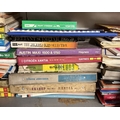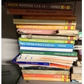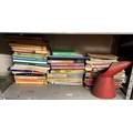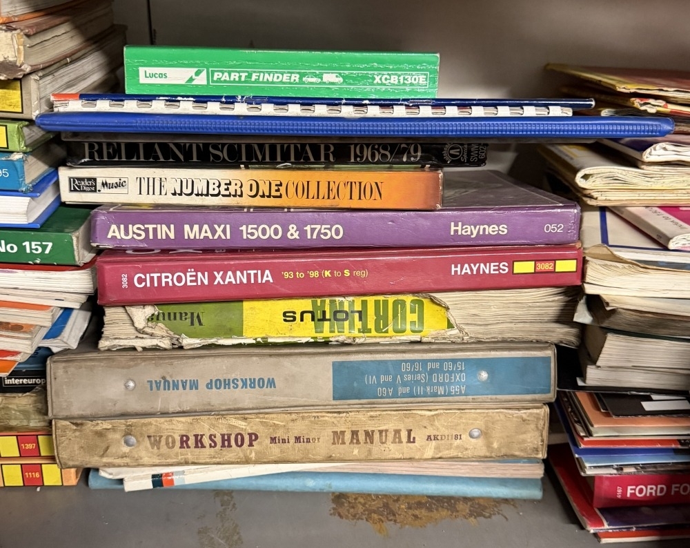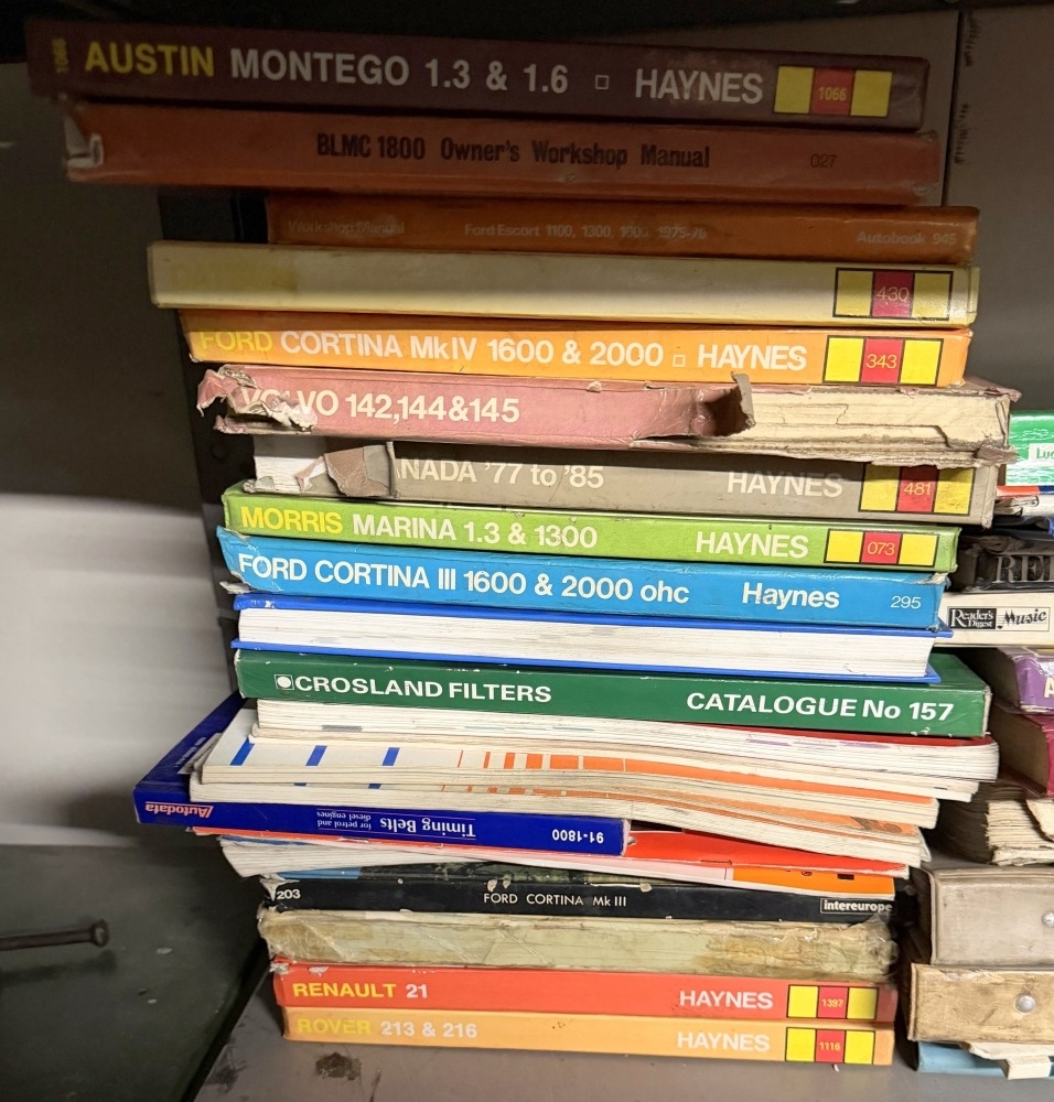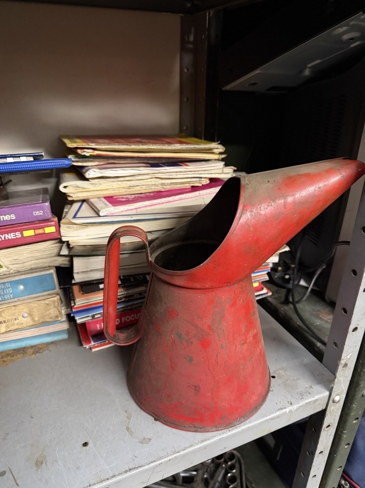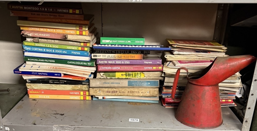 A shelf of Haynes manuals & a large 1960s oil can