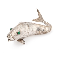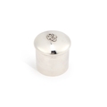 800 standard, the cylindrical jar with a domed pull-off cover centred by an applied monogram. 8cm high, 4.9 troy ounces