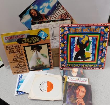 Box of Reggae LP singles, box set and CD's incl. Bob Marley, Lee Scratch Perry, Third World, Dekker etc.